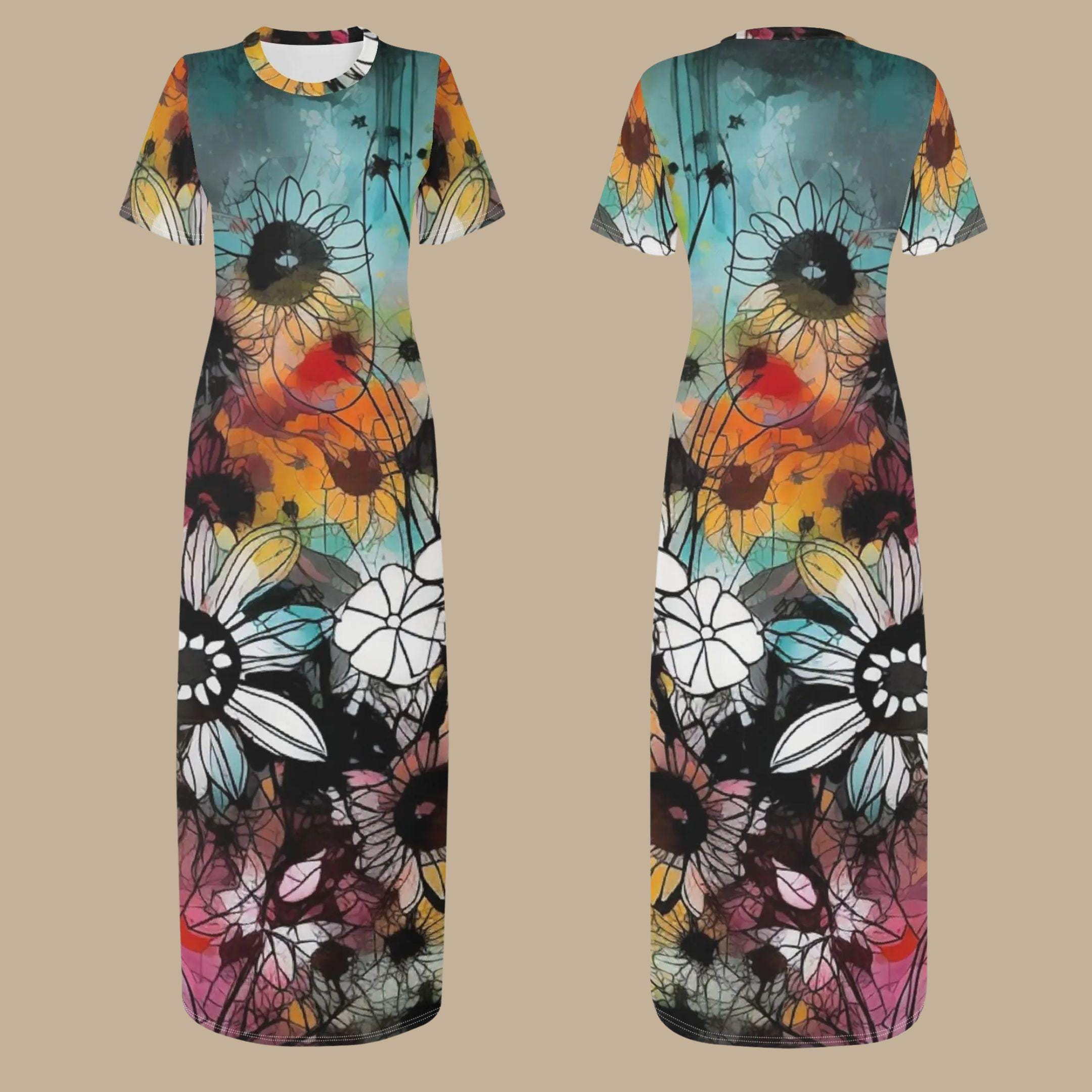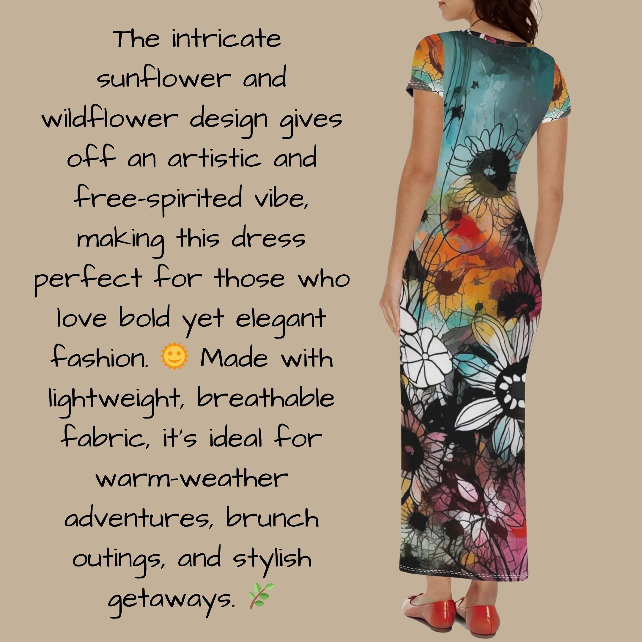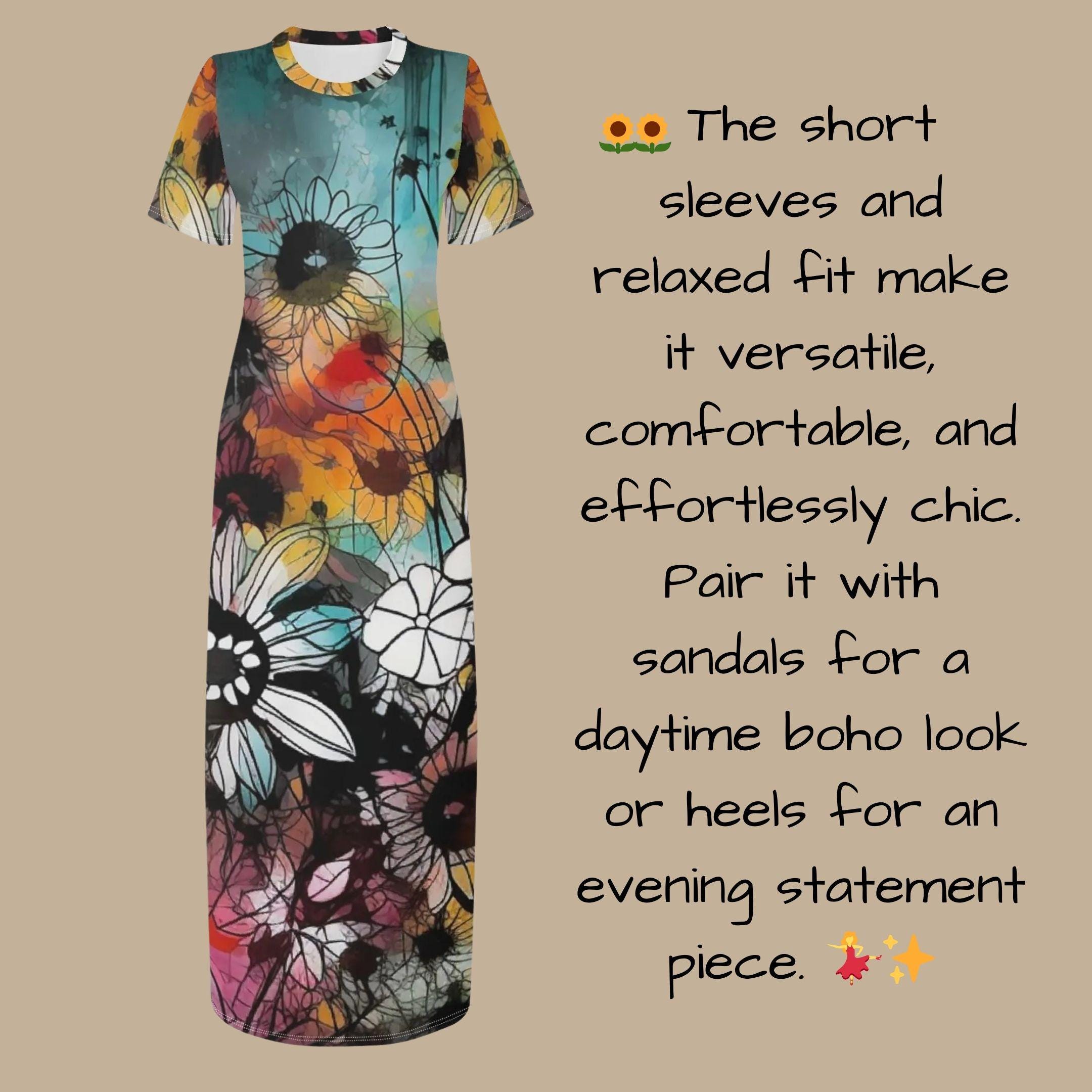 π» A floral fantasy brought to life! This boho-inspired maxi t-shirt dress features a stunning abstract floral print with a blend of watercolor blues, oranges, and golden yellows. π¨ The intricate sunflower and wildflower design gives off an artistic and free-spirited vibe, making this dress perfect for those who love bold yet elegant fashion. π Made with lightweight, breathable fabric, itβs ideal for warm-weather adventures, brunch outings, and stylish getaways. πΏ The short sleeves and relaxed fit make it versatile, comfortable, and effortlessly chic. Pair it with sandals for a daytime boho look or heels for an evening statement piece. πβ¨