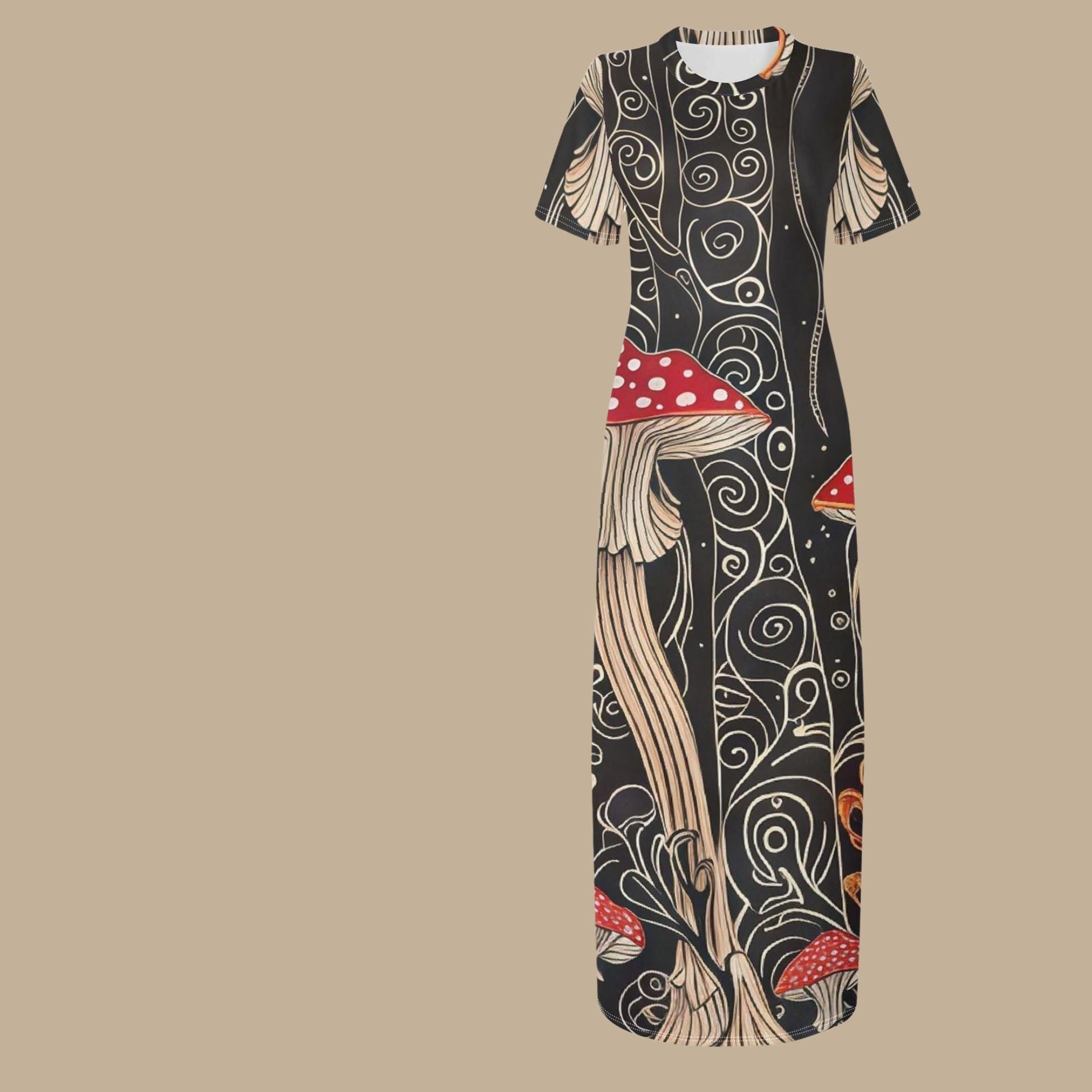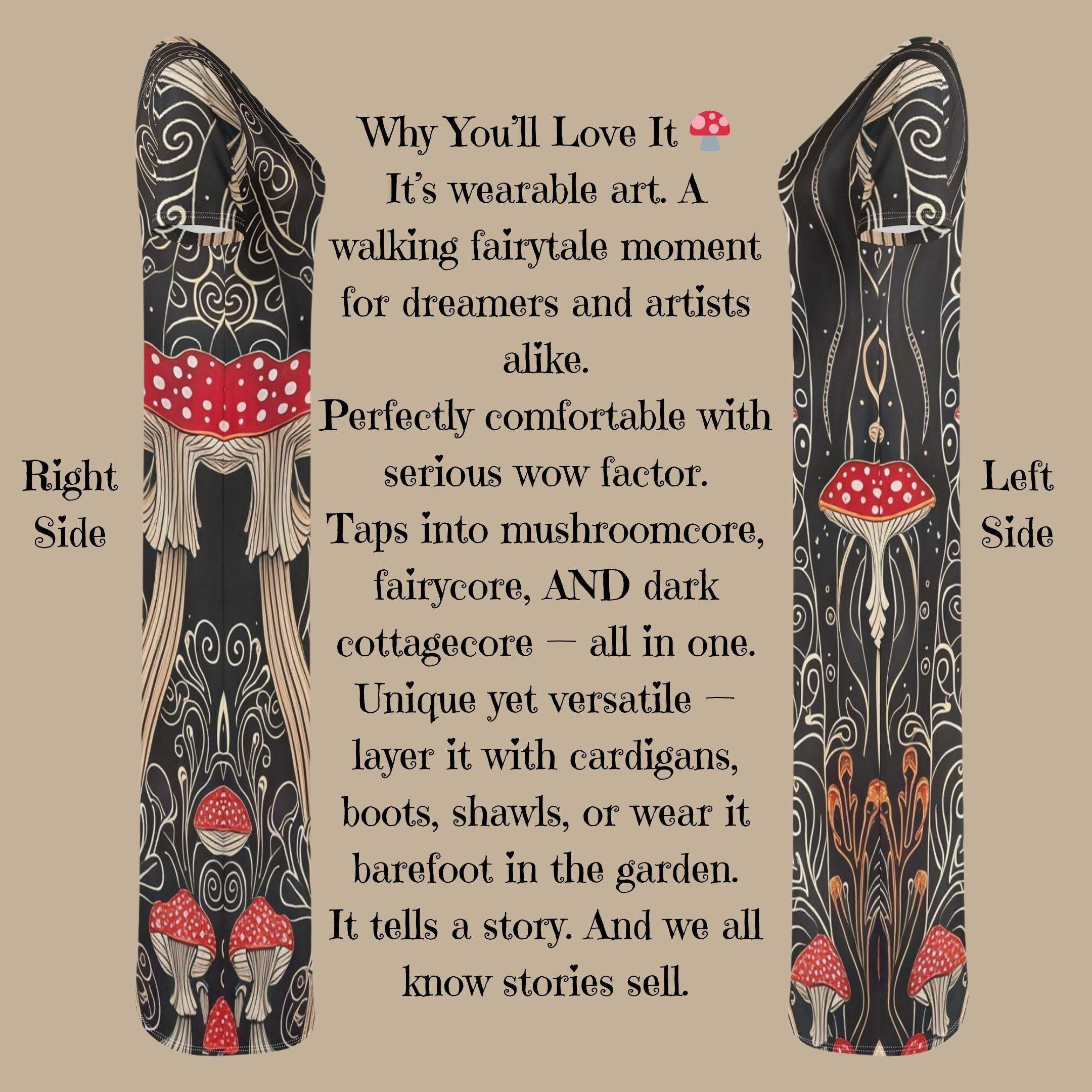 Step into the surreal with Whispering Grove 🍄🌲✨- a spellbinding maxi t-shirt dress inspired by enchanted forests and woodland magic.With deep black as the backdrop and swirling vine patterns dancing around tall mushrooms in crimson and ivory, this piece looks like it wandered straight out of a fairy tale 🧚. The elongated fungi shapes and Art Nouveau-inspired curls create a visual story that's both elegant and mysterious.Cut in a classic t-shirt silhouette with short sleeves and a comfortable ankle-grazing length, this maxi is perfect for everything from moonlit strolls to cozy café hangs. 🌒☕Wear it barefoot in the woods, or style it with chunky boots, a velvet shawl, and layers of charm necklaces for an unforgettable look.🖤 Ultra-soft fabric🖤 Rich print detail that doesn't fade🖤 Perfect for fantasy lovers, artists, and wanderersWhy You'll Love It 🍄It's wearable art. A walking fairytale moment for dreamers and artists alike.Perfectly comfortable with serious wow factor.Taps into mushroomcore, fairycore, AND dark cottagecore - all in one.Unique yet versatile - layer it with cardigans, boots, shawls, or wear it barefoot in the garden.It tells a story. And we all know stories sell.