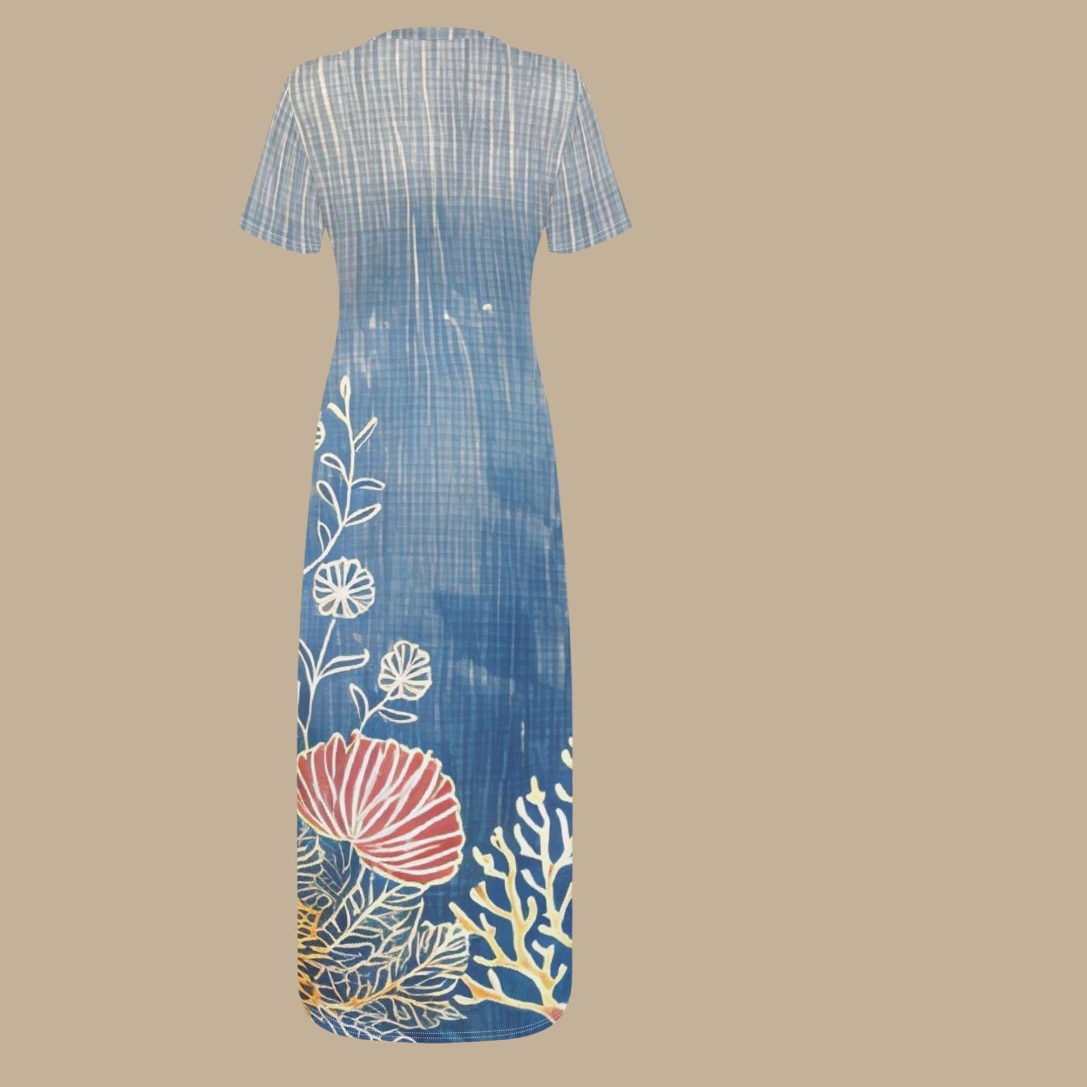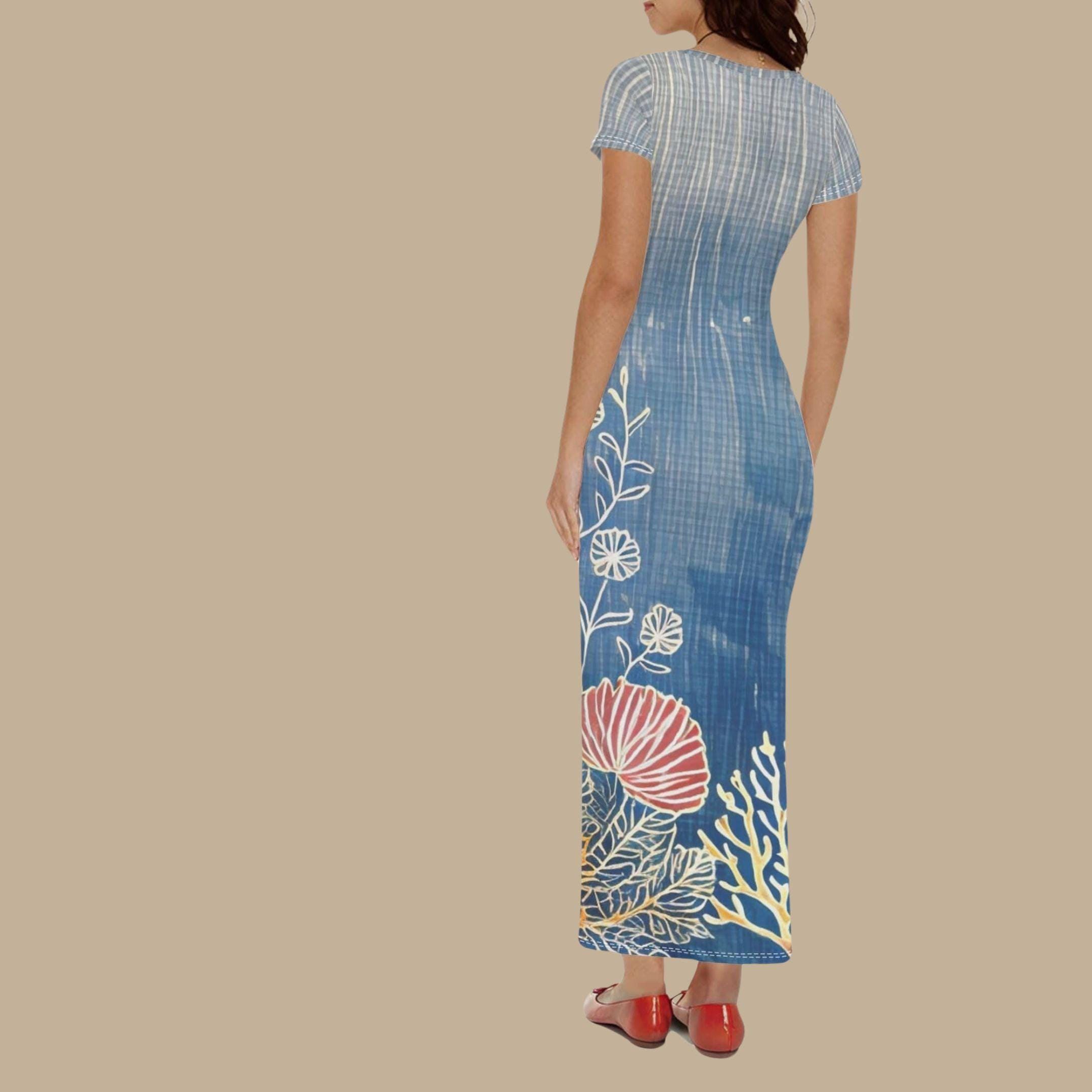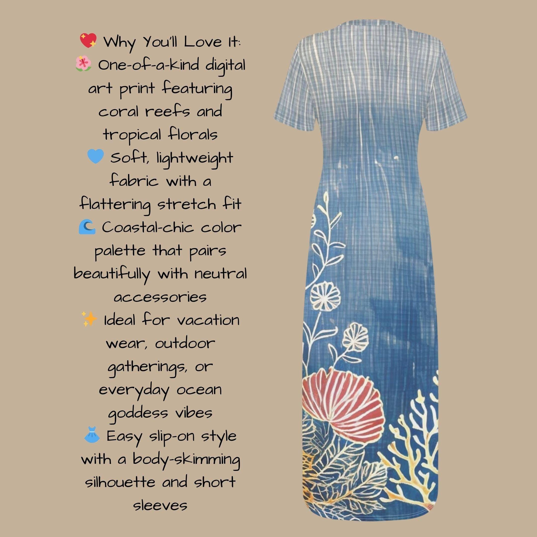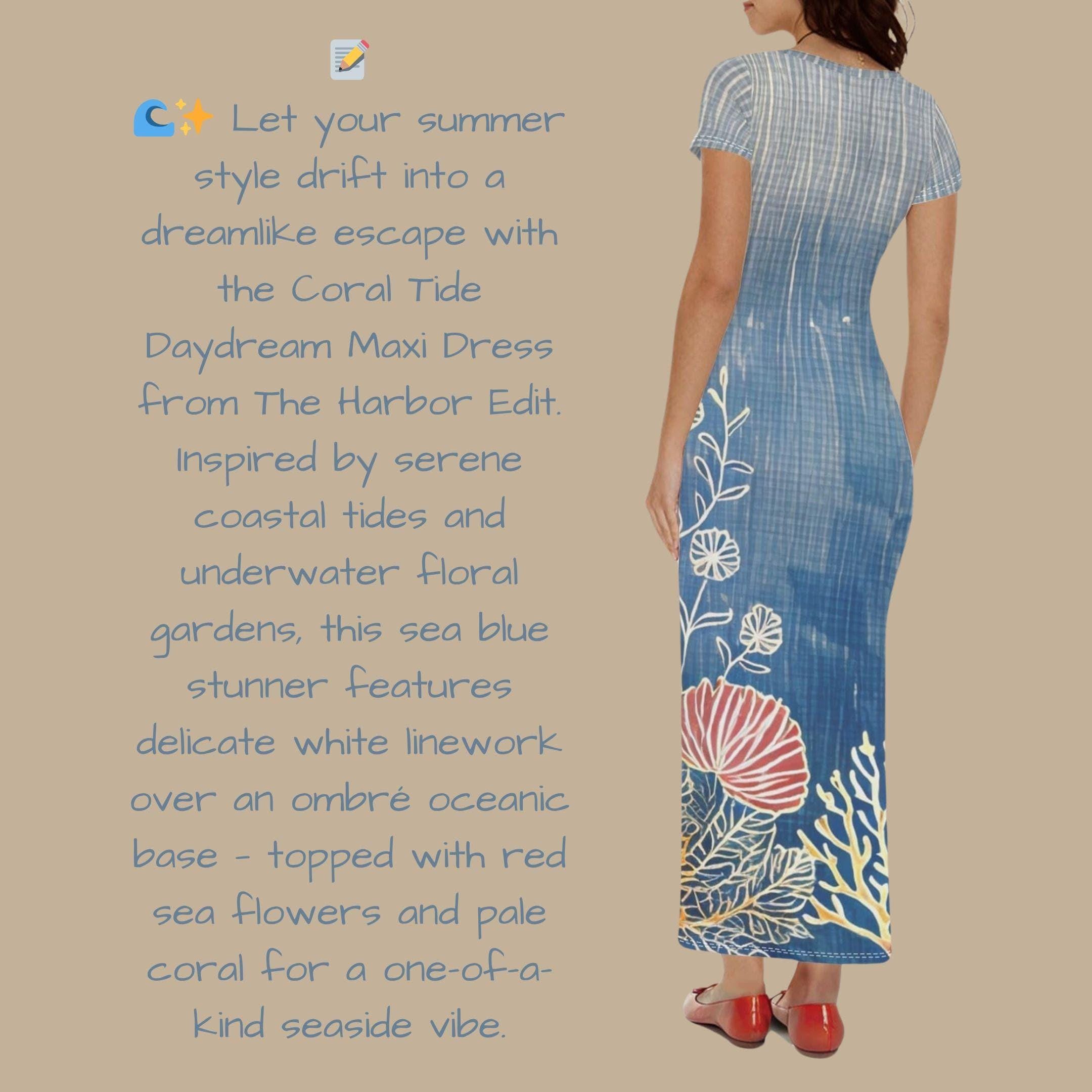 🌊✨ Let your summer style drift into a dreamlike escape with the Coral Tide Daydream Maxi Dress from The Harbor Edit. Inspired by serene coastal tides and underwater floral gardens, this sea blue stunner features delicate white linework over an ombré oceanic base - topped with red sea flowers and pale coral for a one-of-a-kind seaside vibe. With its soft short sleeves and curve-loving bodycon cut, this dress is the ultimate go-to for warm weather wanderlust, beachside brunches, or simply living your best sun-kissed life. 🌞🌿 💖 Why You'll Love It: 🌺 One-of-a-kind digital art print featuring coral reefs and tropical florals 💙 Soft, lightweight fabric with a flattering stretch fit 🌊 Coastal-chic color palette that pairs beautifully with neutral accessories ✨ Ideal for vacation wear, outdoor gatherings, or everyday ocean goddess vibes 👗 Easy slip-on style with a body-skimming silhouette and short sleeves