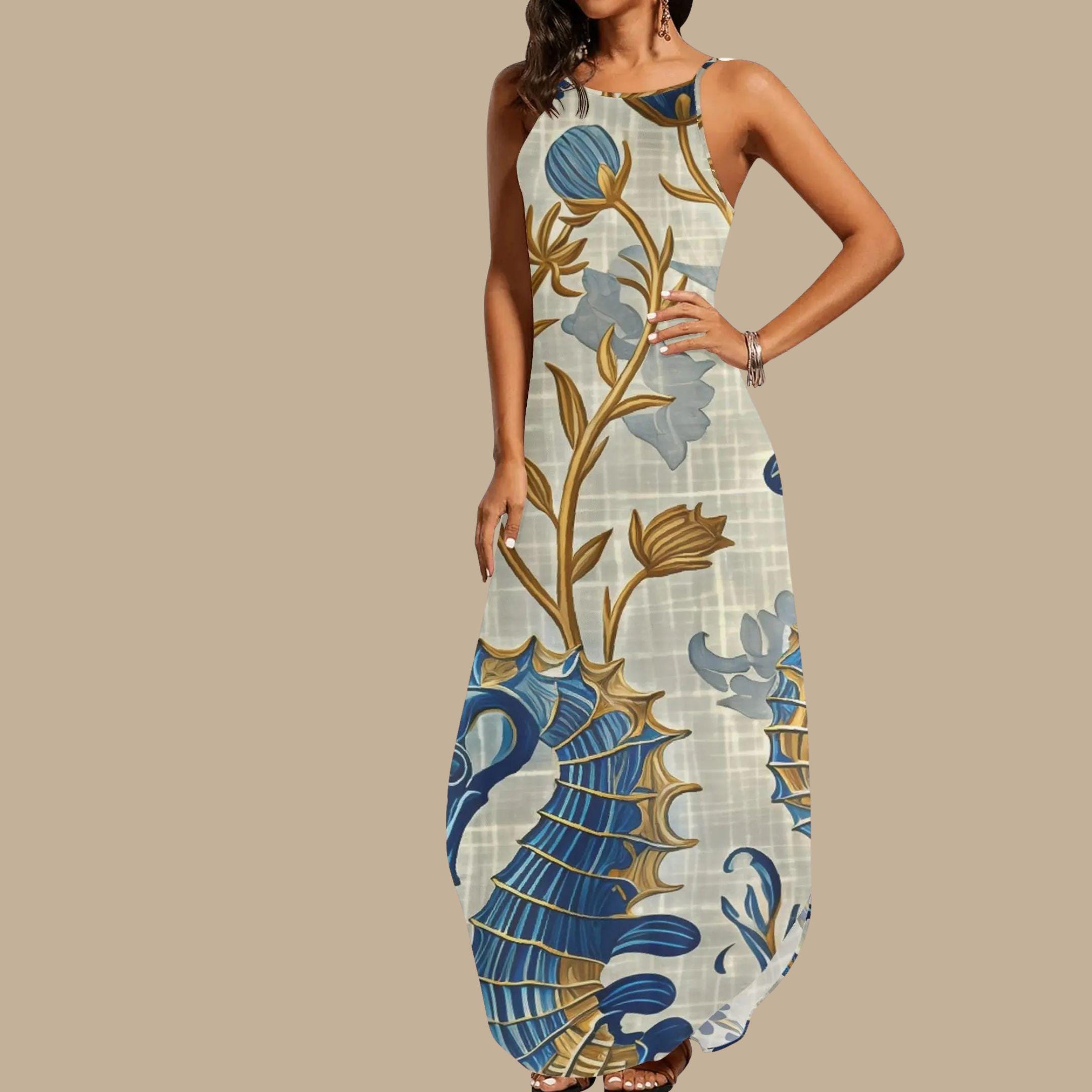 Channel ocean elegance with our Elegant Blue Seahorse & Floral Maxi Dress 🐚✨ This sleeveless stunner features a serene blend of deep blue and golden seahorses paired with delicate floral vines in soothing shades of taupe and cream. Lightweight, breezy, and oh-so-effortless, it’s your go-to piece for coastal getaways, seaside strolls, and sunset soirees.