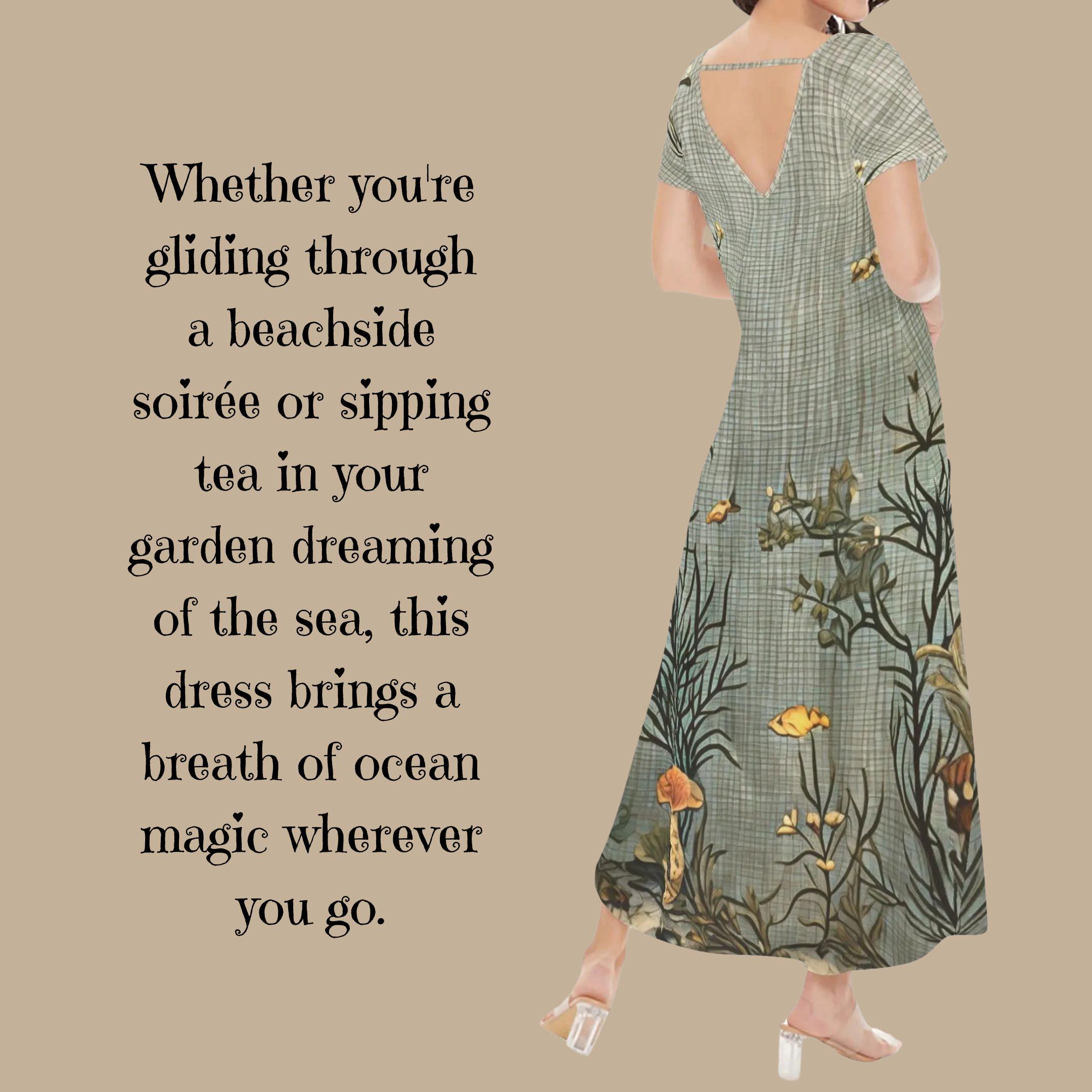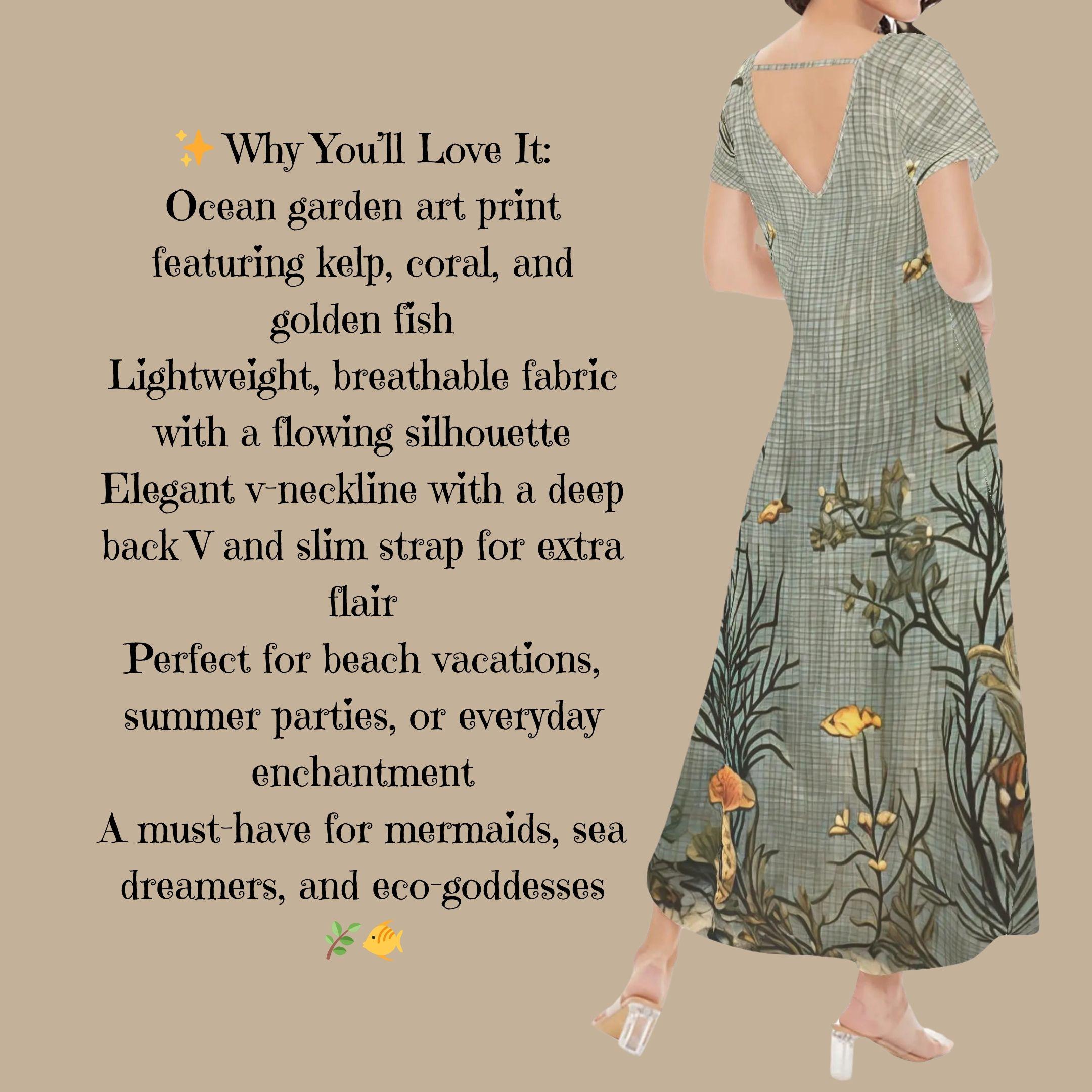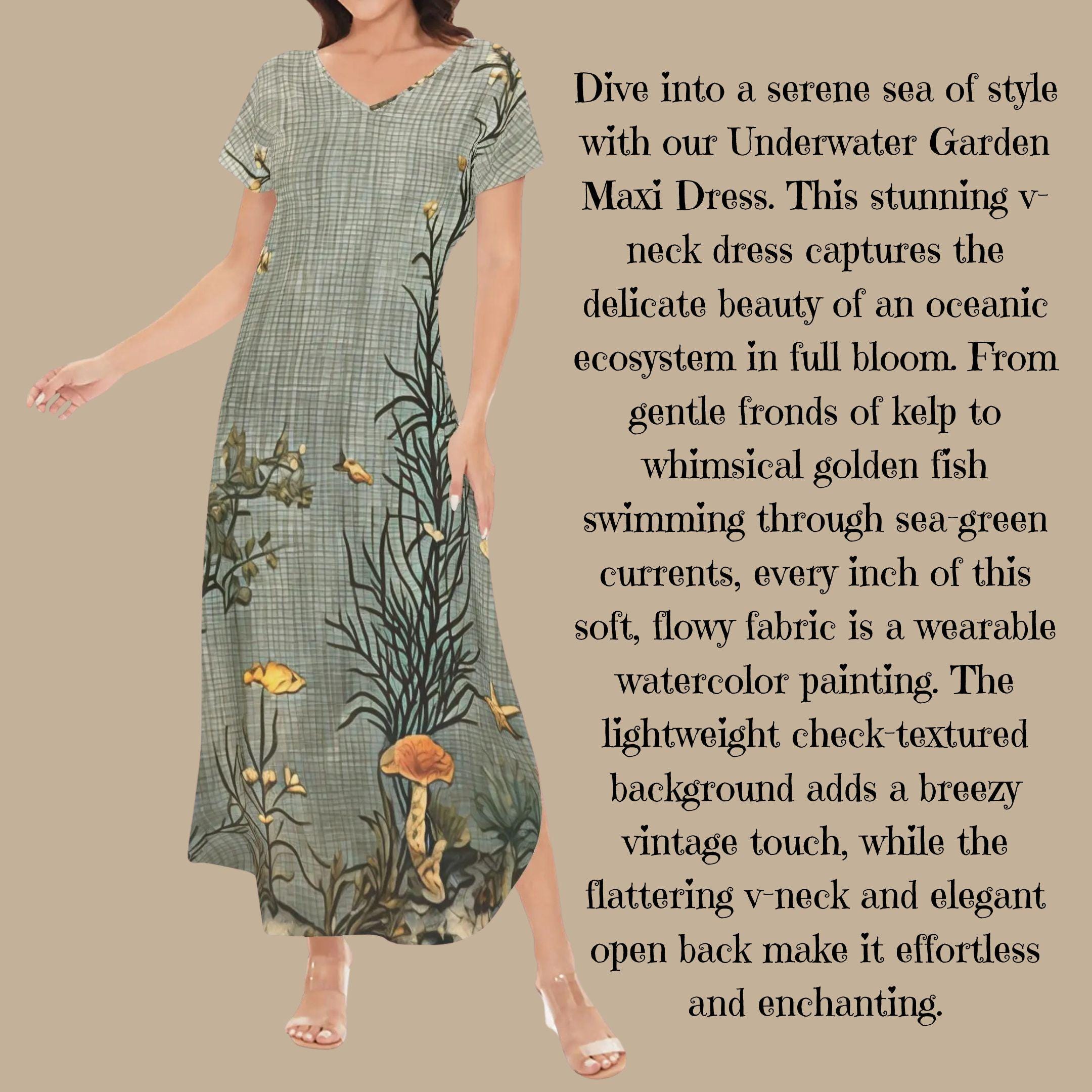 Dive into a serene sea of style with our Underwater Garden Maxi Dress. This dreamy v-neck dress is a wearable watercolor painting, capturing the poetic beauty of a thriving ocean garden. Delicate golden fish swim through sea-green fronds of kelp, mushrooms sprout near coral-like plants, and every detail evokes nature’s quiet underwater magic.