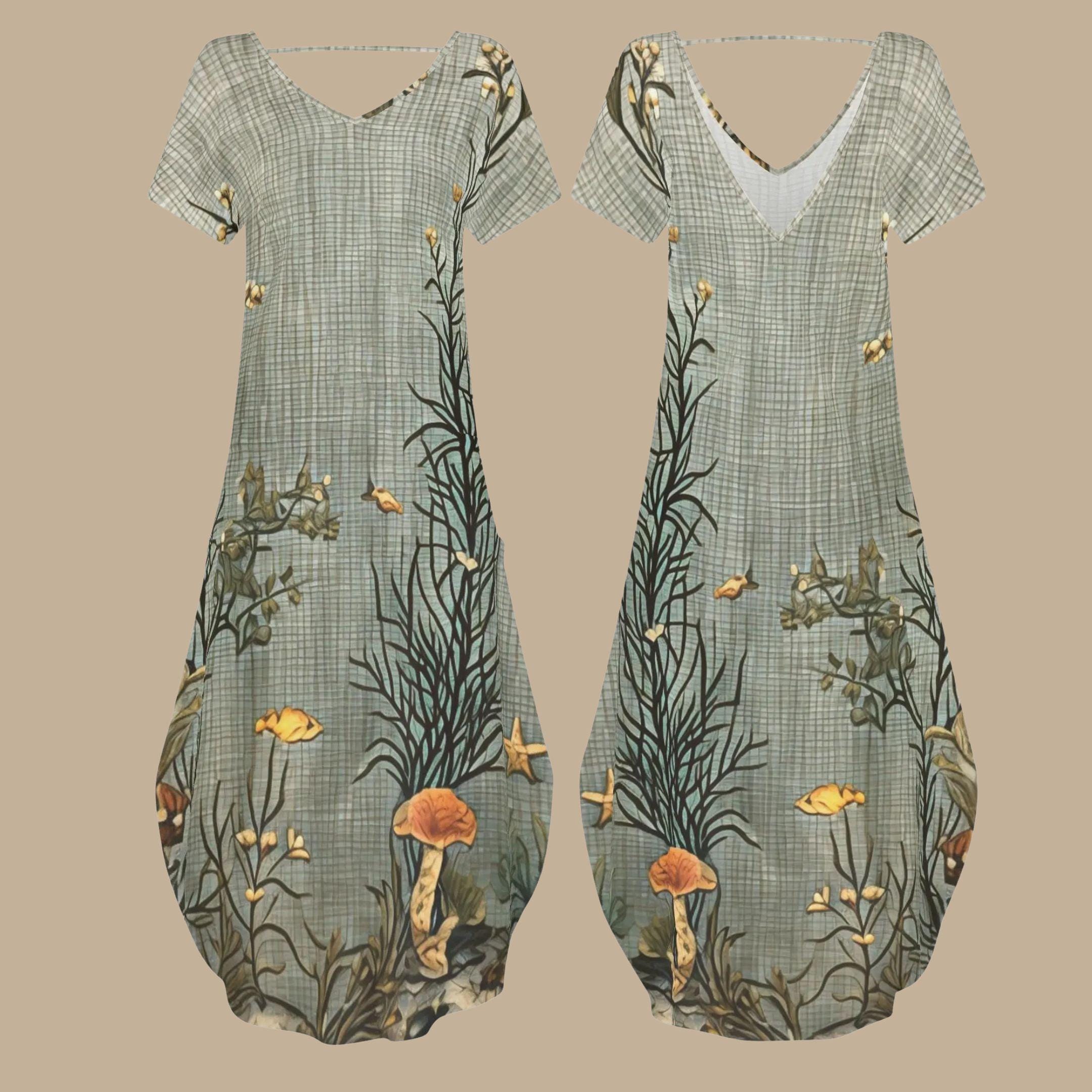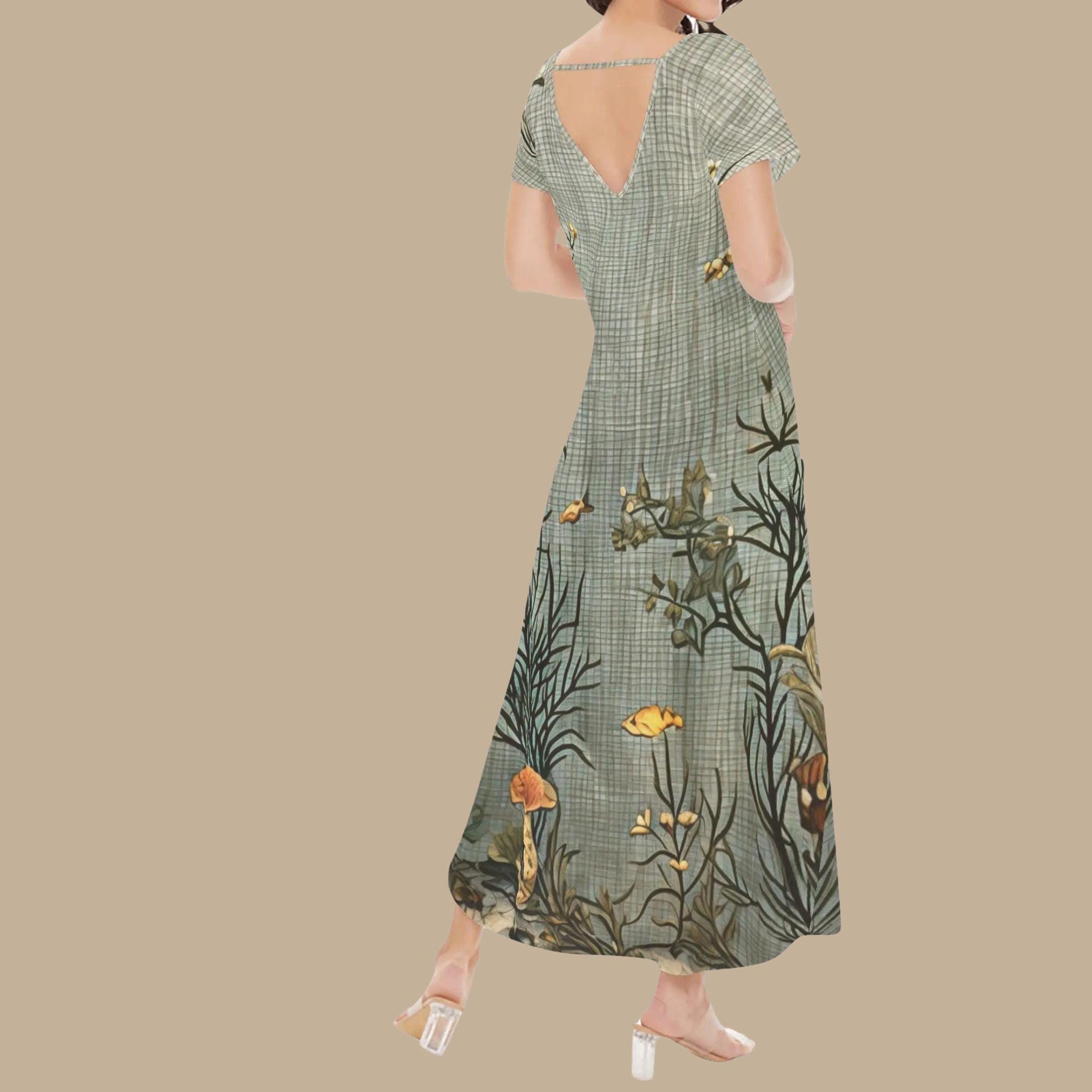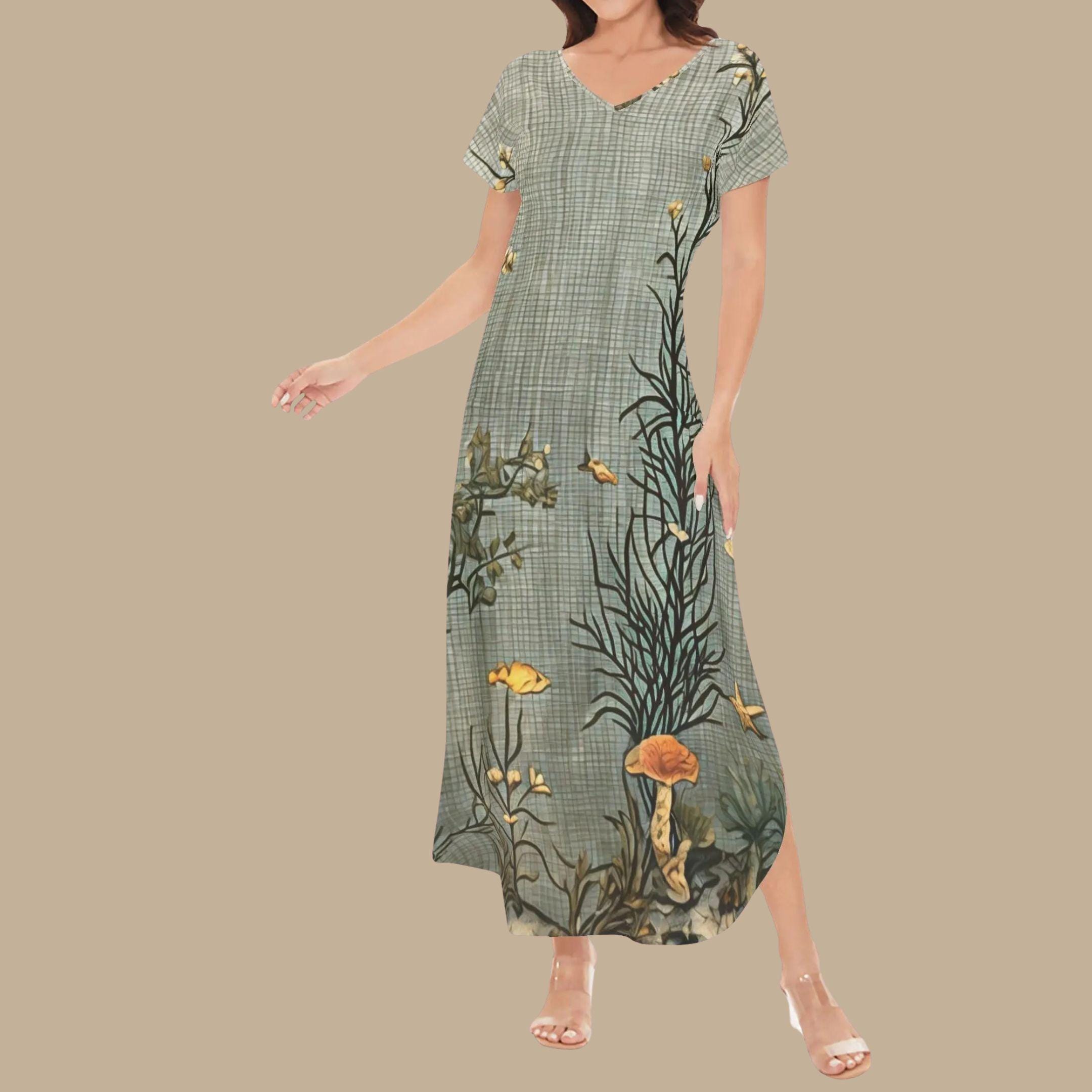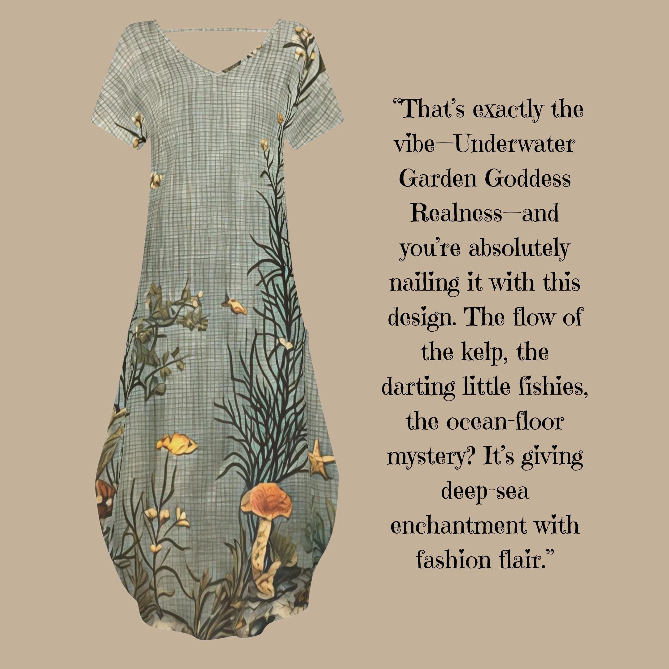 Dive into a serene sea of style with our Underwater Garden Maxi Dress. This dreamy v-neck dress is a wearable watercolor painting, capturing the poetic beauty of a thriving ocean garden. Delicate golden fish swim through sea-green fronds of kelp, mushrooms sprout near coral-like plants, and every detail evokes nature’s quiet underwater magic.