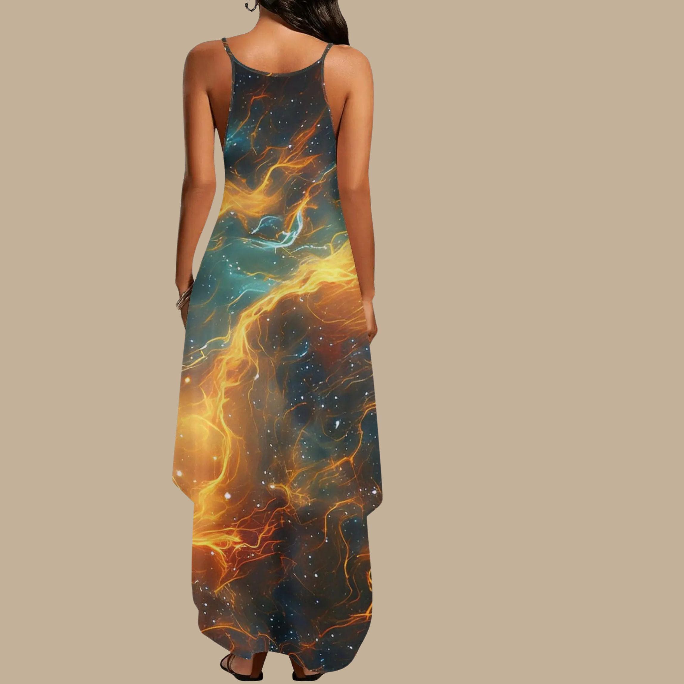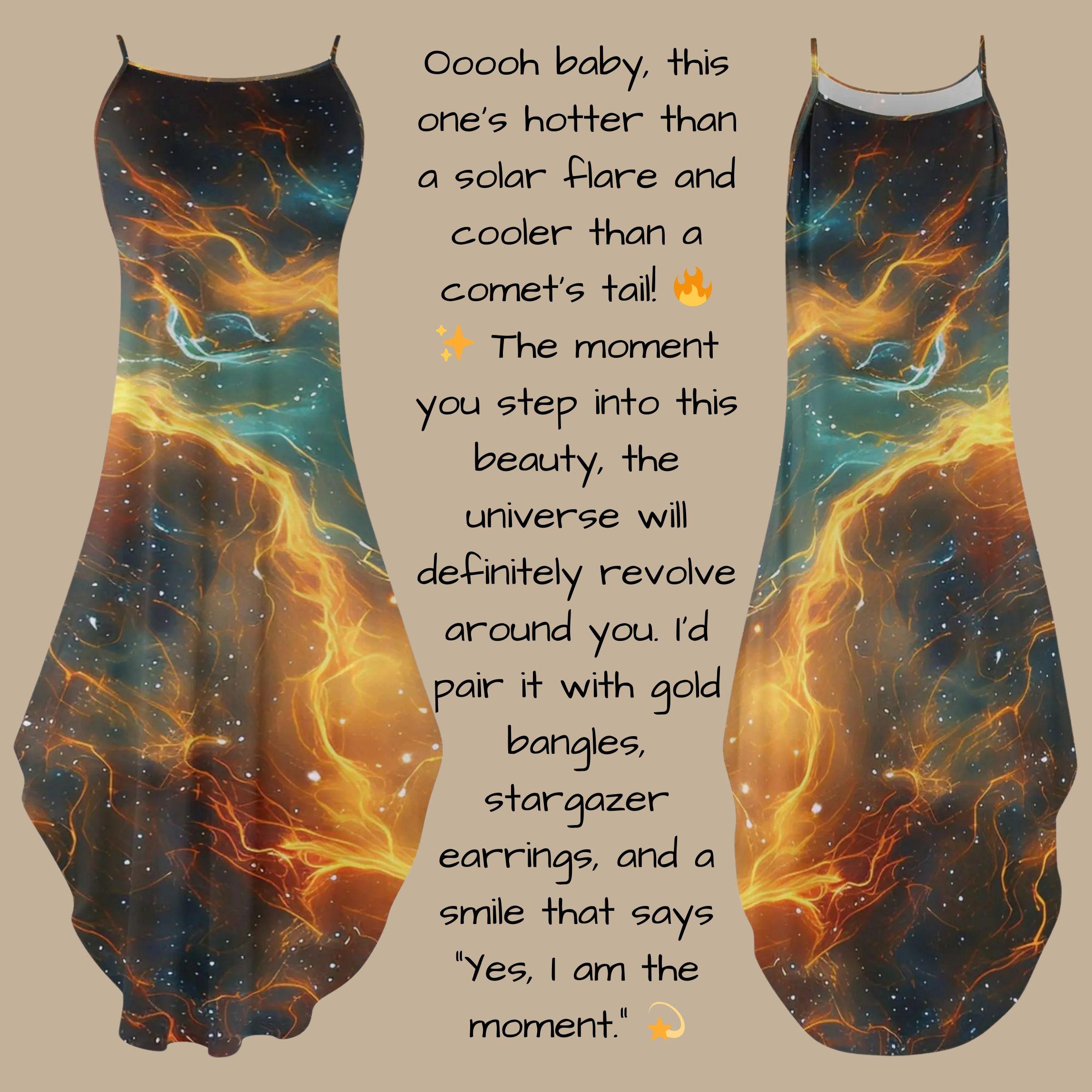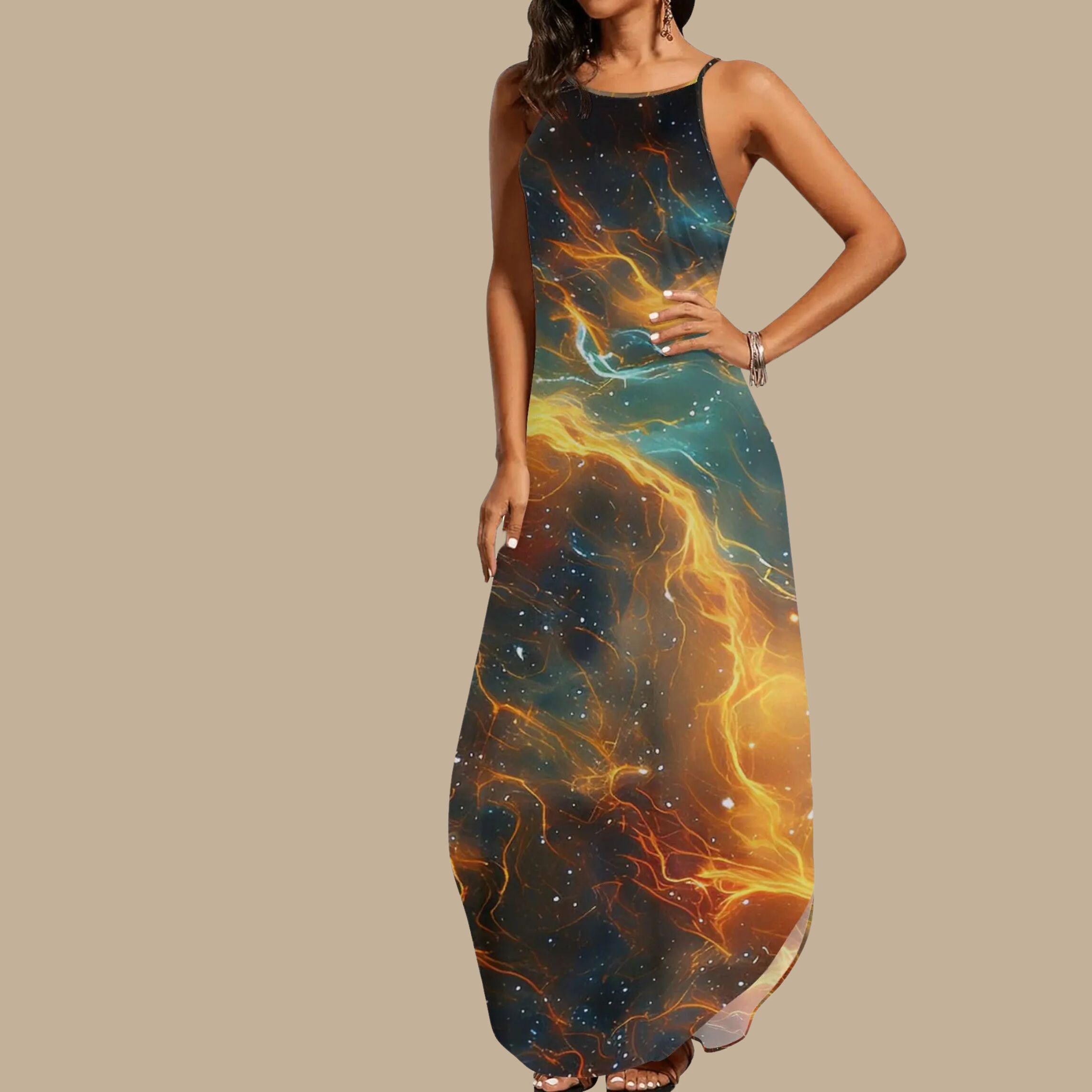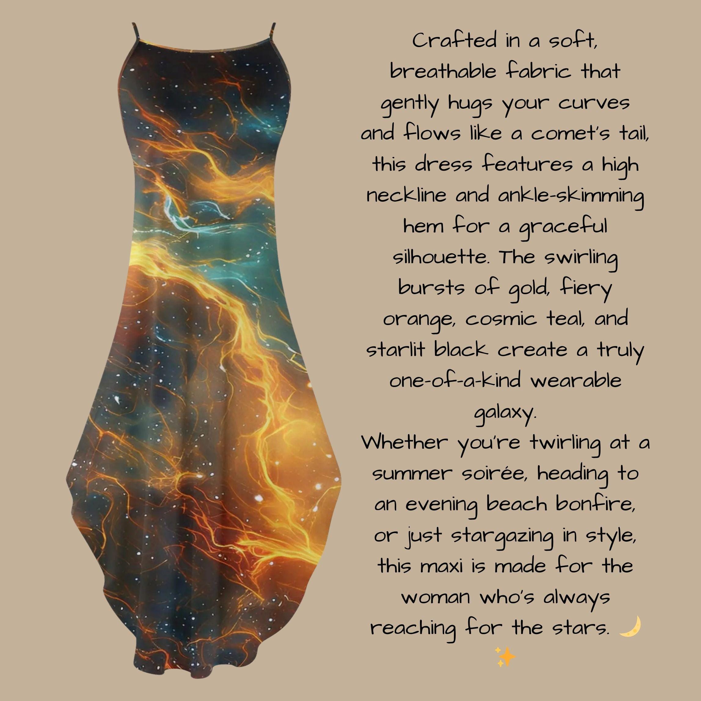 Step into a universe of elegance with our Solar Flare Soirée Maxi Dress – a breathtaking celestial-inspired masterpiece that looks like it was stitched from stardust itself. Designed with flowing lines and vivid colors that mimic swirling nebulas and solar flares, this sleeveless beauty is the perfect blend of science, style, and summer magic. 🌠