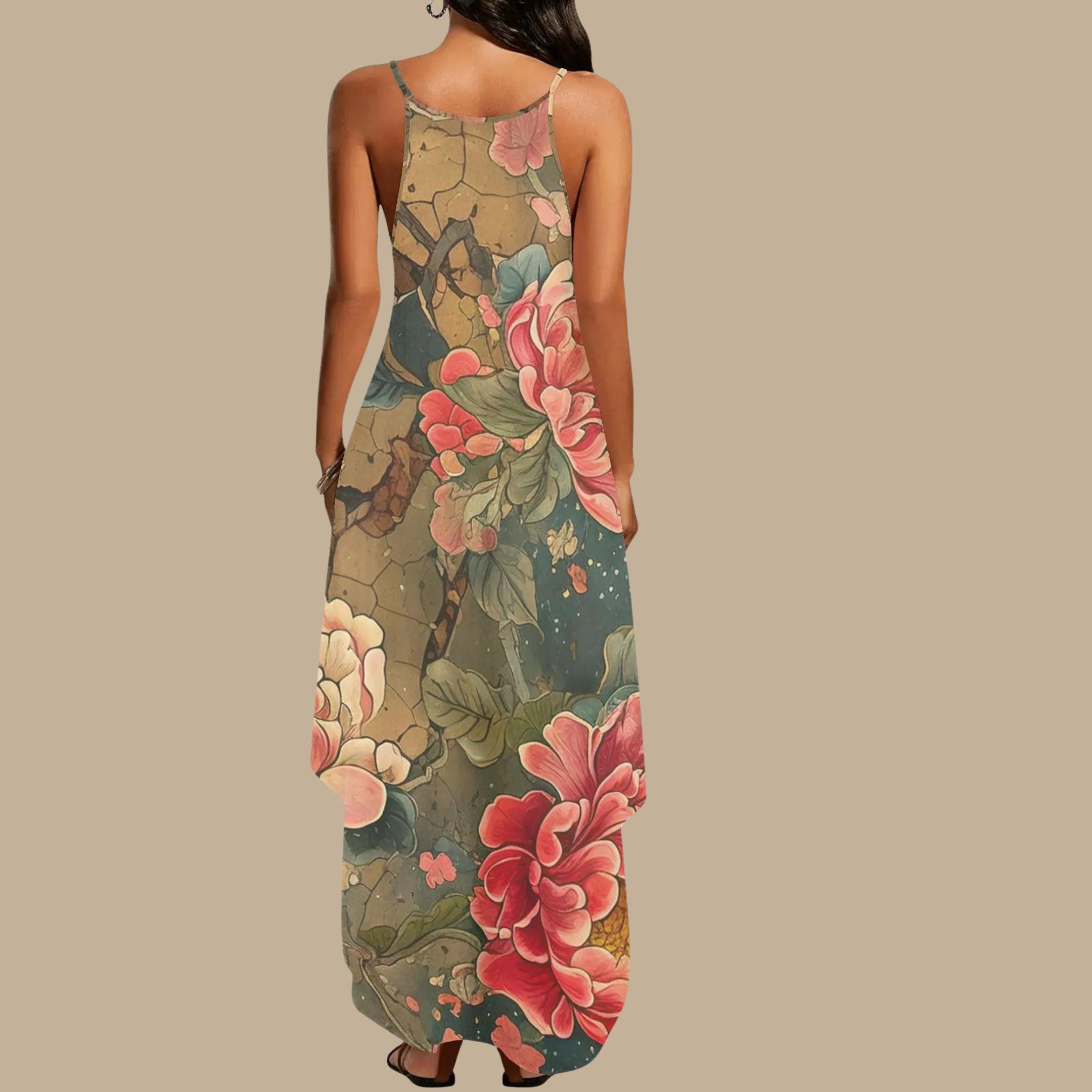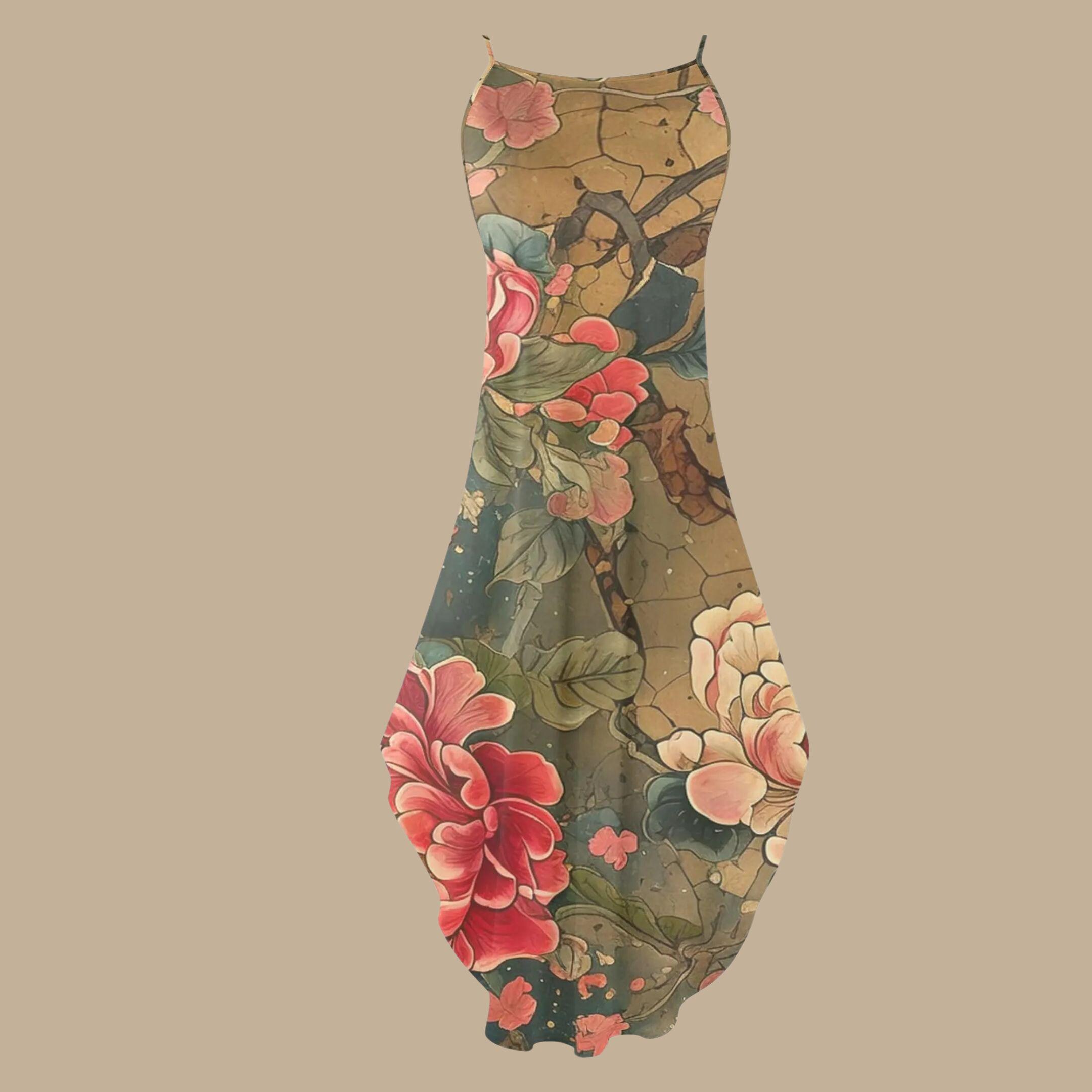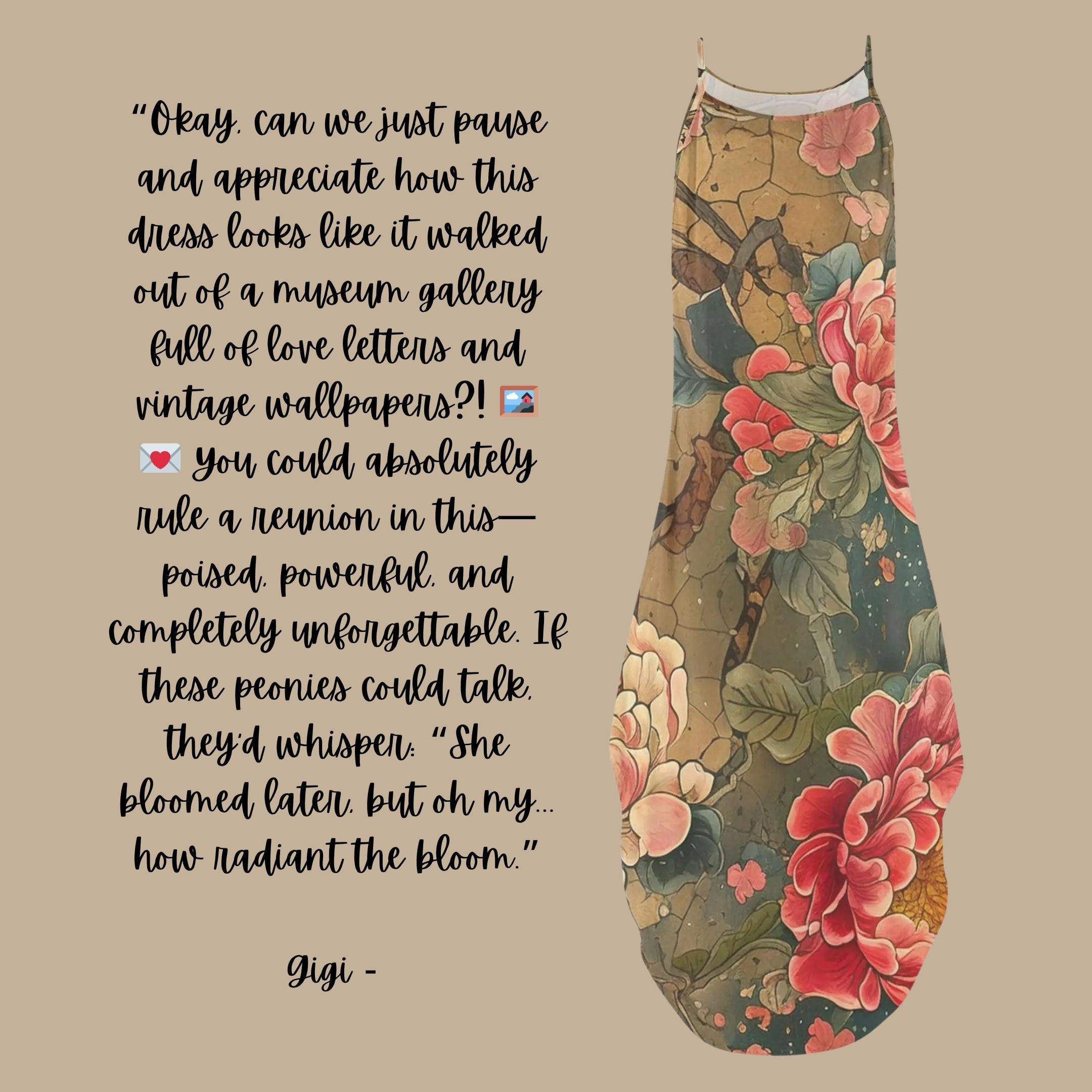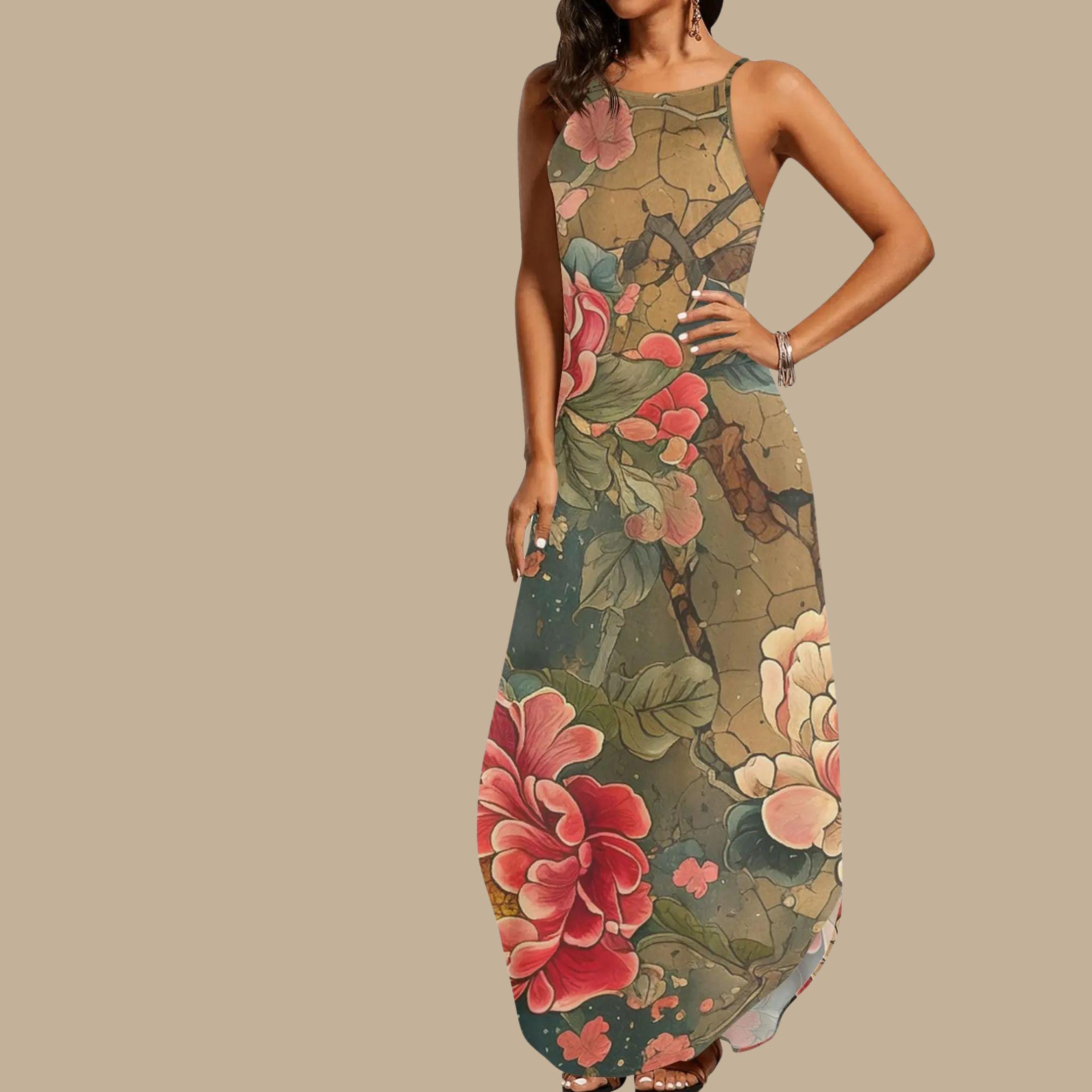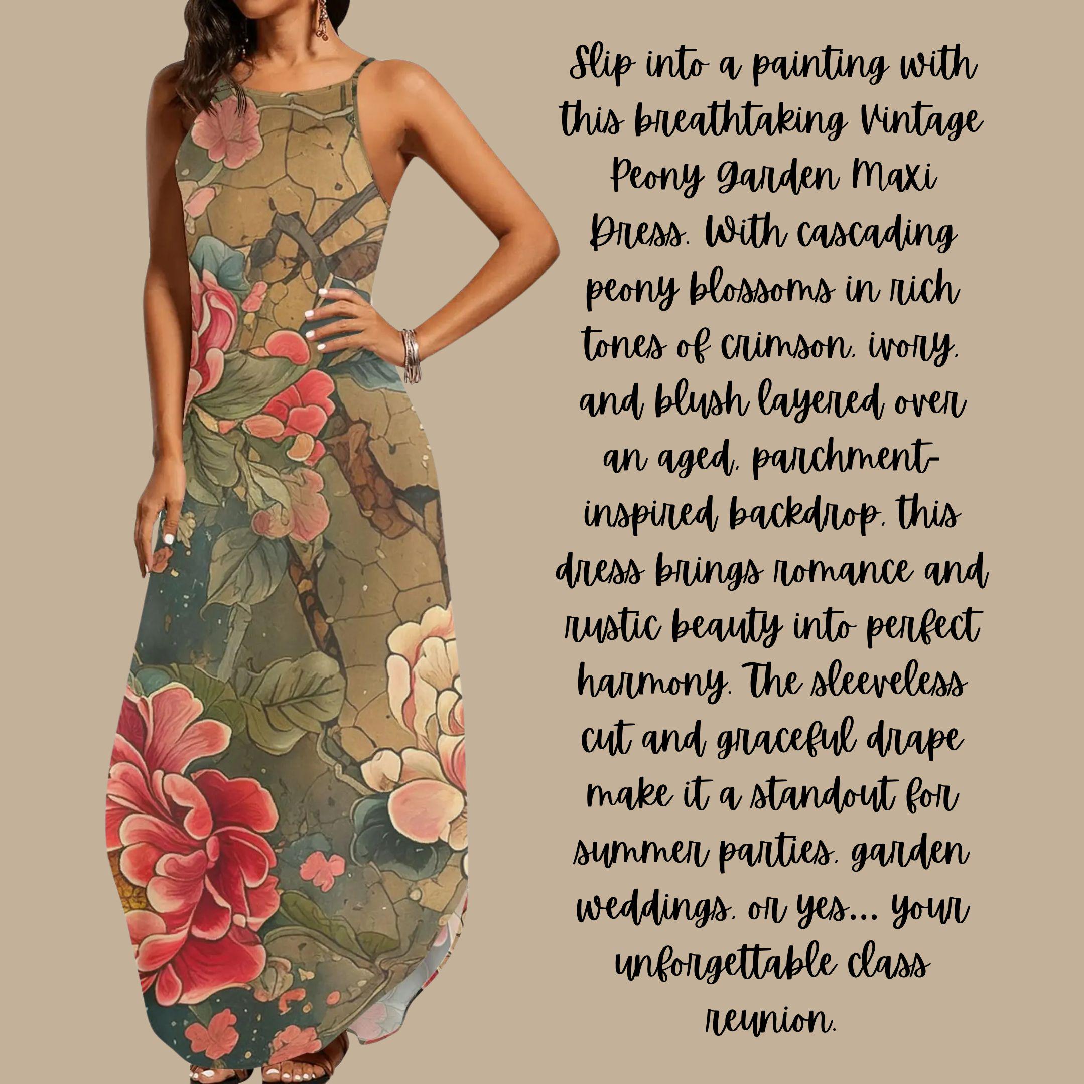 Wrap yourself in an heirloom of beauty with our Vintage Peony Scroll Maxi Dress, a breathtaking piece of wearable art. Featuring rich earth tones, crackled scroll textures, and oversized peony blossoms in soft ivory and bold crimson, this sleeveless dress tells a story of elegance and strength.
