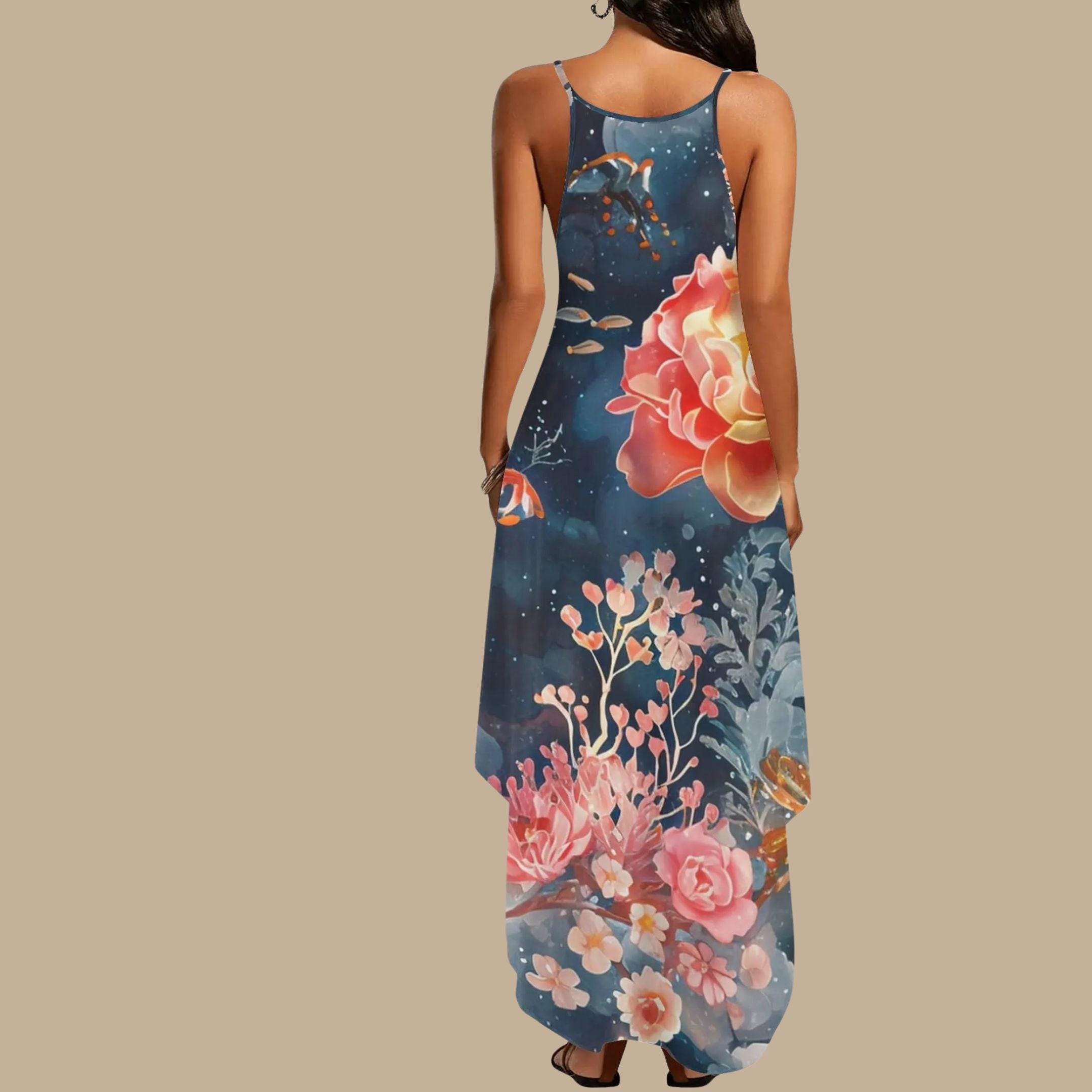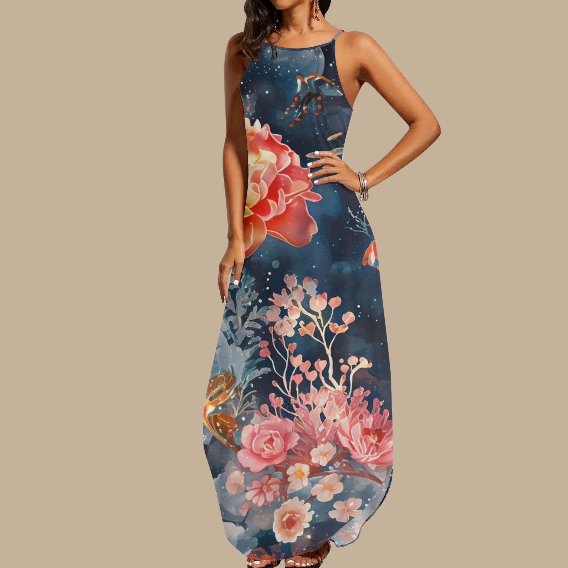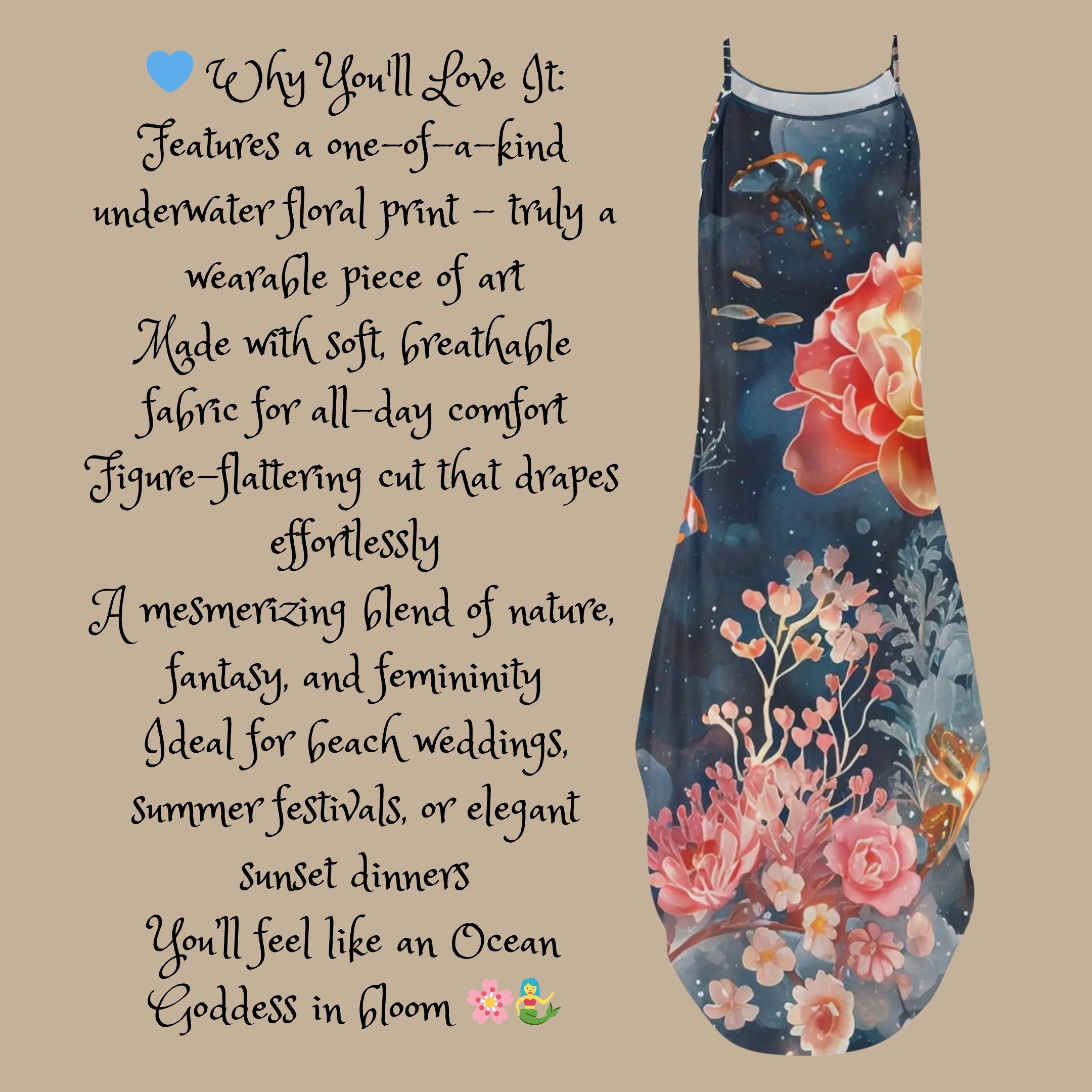 Swim into a sea of beauty with our Ocean Bloom Maxi Dress, where vibrant florals meet enchanting marine life. This sleeveless maxi features a stunning underwater garden scene: glowing pink coral, soft sea anemones, koi-like fish, and magical floating blossoms—set against a deep ocean-blue background speckled with stars and bubbles.