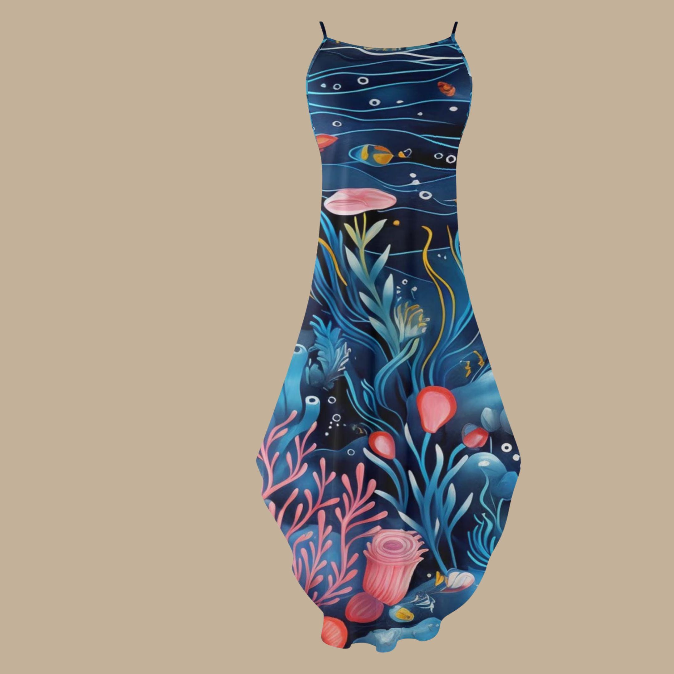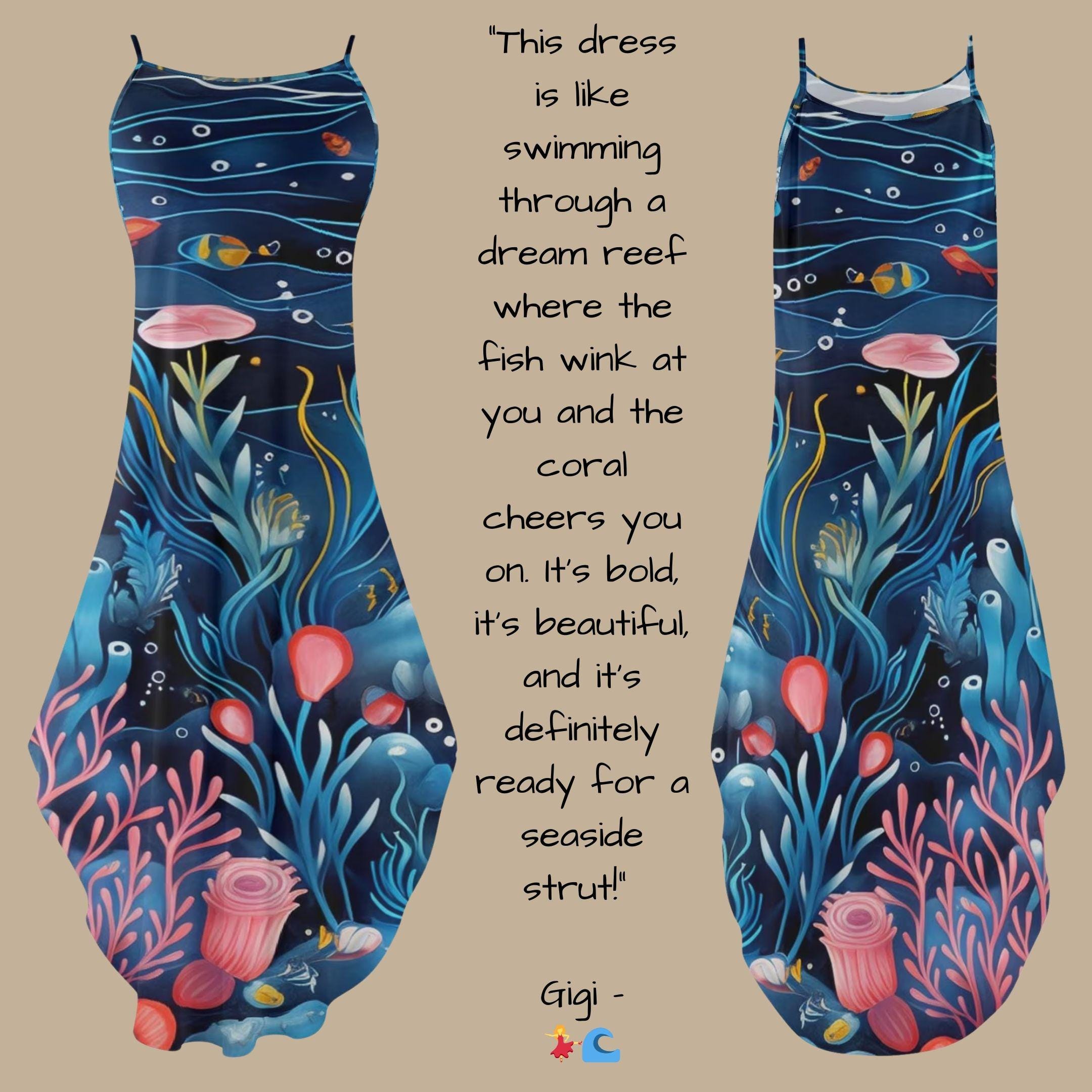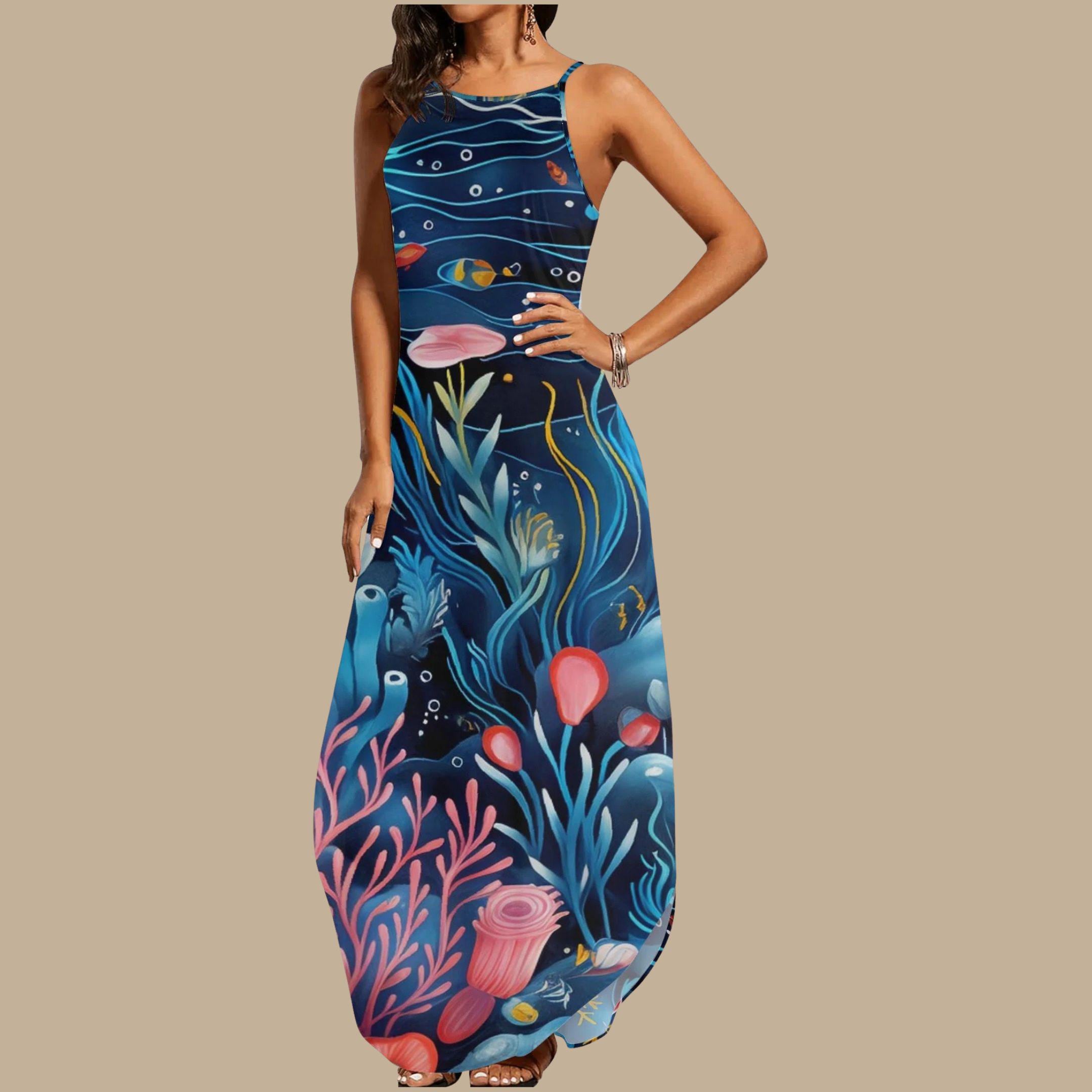 Step into a world of wonder with our Undersea Fantasy Maxi Dress, where every inch of fabric brings an ocean dream to life. Featuring an incredible undersea scene with coral reefs, playful fish, and swaying sea plants in bold blues, pinks, and yellows, this dress is a wearable work of marine art.