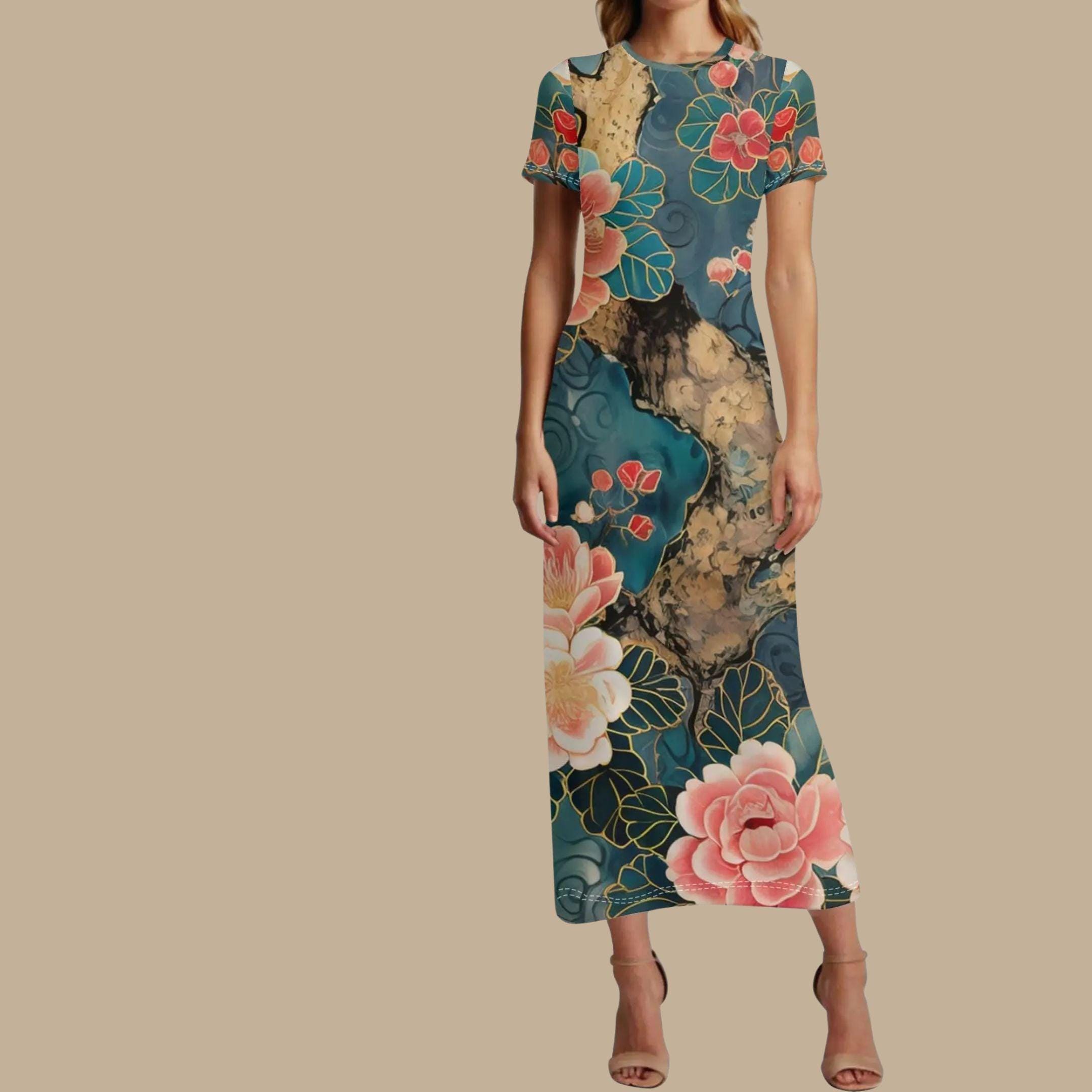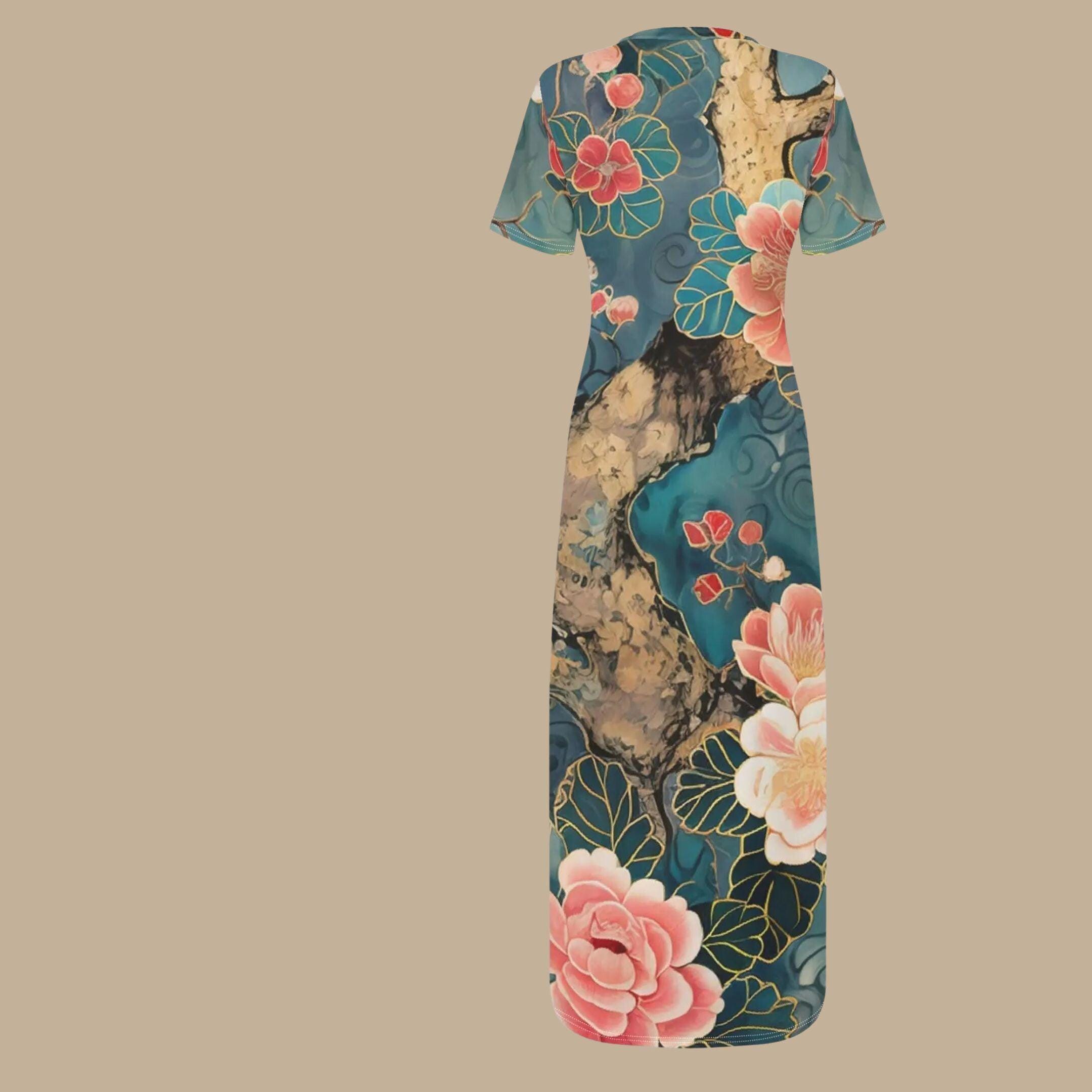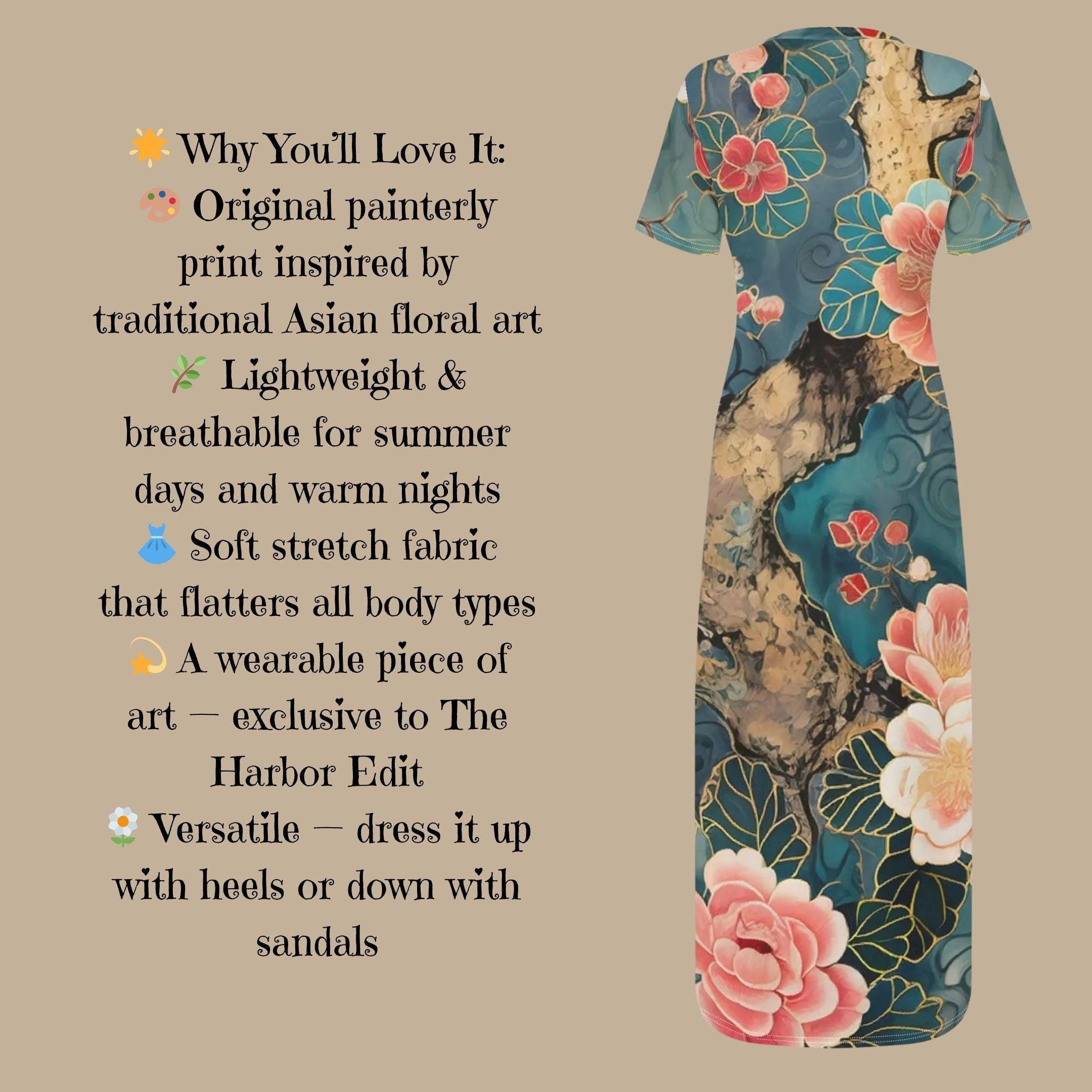 Wrap yourself in the artistry of nature with our Teal Blossom Tree T-Shirt Maxi Dress 🌳🌸 - a bold, painterly tribute to timeless beauty. Featuring a rich teal background, sweeping tree trunk accents, and lush coral-pink blossoms lined in soft golden veining, this original design is both tranquil and statement-making. ✨Perfect for garden brunches, art gallery strolls, or soulful summer evenings, this soft, breathable t-shirt dress combines everyday comfort with dramatic flair. The flattering silhouette hugs gently and flows freely, letting you move with grace and style. 💃🌟 Why You'll Love It:🎨 Original painterly print inspired by traditional Asian floral art🌿 Lightweight & breathable for summer days and warm nights👗 Soft stretch fabric that flatters all body types💫 A wearable piece of art - exclusive to The Harbor Edit🌼 Versatile - dress it up with heels or down with sandals