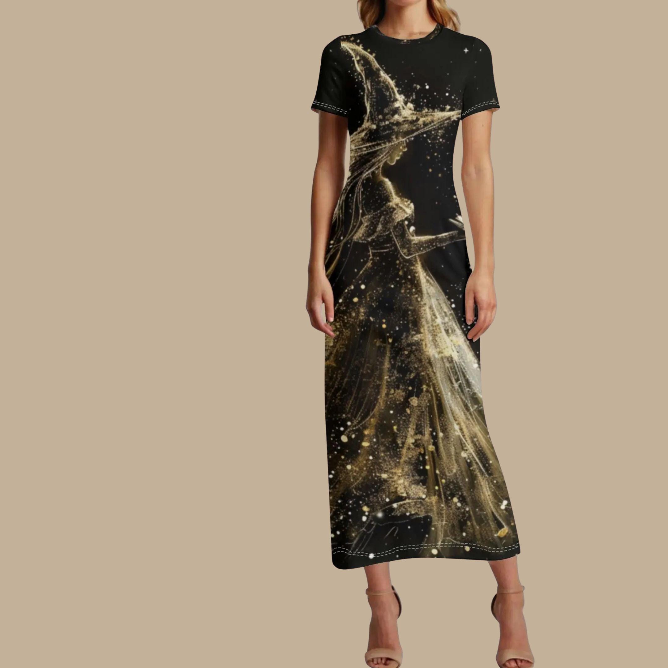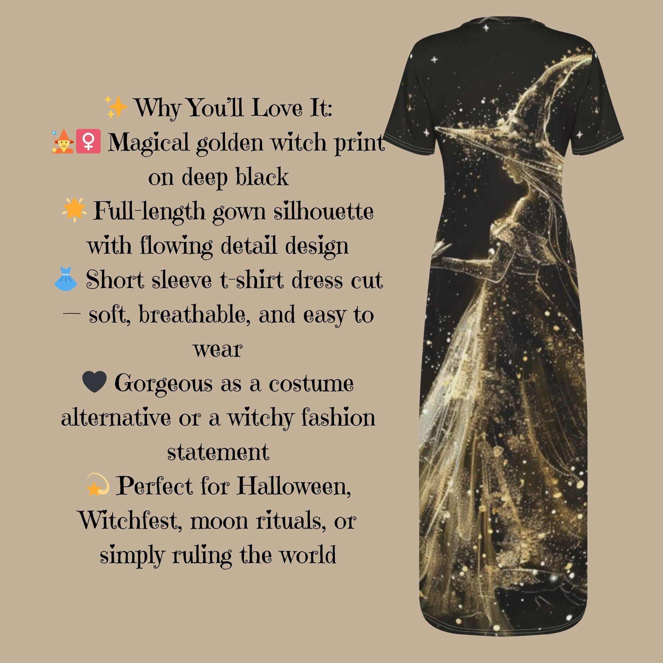 This spellbinding dress features a flowing golden witch silhouette casting magic across a deep black night sky. Whether you're hosting a haunted soirée or twirling under the moonlight, this witchy wonder brings elegant drama to any autumn occasion.