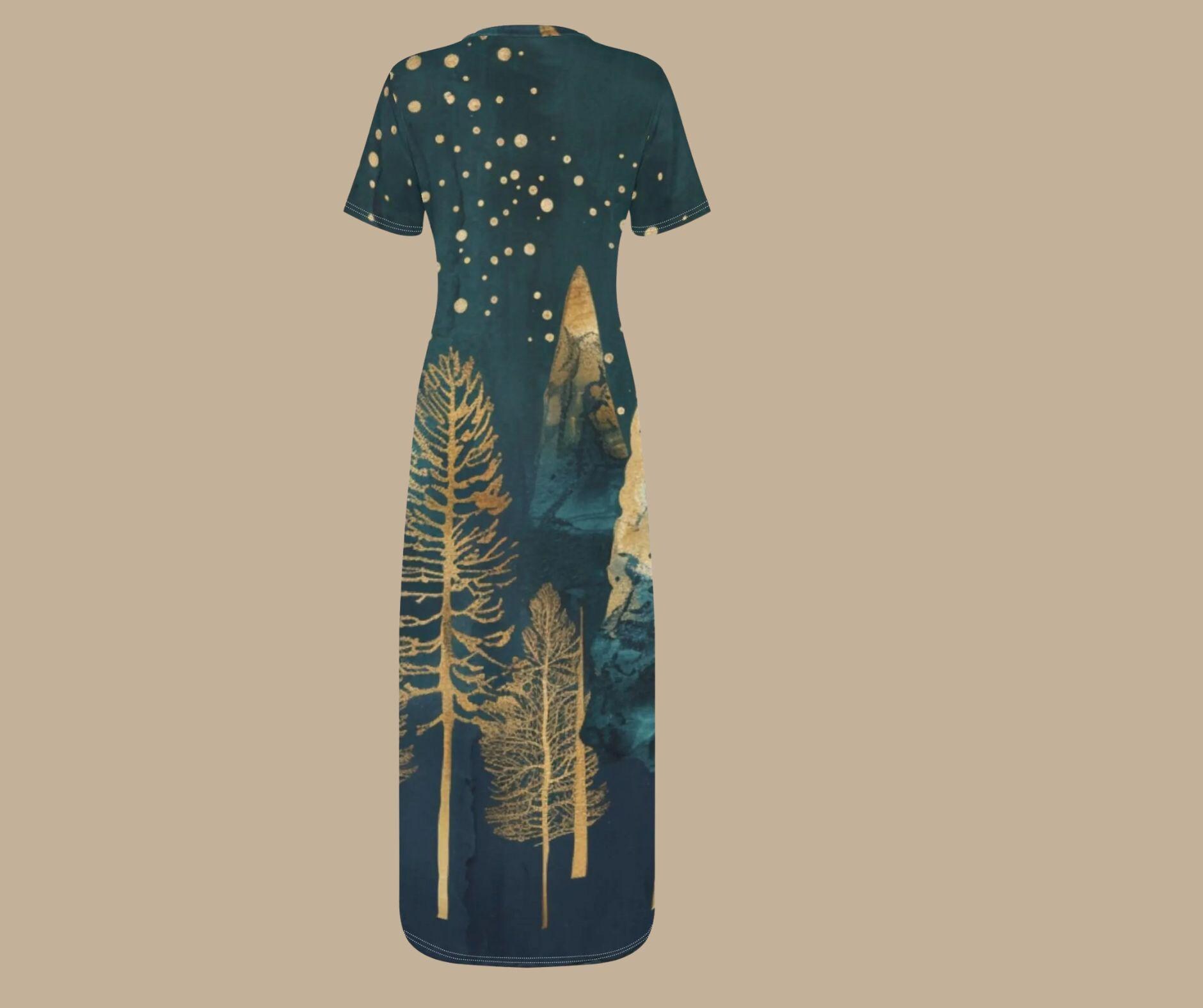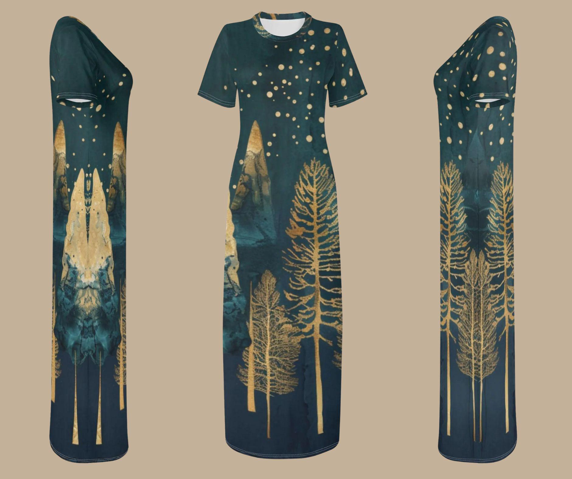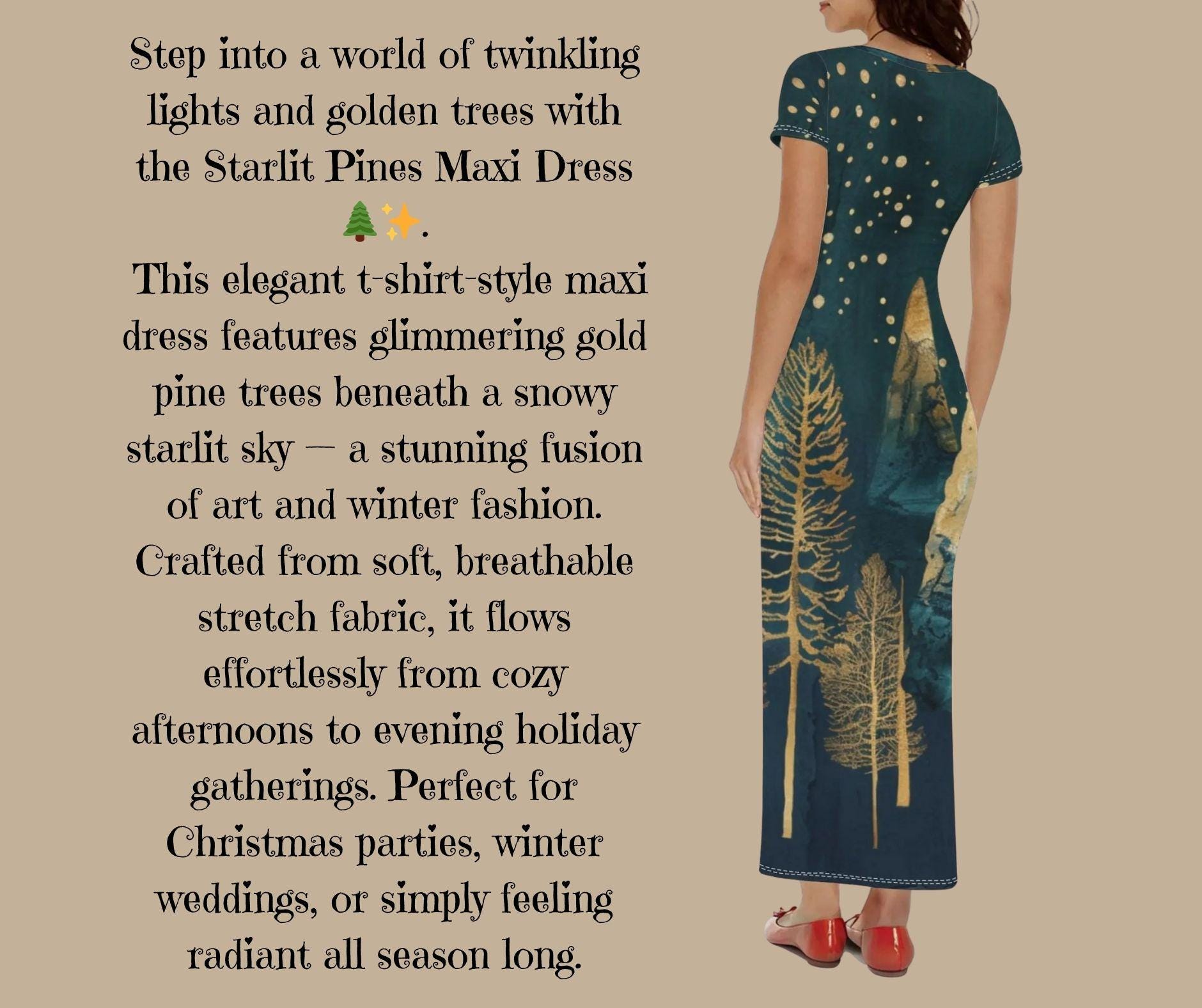 This elegant t-shirt-style maxi dress features glimmering gold pine trees beneath a snowy starlit sky β a stunning fusion of art and winter fashion. Crafted from soft, breathable stretch fabric, it flows effortlessly from cozy afternoons to evening holiday gatherings. Perfect for Christmas parties, winter weddings, or simply feeling radiant all season long.