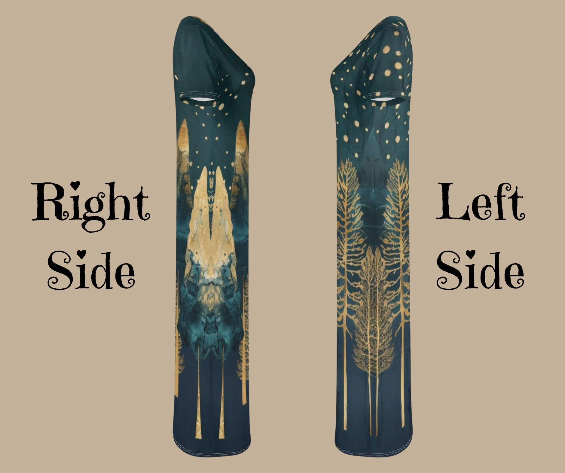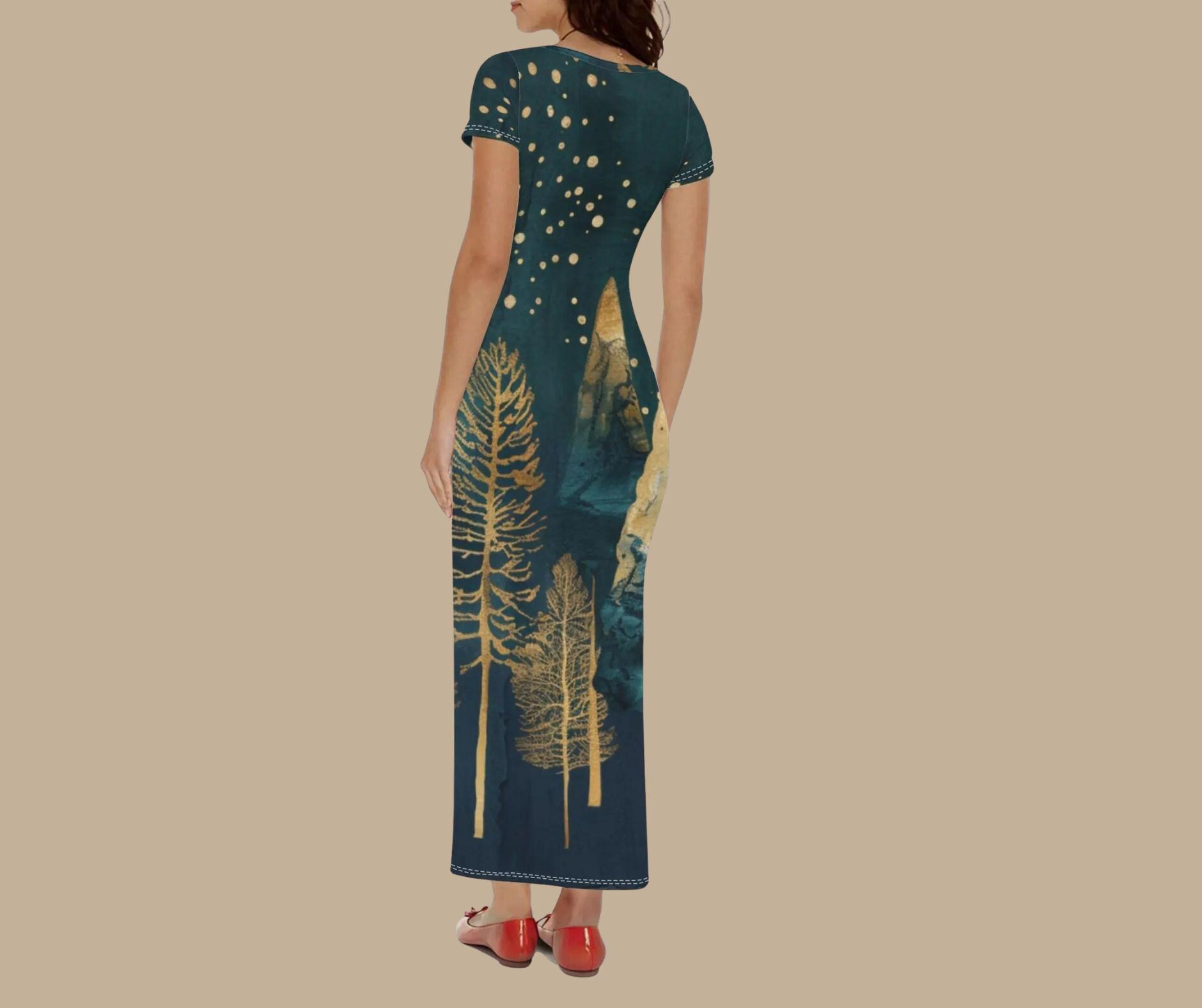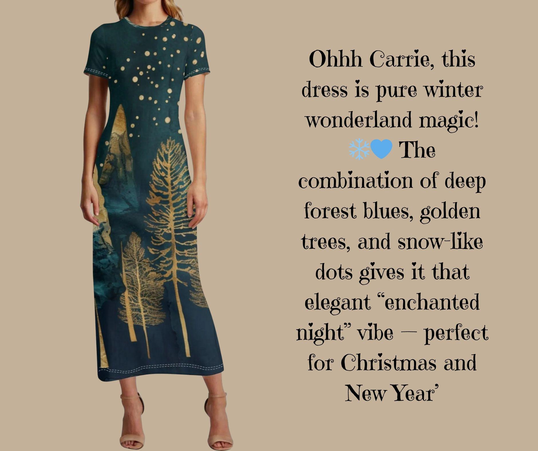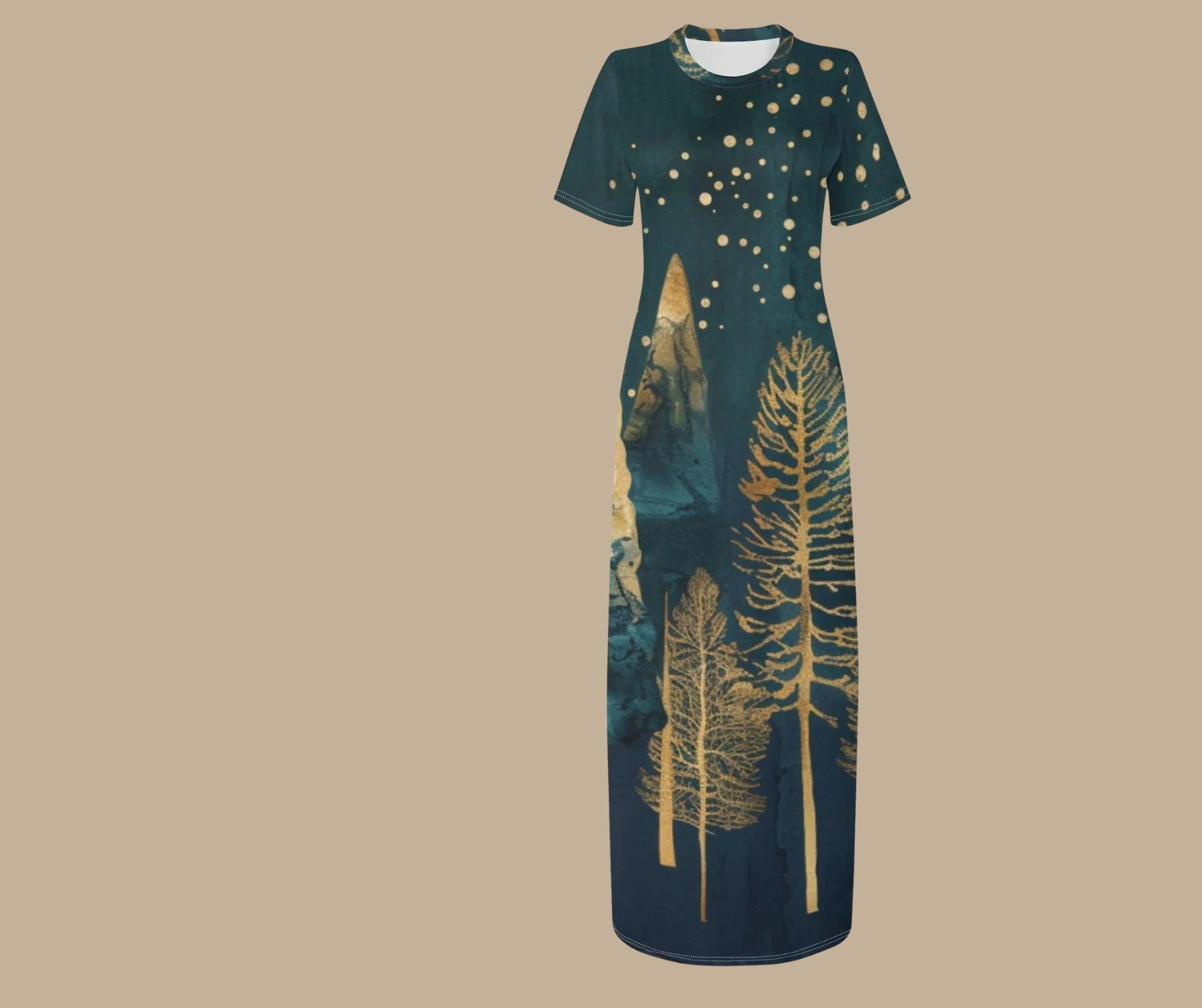 This elegant t-shirt-style maxi dress features glimmering gold pine trees beneath a snowy starlit sky β a stunning fusion of art and winter fashion. Crafted from soft, breathable stretch fabric, it flows effortlessly from cozy afternoons to evening holiday gatherings. Perfect for Christmas parties, winter weddings, or simply feeling radiant all season long.