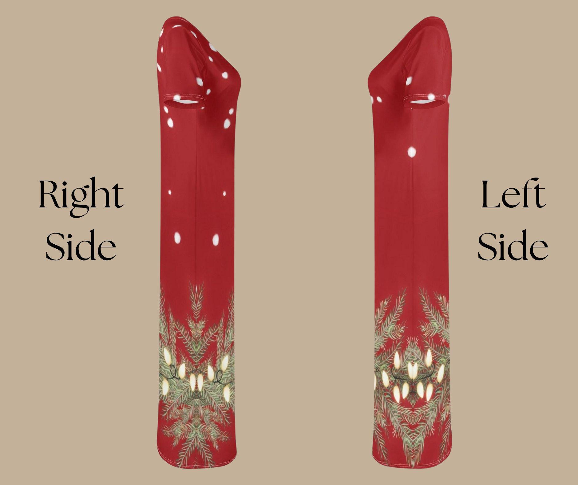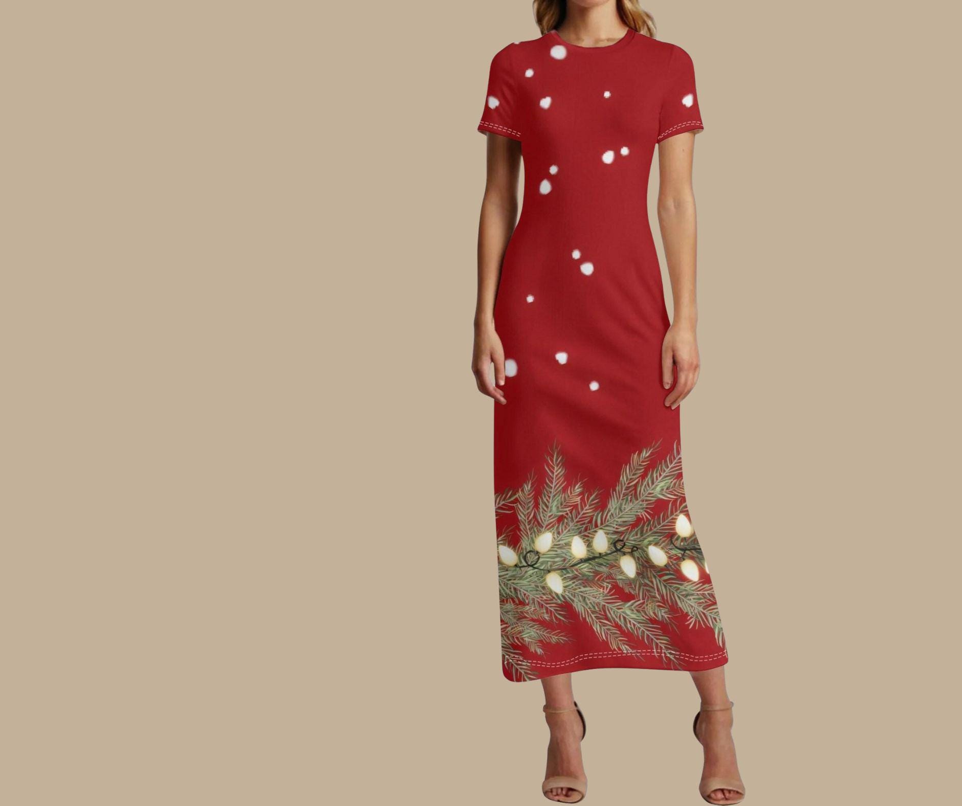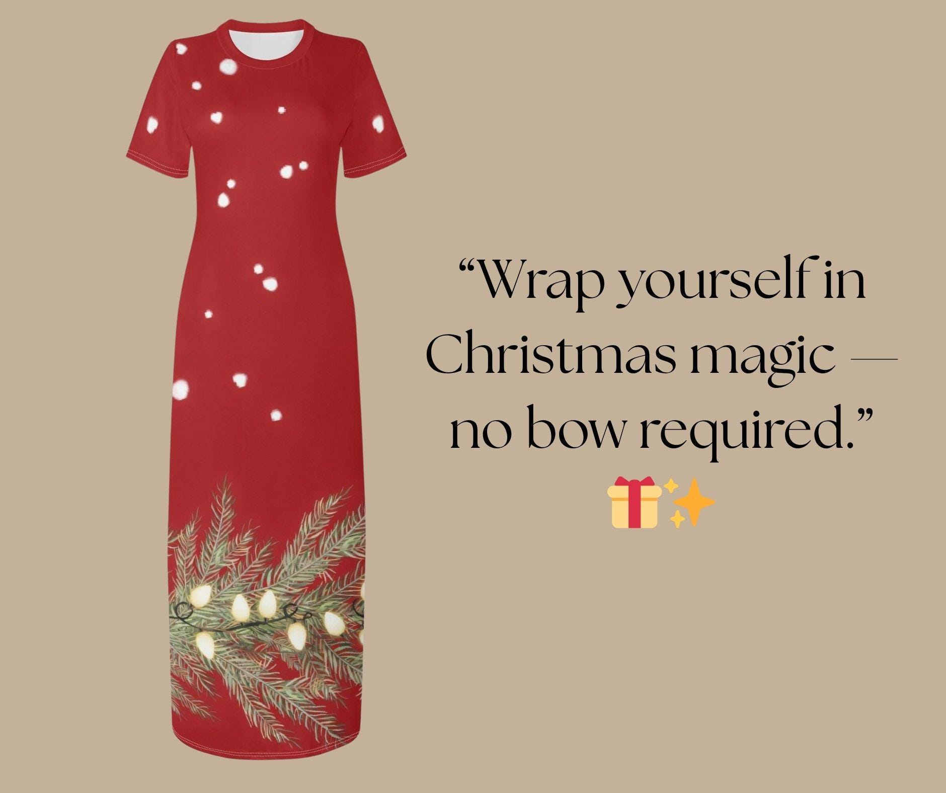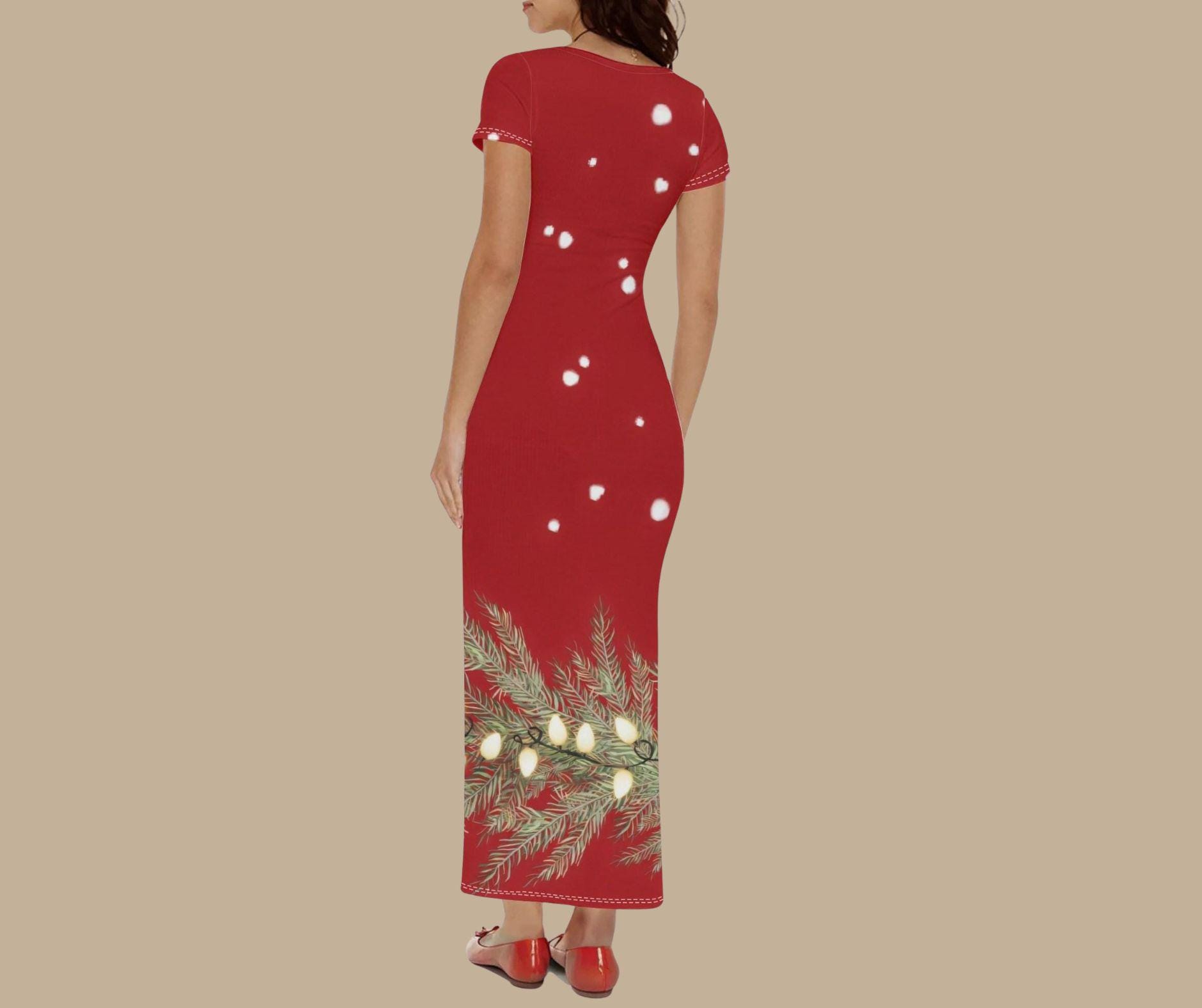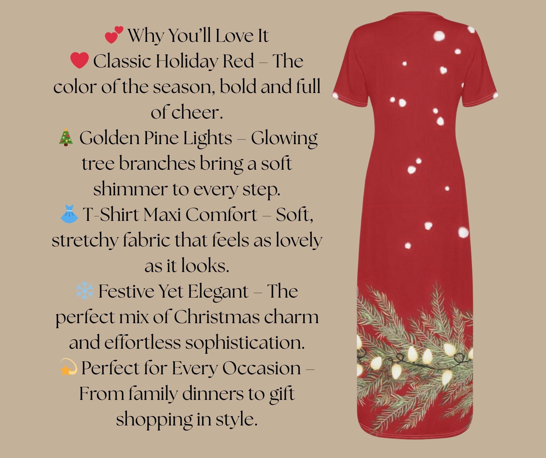 Step into the season of twinkle lights and cozy charm with our Red Snowlit Pine Maxi Dress — a festive showpiece that captures the glow of a winter night. The deep crimson backdrop is sprinkled with softly falling snowflakes and trimmed with golden pine branches wrapped in glowing holiday lights.