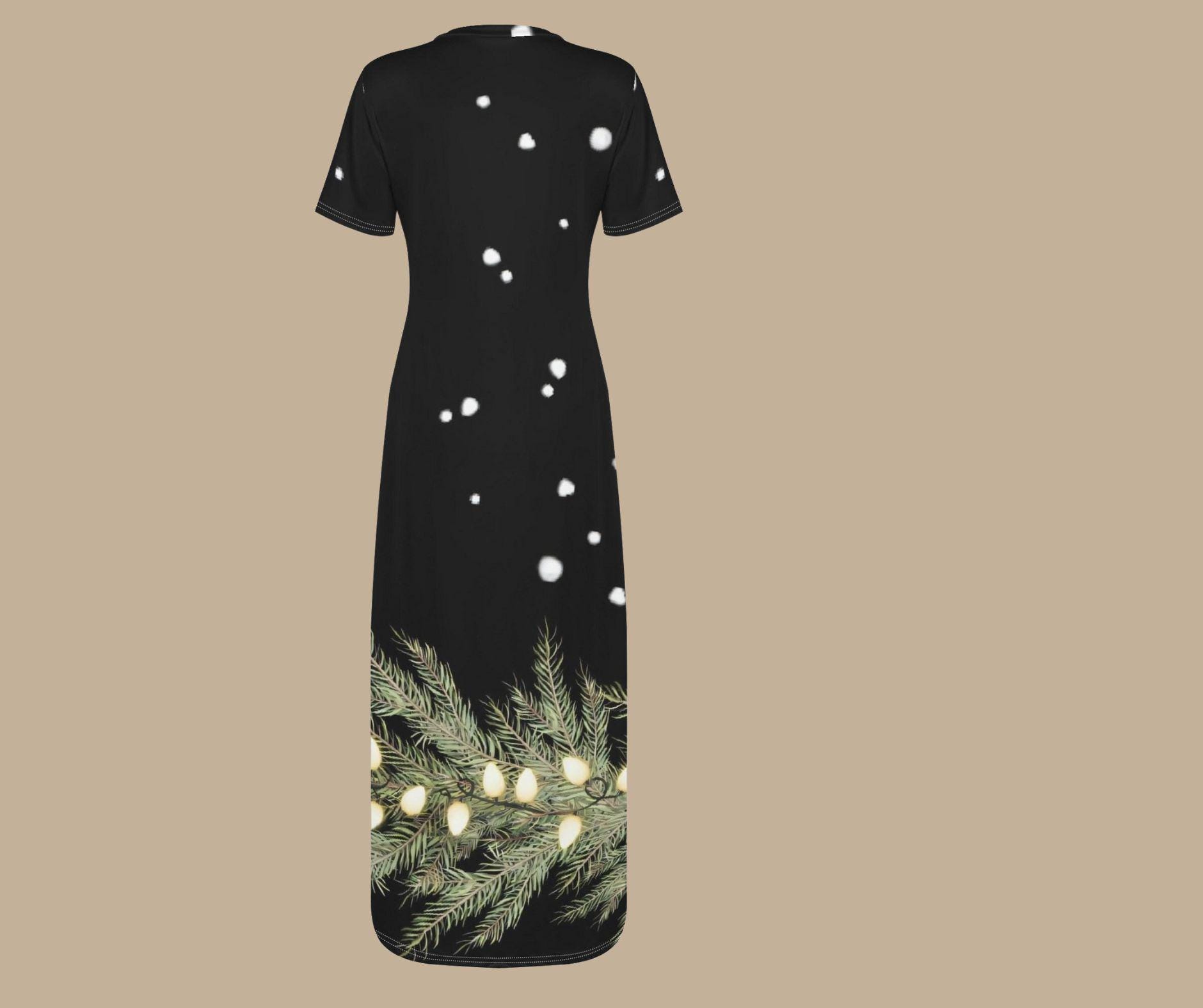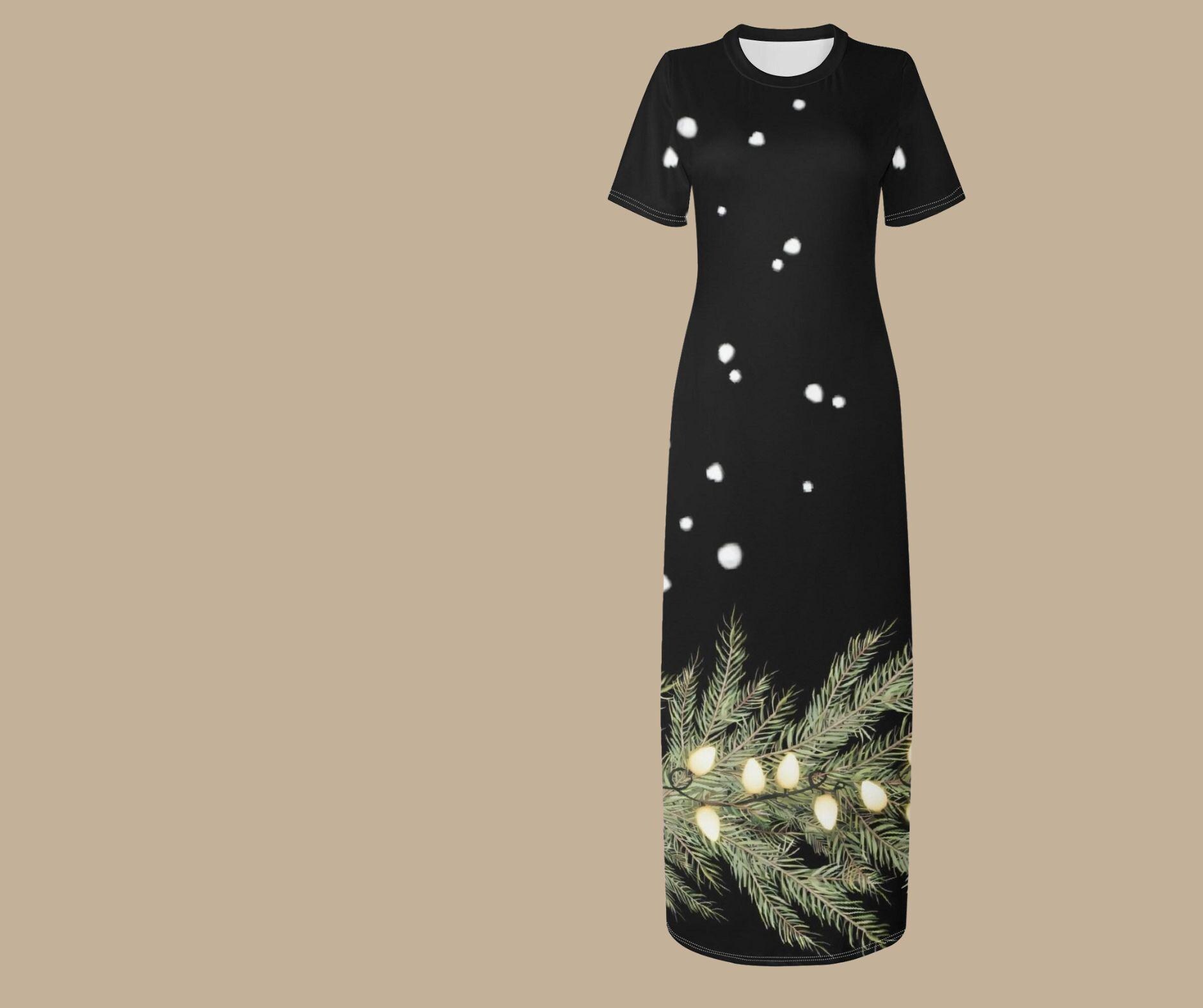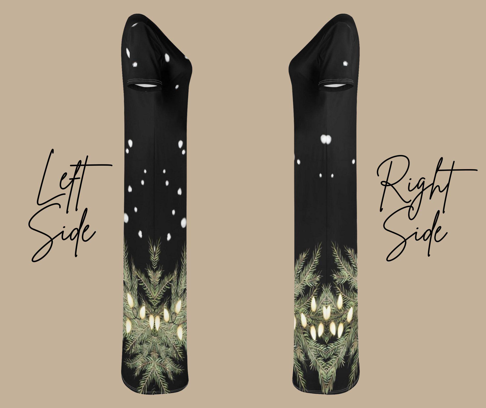 This soft t-shirt dress captures the glow of winter nights with its twinkling golden pine branch design and softly falling snow against a deep black background. Whether you’re trimming the tree, attending a cozy dinner, or simply soaking in the holiday cheer, this piece keeps you comfortable and effortlessly stylish.