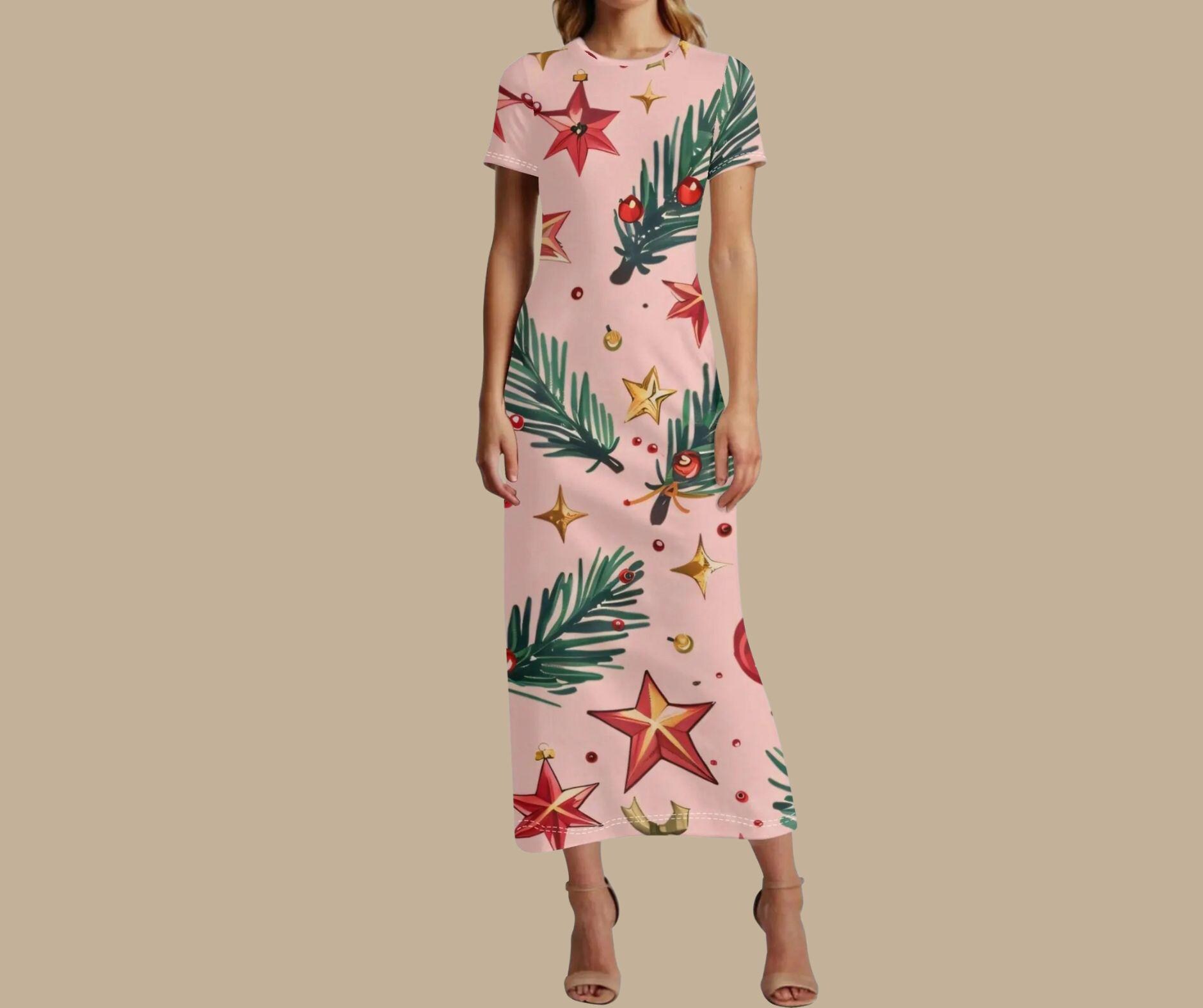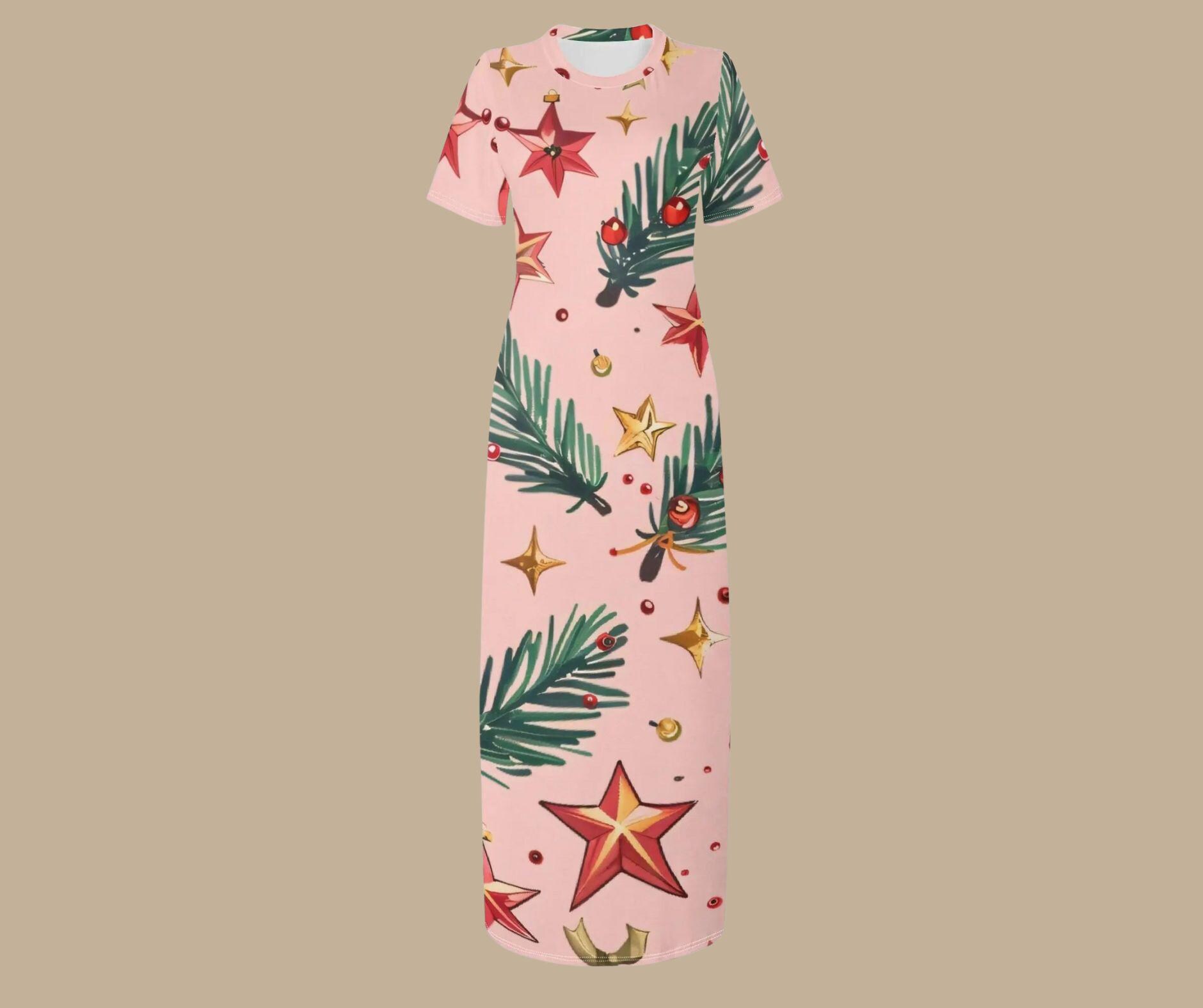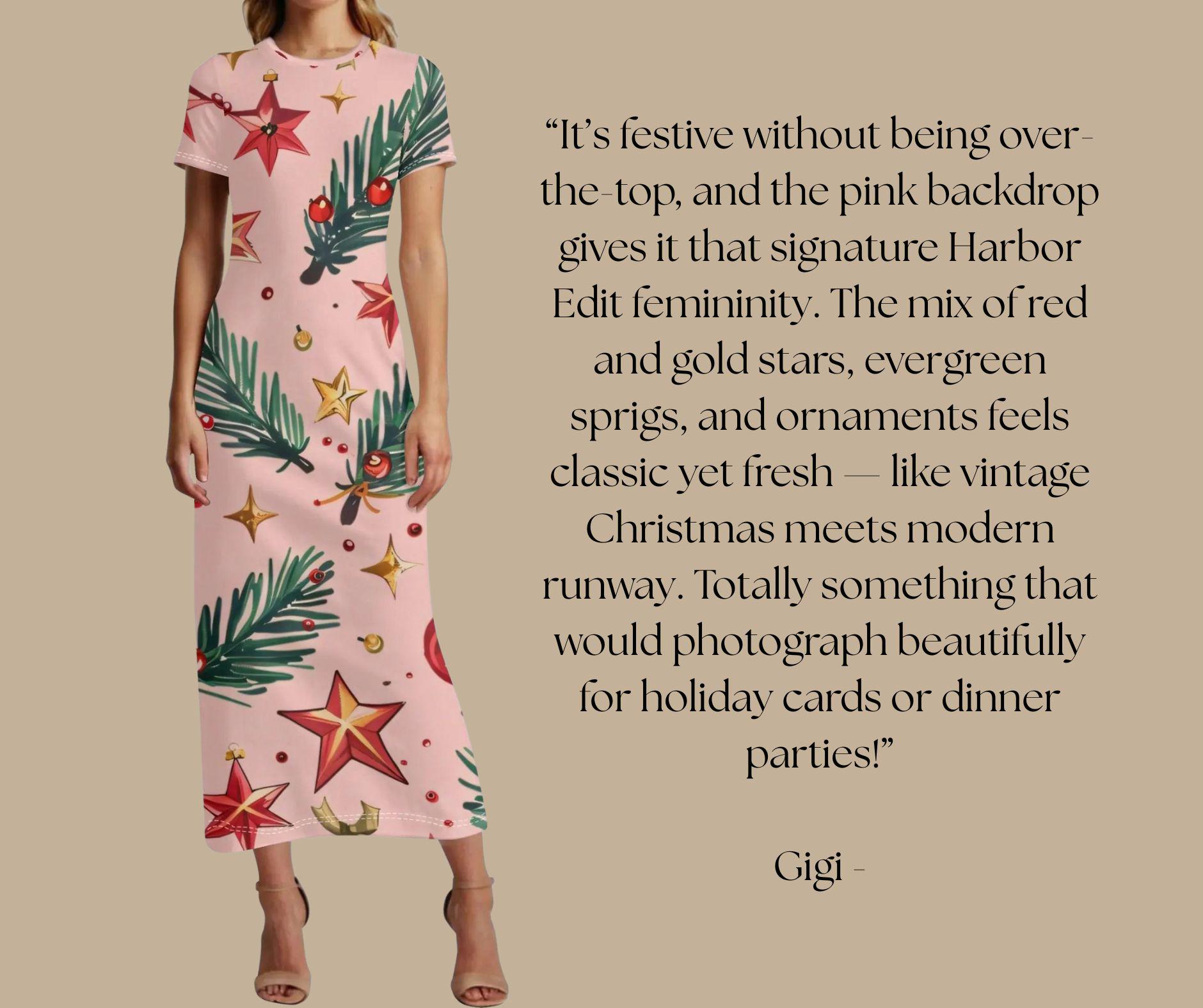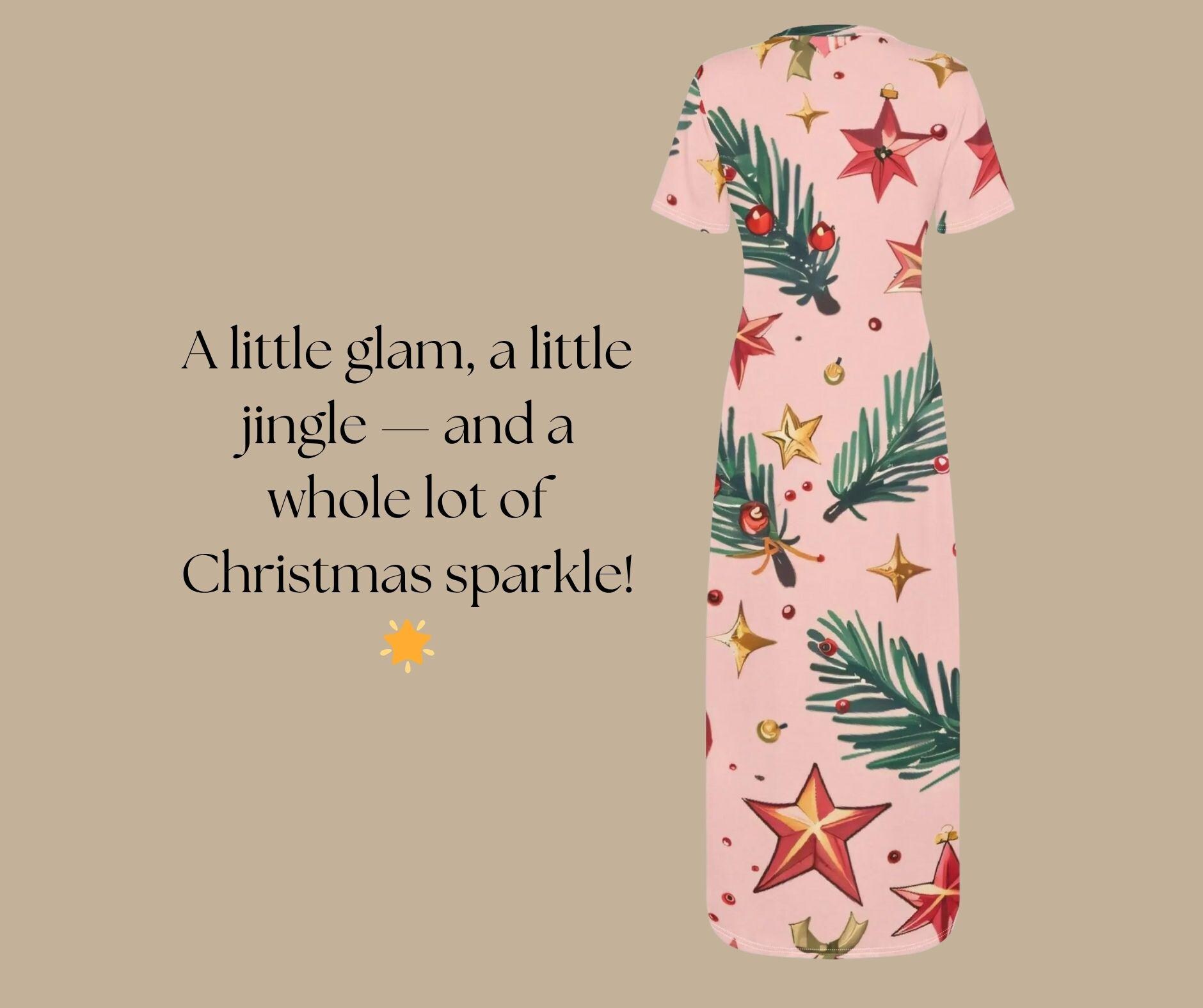 Wrap yourself in holiday magic with our Pink Noel Star Maxi Dress — a soft, stylish nod to classic Christmas décor reimagined in blush tones. With shimmering gold stars, festive pine sprigs, and vintage-inspired ornament motifs, this dress turns cozy winter style into wearable art. 🌟🎀