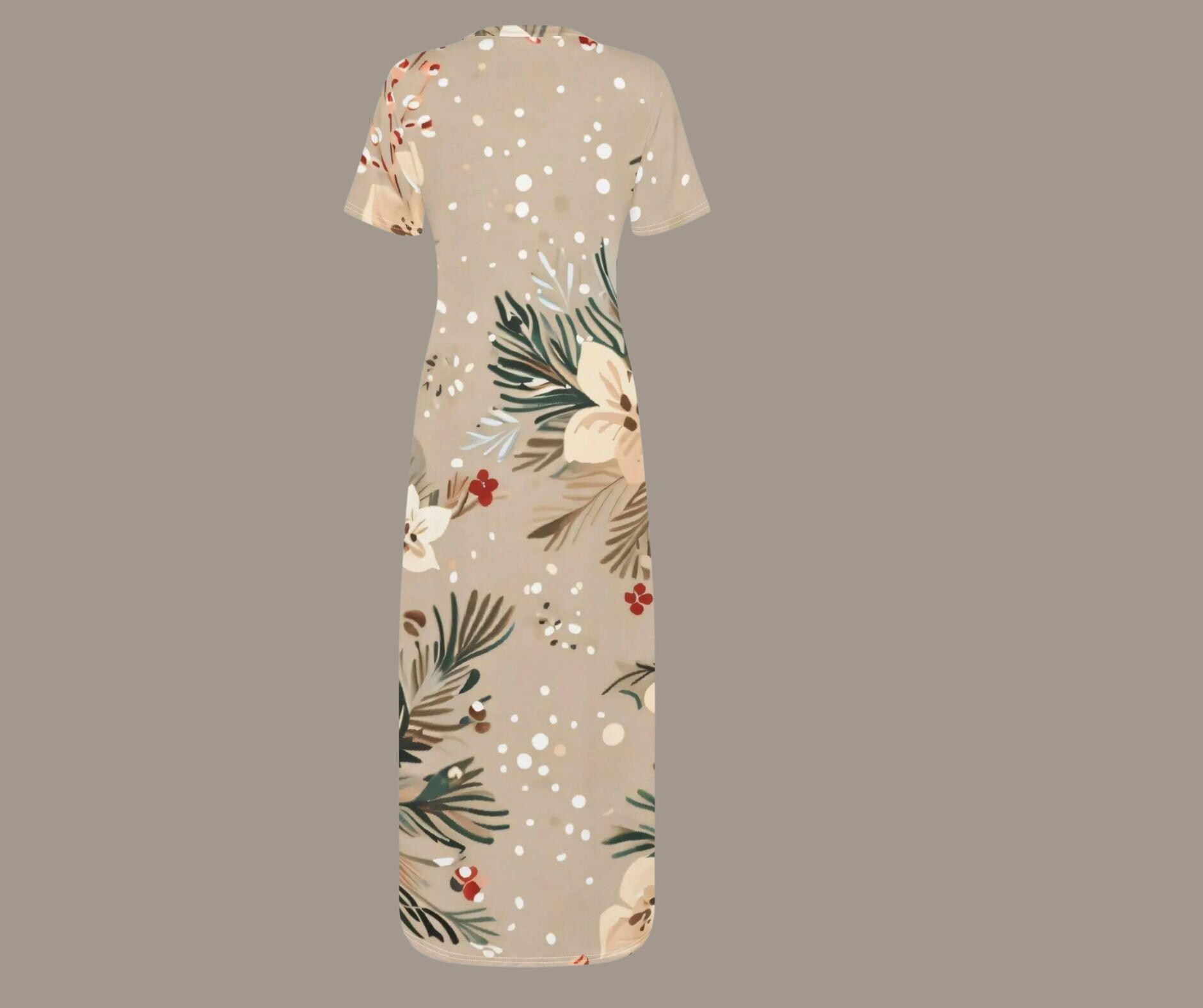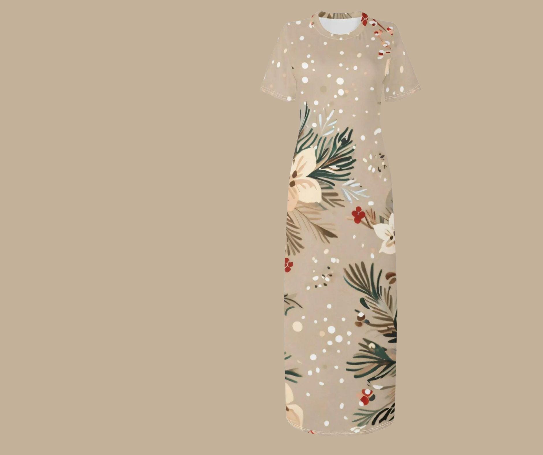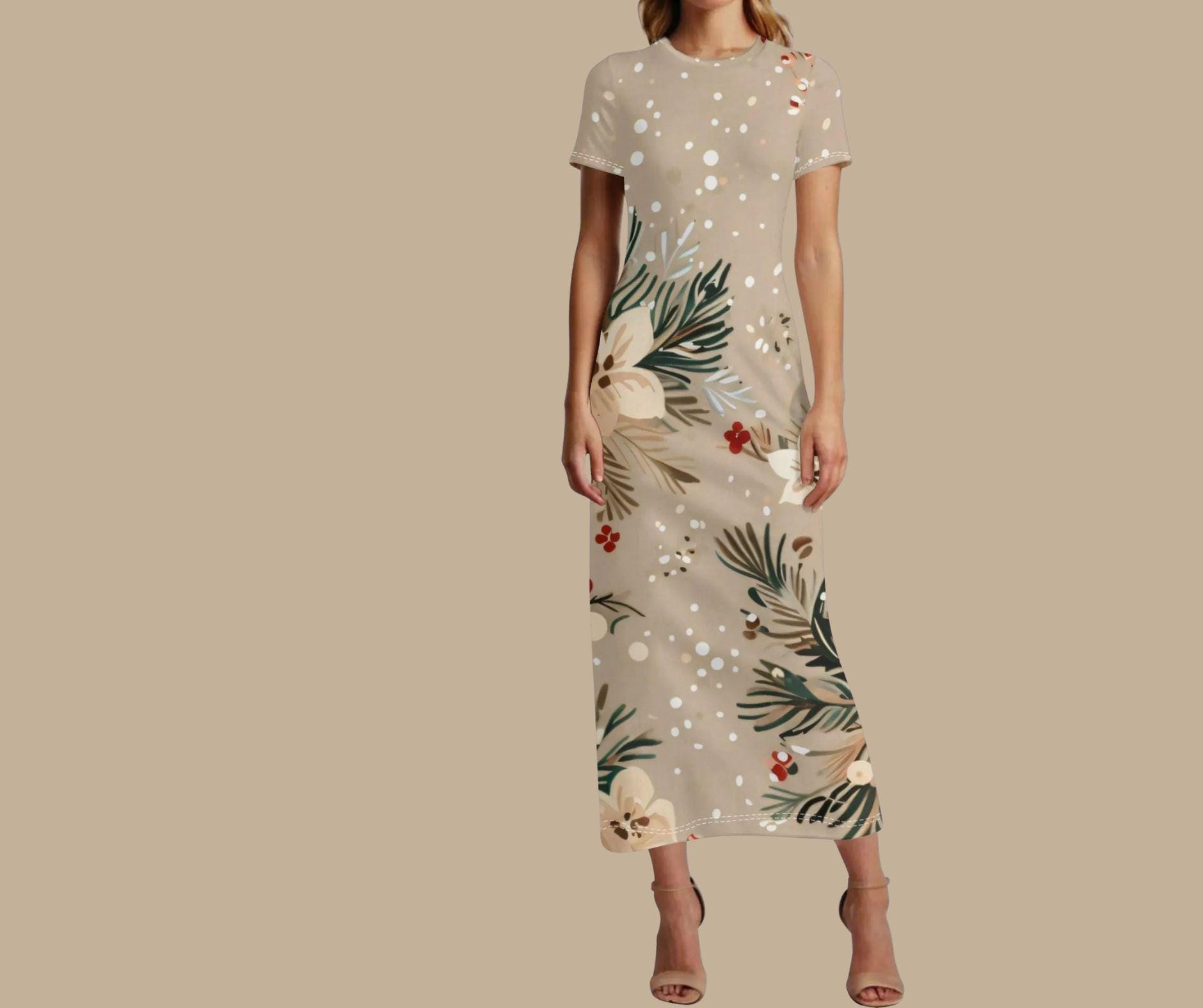 Designed in a creamy beige tone adorned with white blossoms, pine greenery, and red berries, this festive maxi captures winter’s quiet magic without the loud holiday chaos. The snow-dusted print and flowing silhouette make it perfect for cozy gatherings, winter weddings, or elegant Christmas dinners.