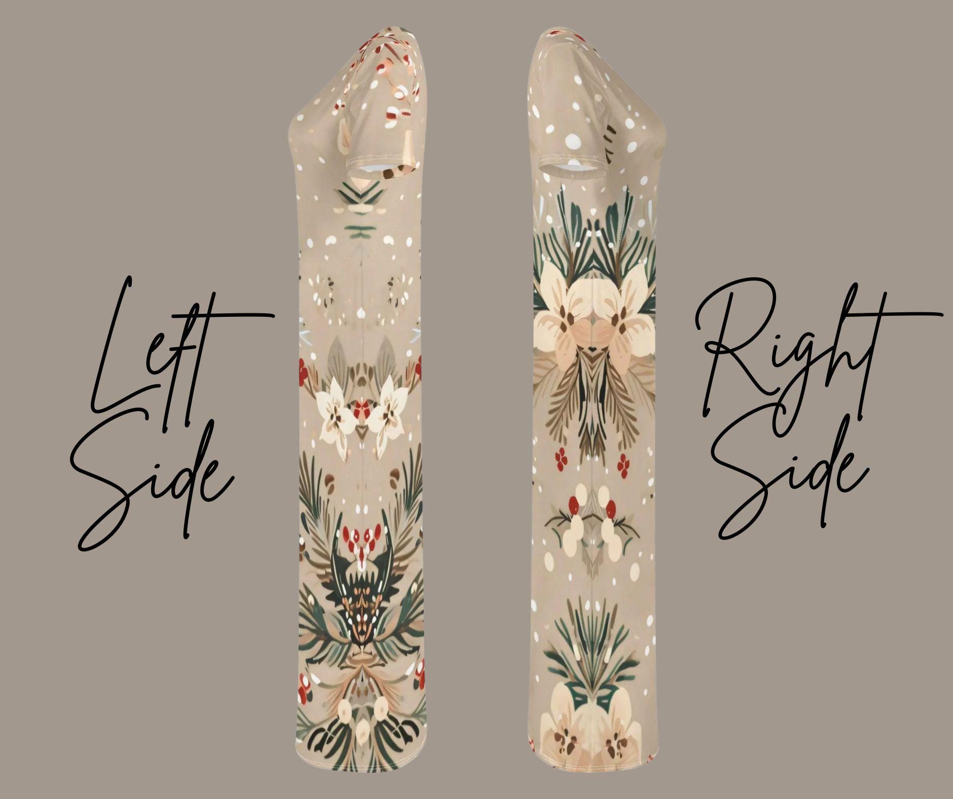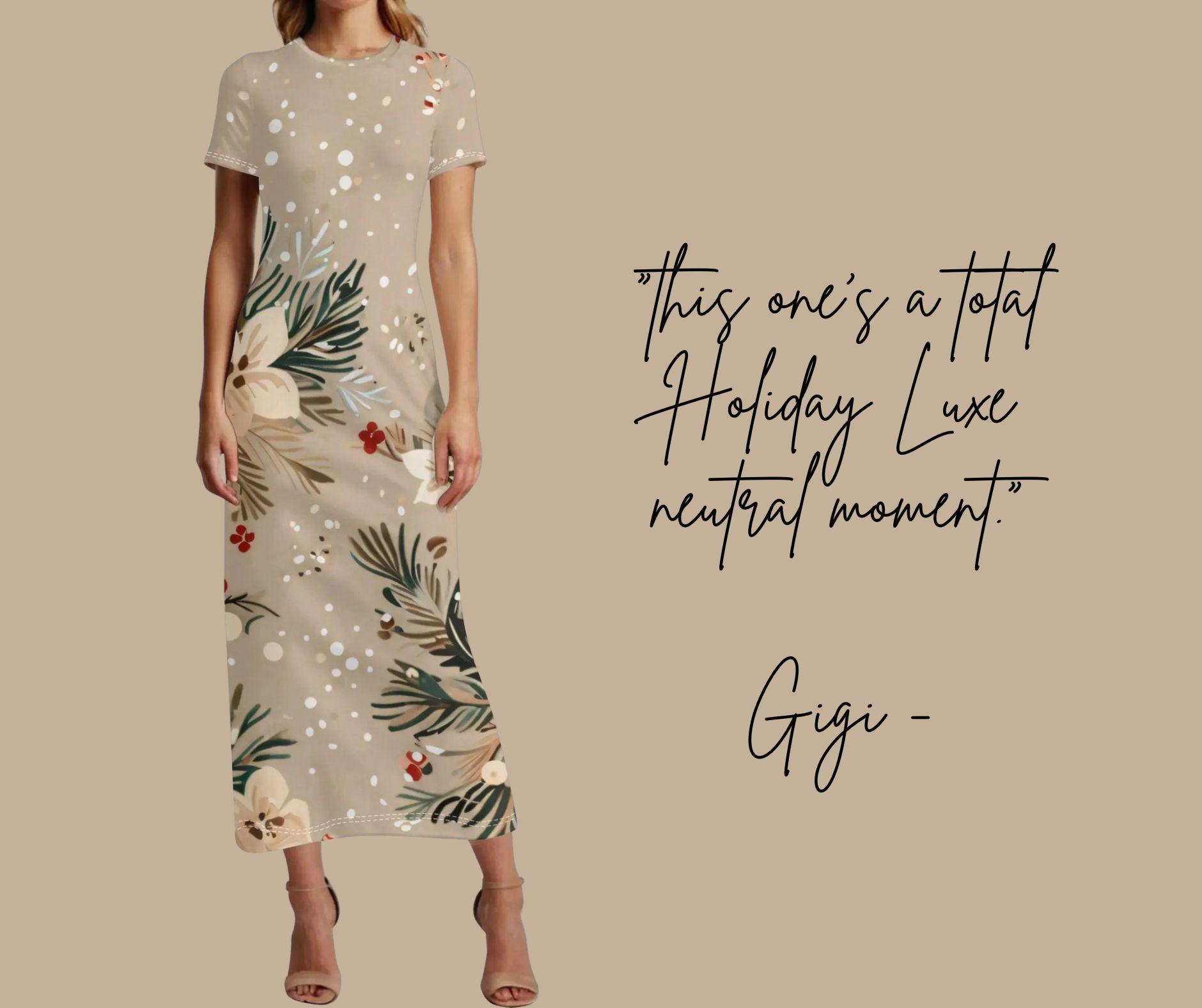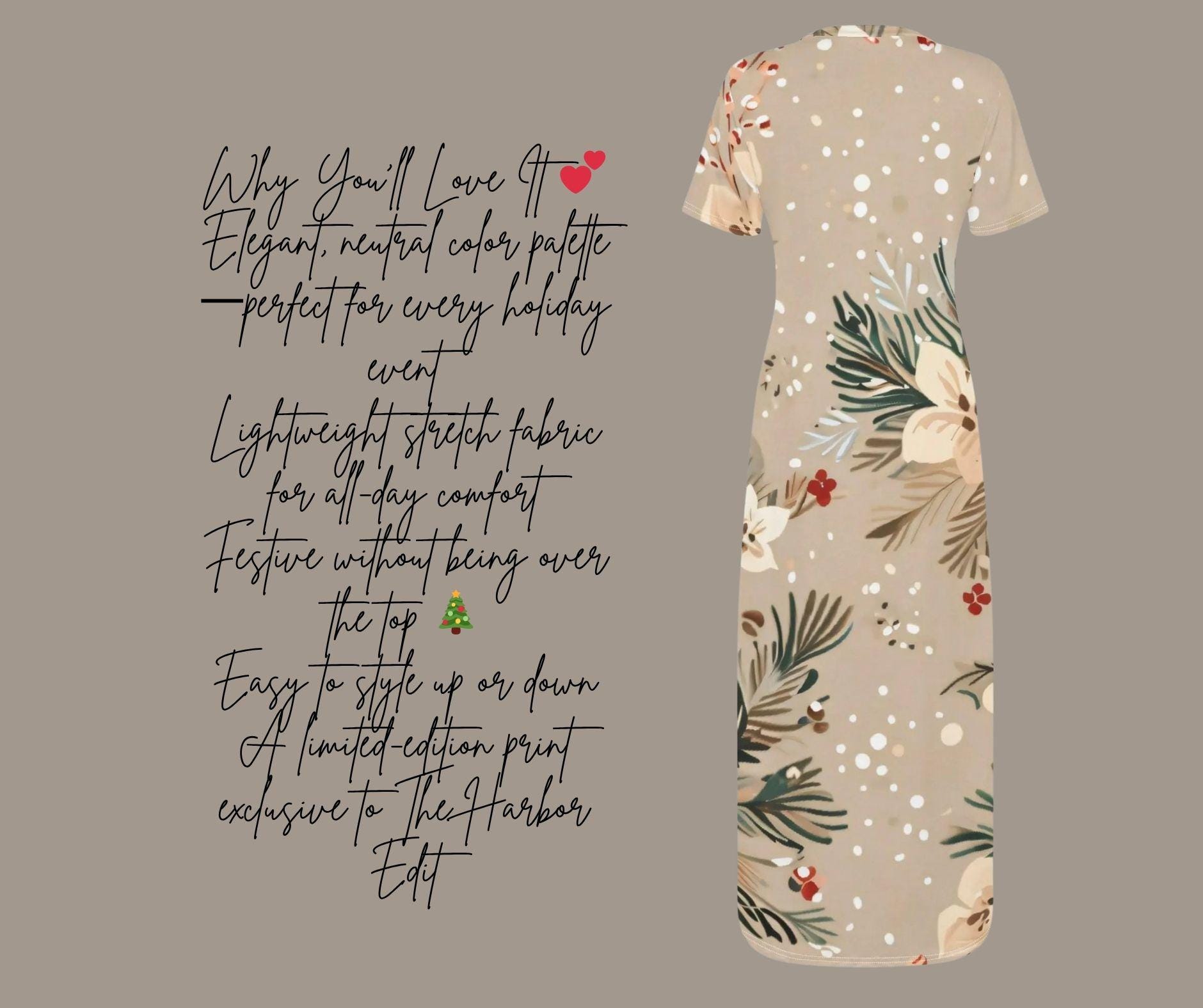 Designed in a creamy beige tone adorned with white blossoms, pine greenery, and red berries, this festive maxi captures winter’s quiet magic without the loud holiday chaos. The snow-dusted print and flowing silhouette make it perfect for cozy gatherings, winter weddings, or elegant Christmas dinners.