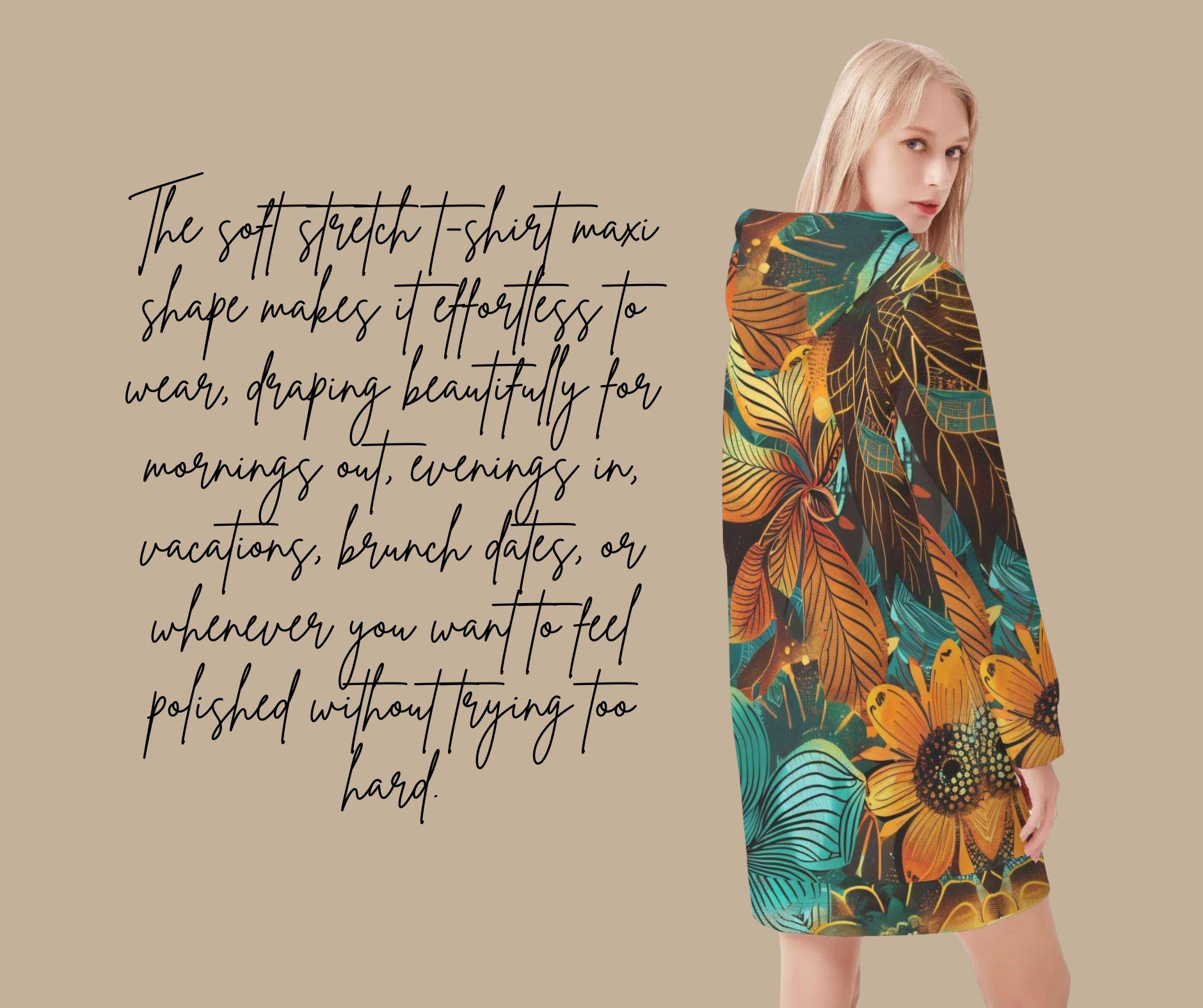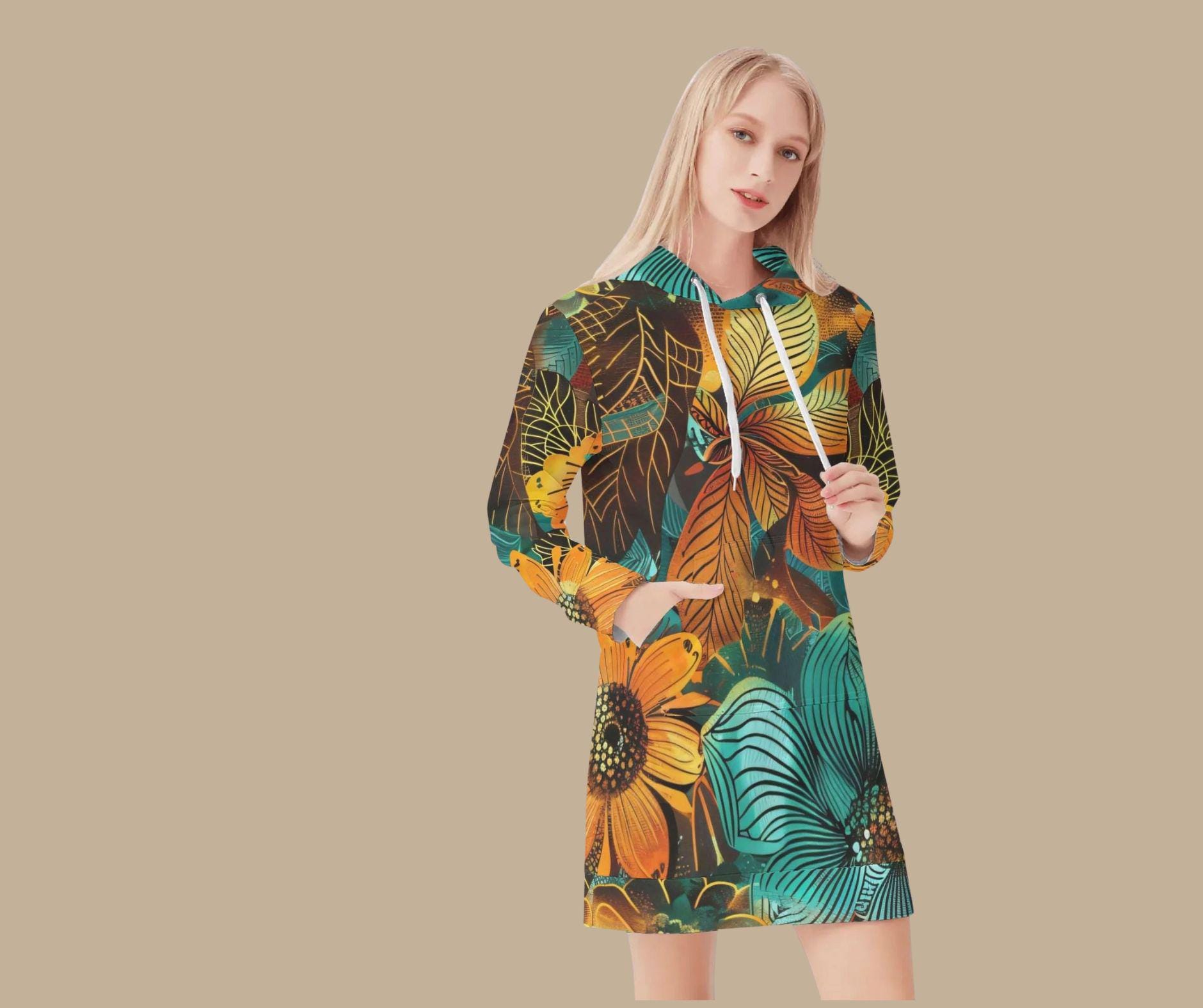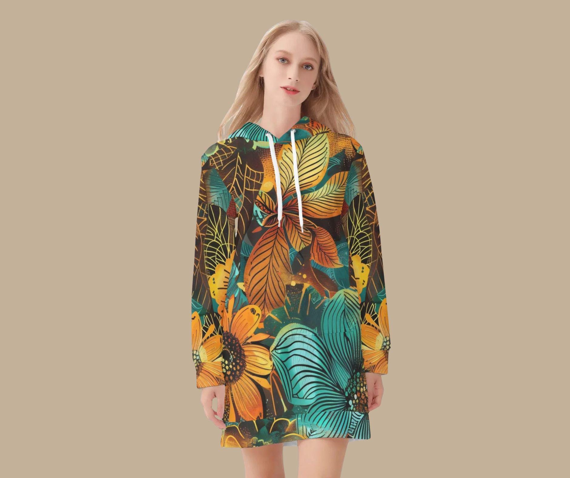 Step straight into fall magic with this Autumn Bloom Hoodie Dress, bursting with bold florals in rich teal, golden yellow, and warm burnt orange tones. This piece wraps you in cozy comfort while keeping your style bright, artistic, and unforgettable.