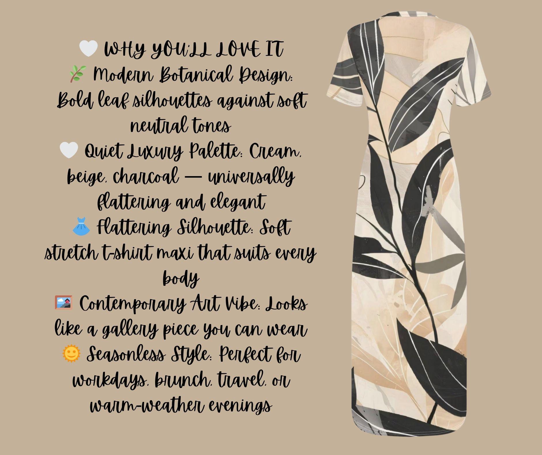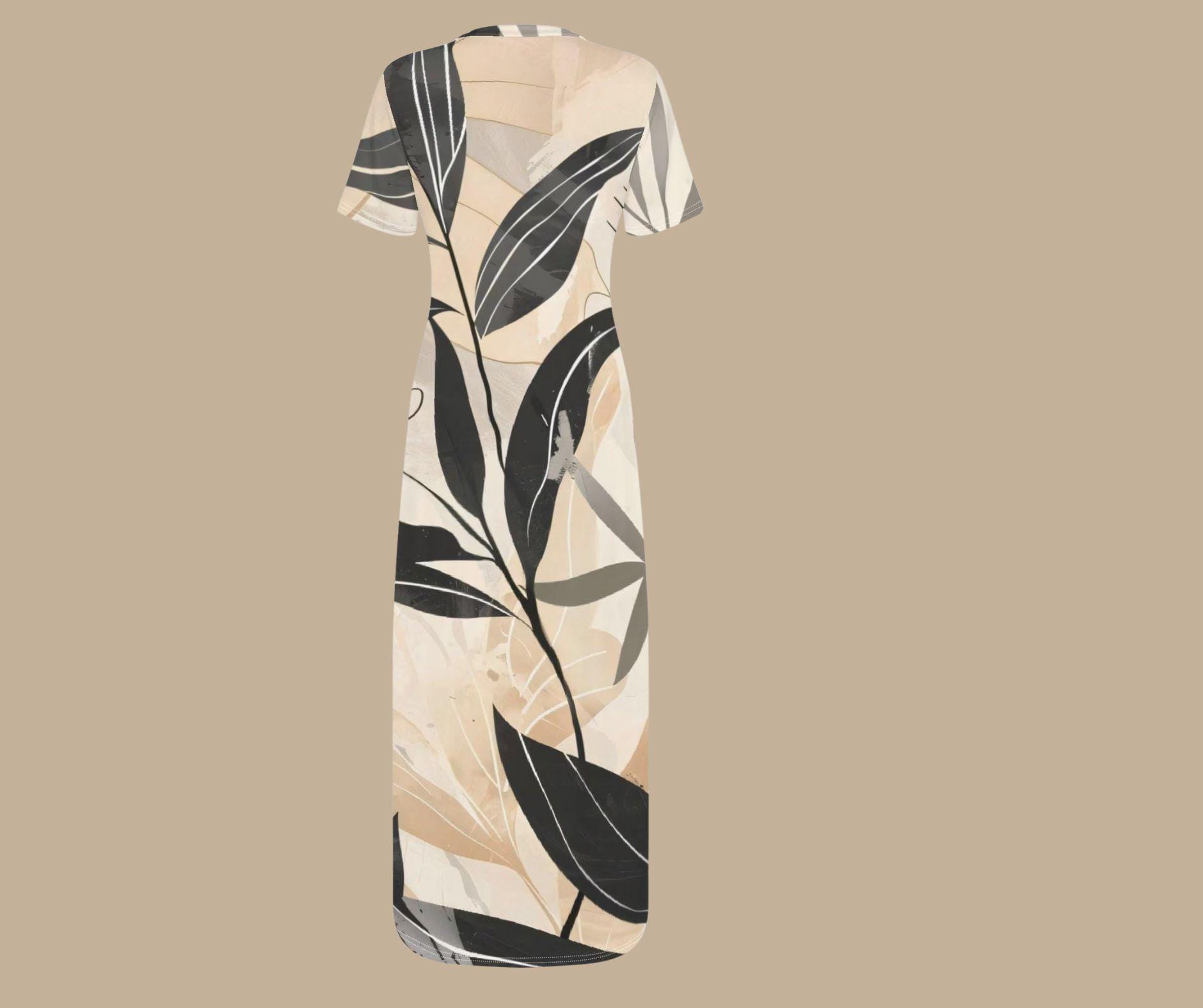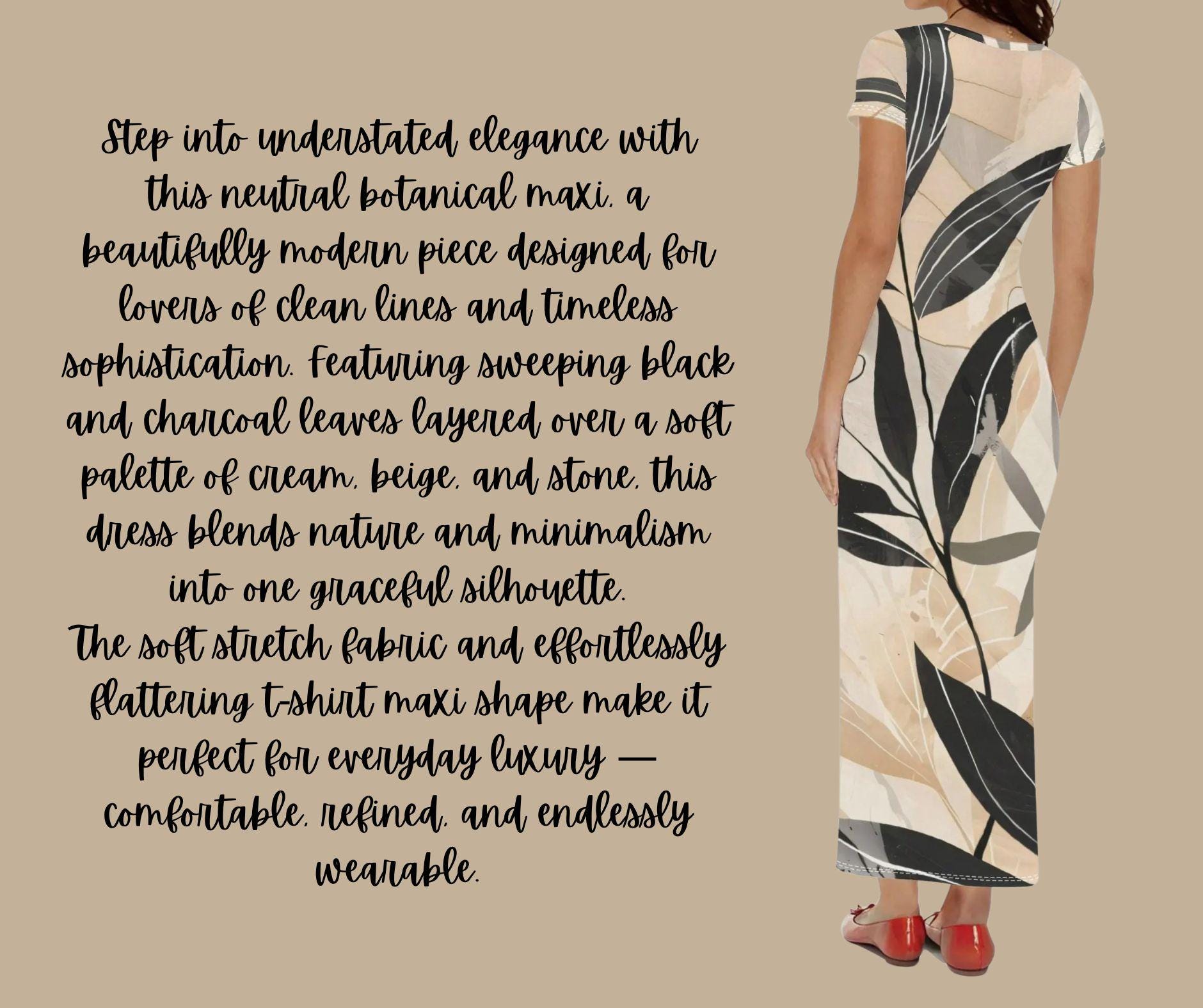 Step into understated elegance with this neutral botanical maxi, a beautifully modern piece designed for lovers of clean lines and timeless sophistication. Featuring sweeping black and charcoal leaves layered over a soft palette of cream, beige, and stone, this dress blends nature and minimalism into one graceful silhouette.
