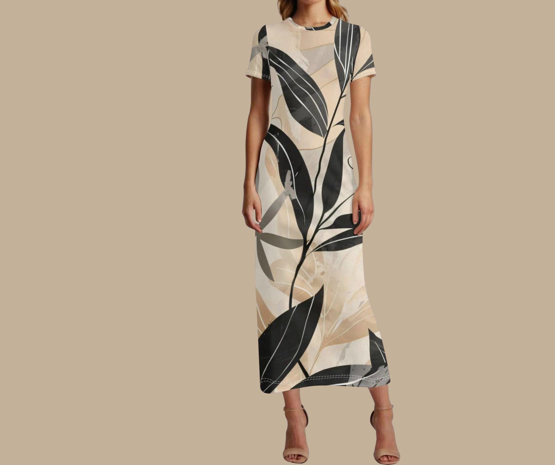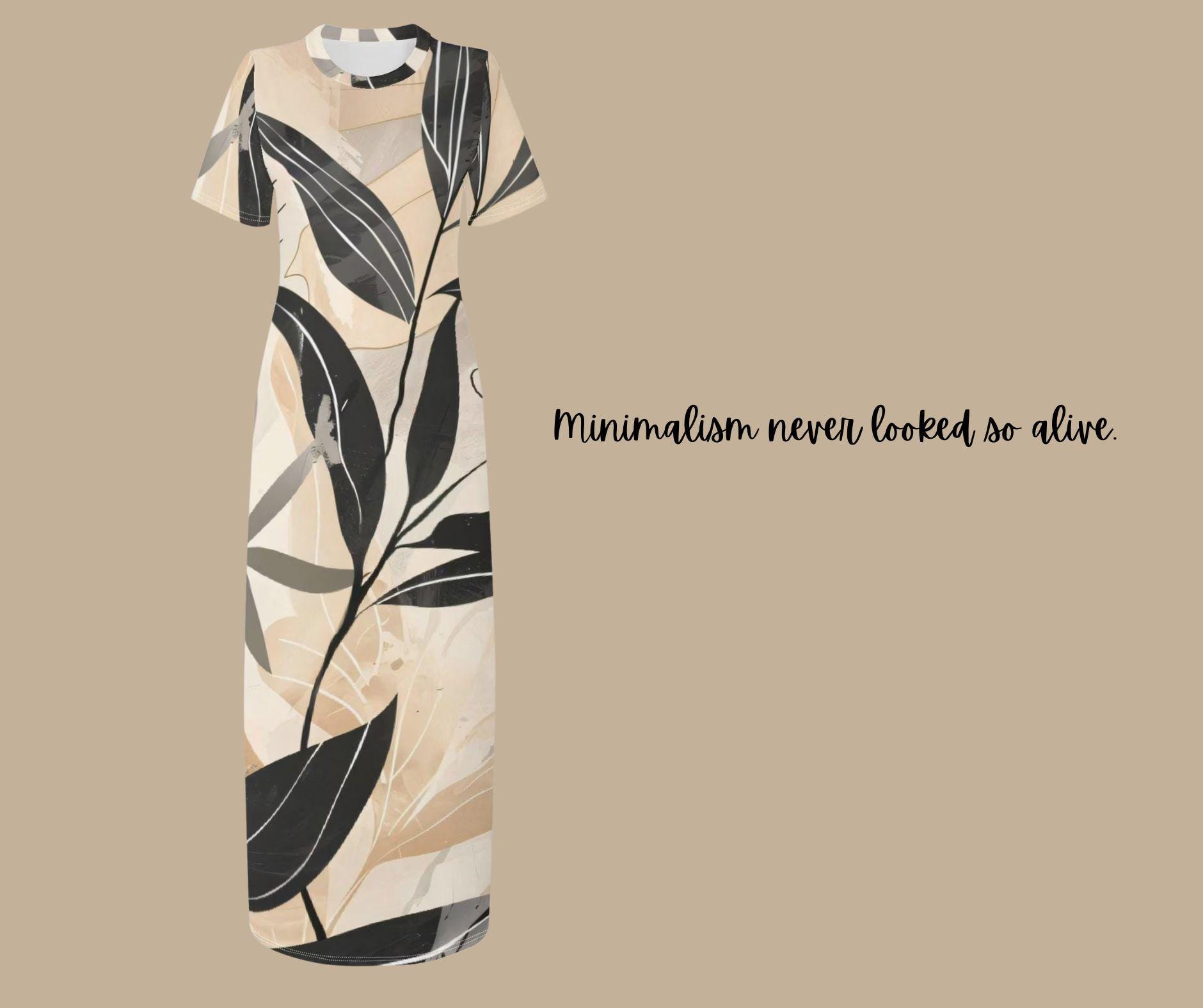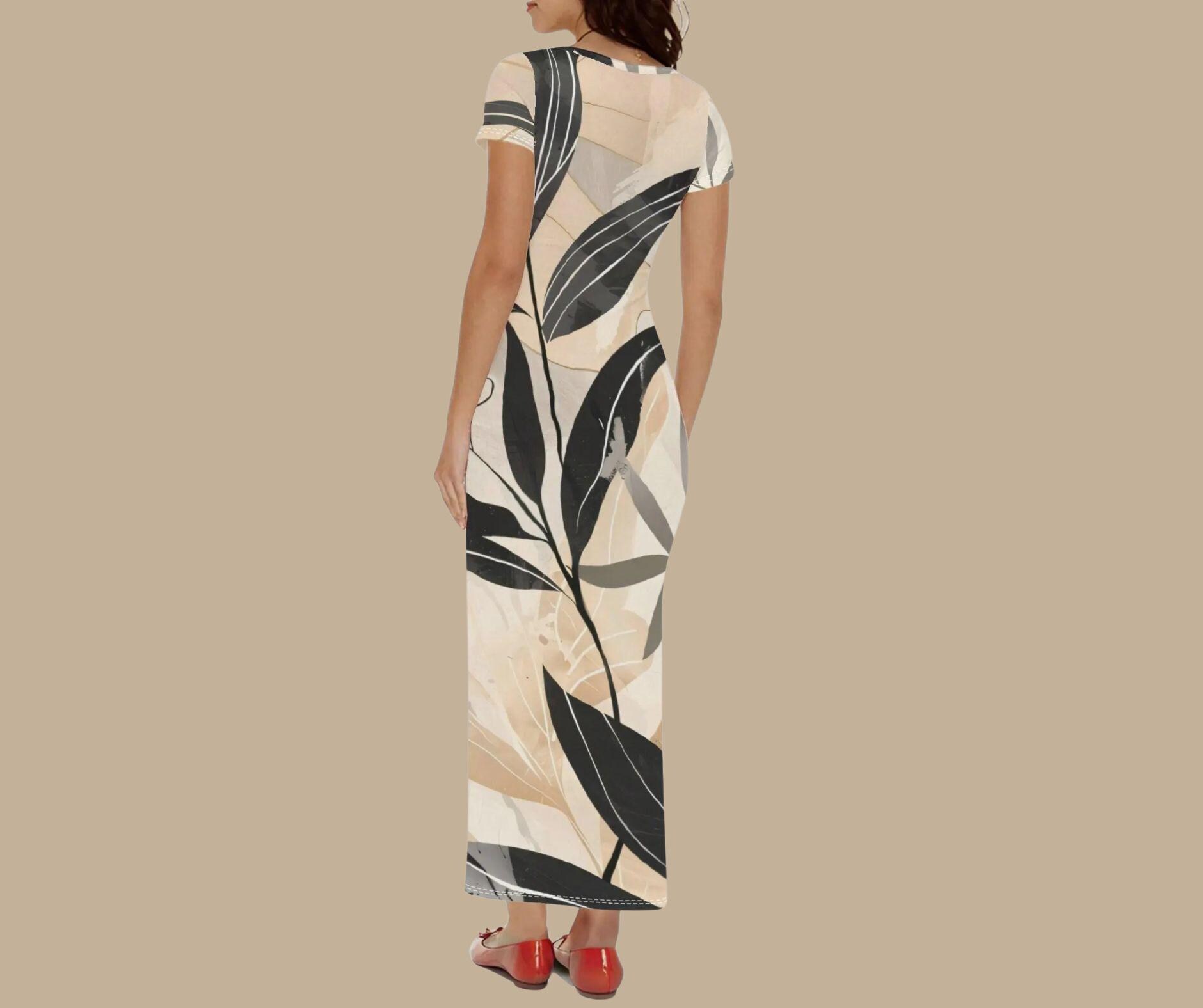 Step into understated elegance with this neutral botanical maxi, a beautifully modern piece designed for lovers of clean lines and timeless sophistication. Featuring sweeping black and charcoal leaves layered over a soft palette of cream, beige, and stone, this dress blends nature and minimalism into one graceful silhouette.
