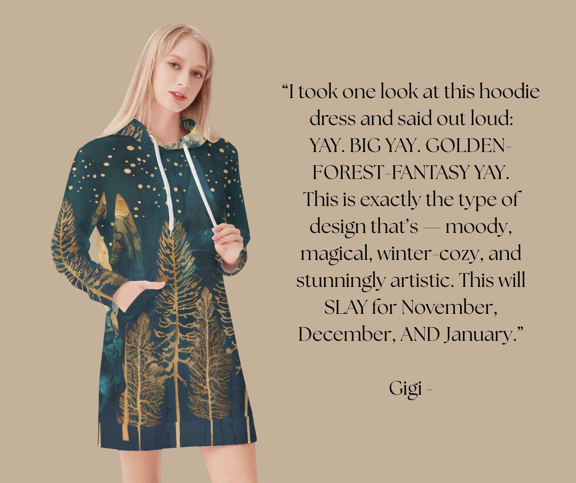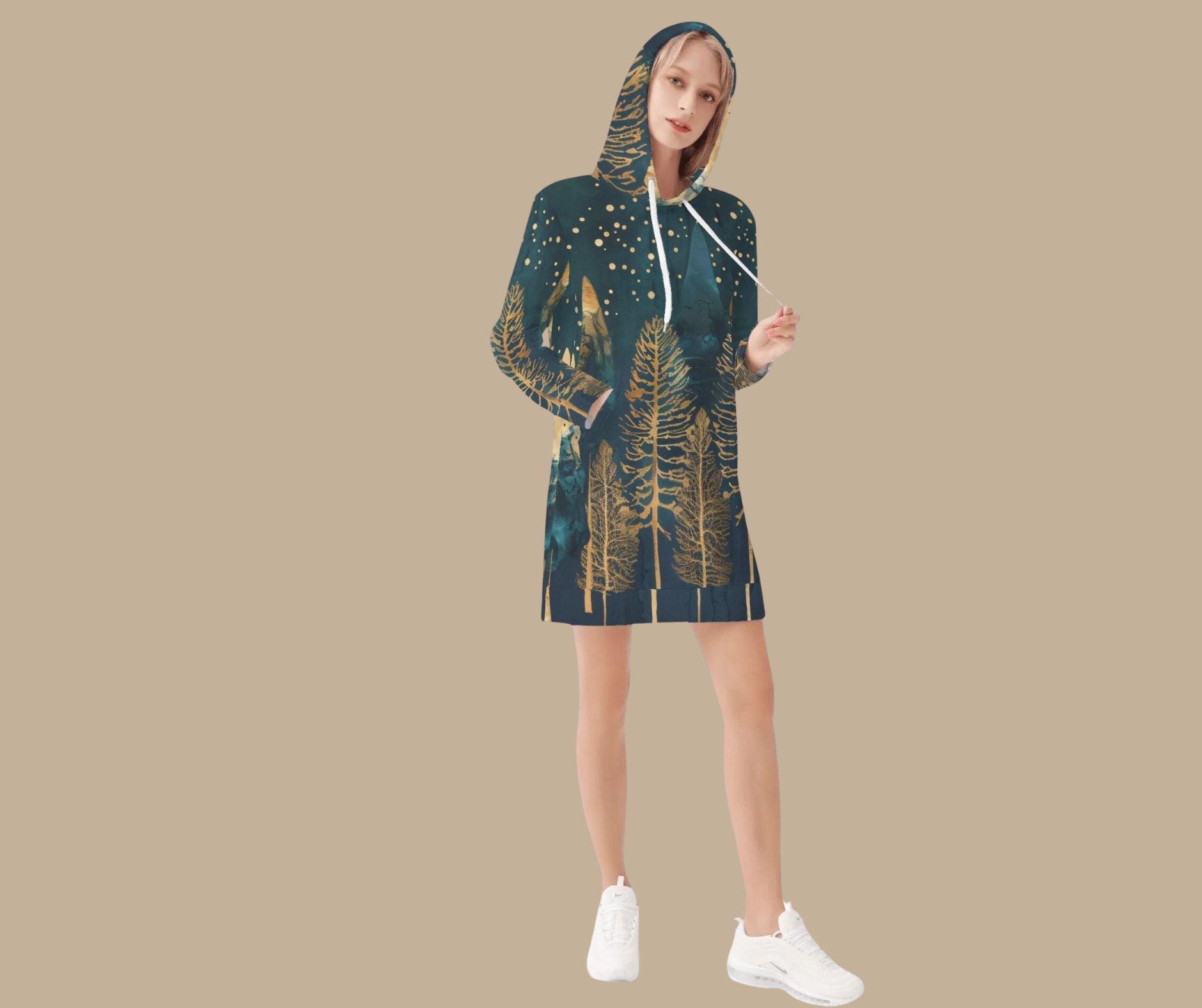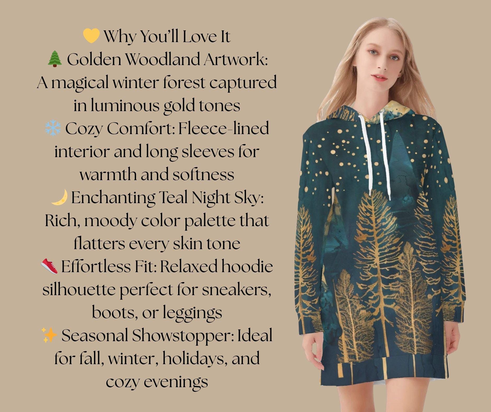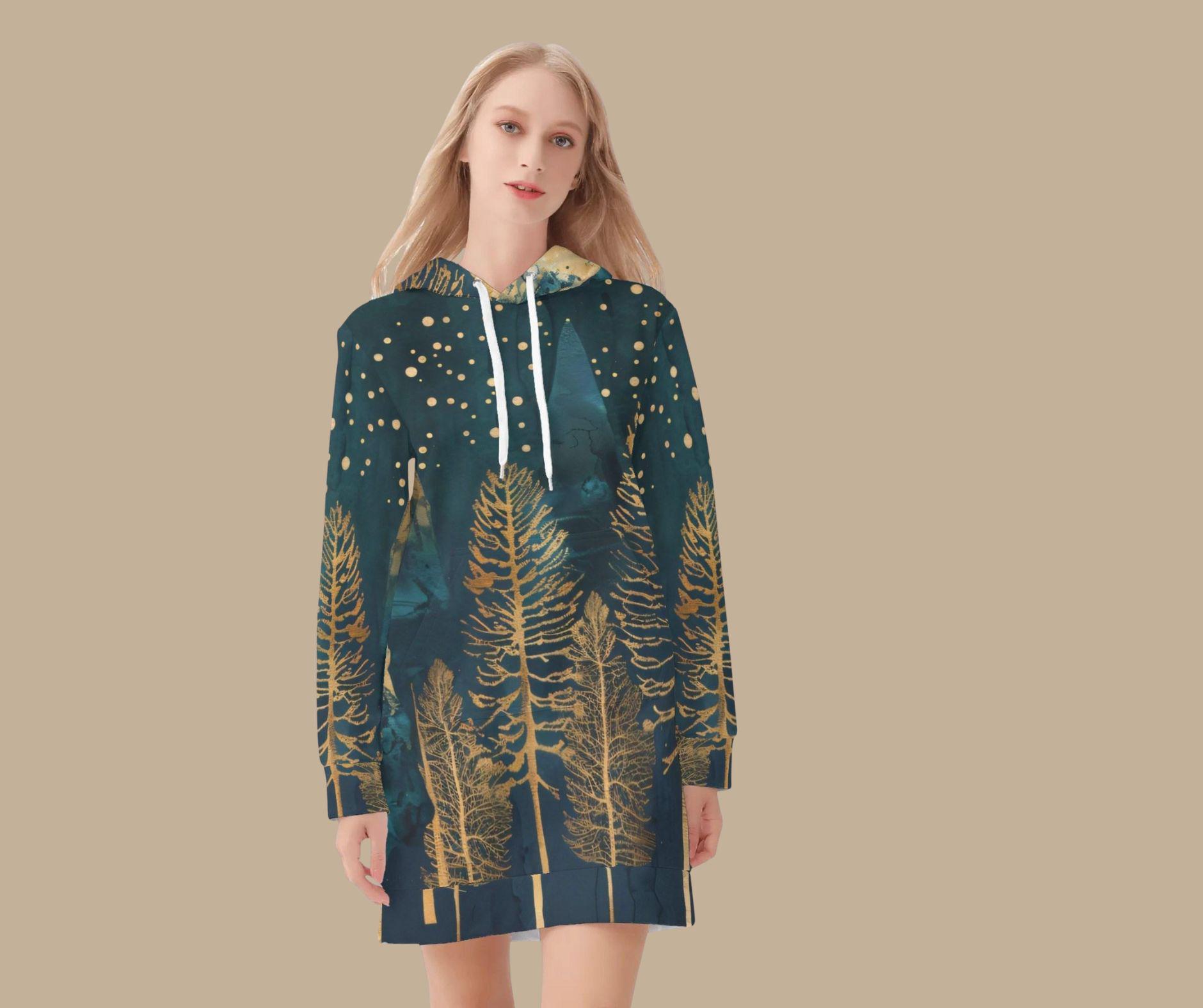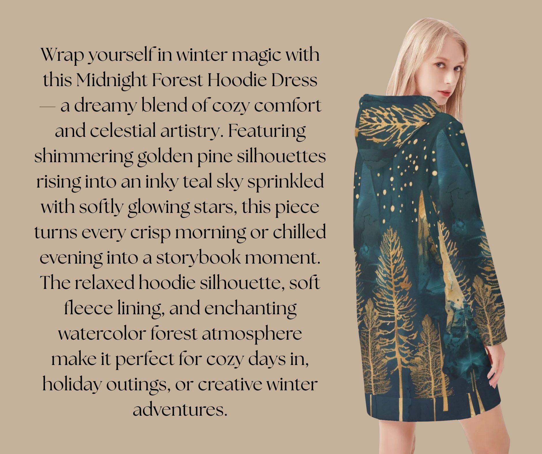 Wrap yourself in winter magic with this Midnight Forest Hoodie Dress — a dreamy blend of cozy comfort and celestial artistry. Featuring shimmering golden pine silhouettes rising into an inky teal sky sprinkled with softly glowing stars, this piece turns every crisp morning or chilled evening into a storybook moment.