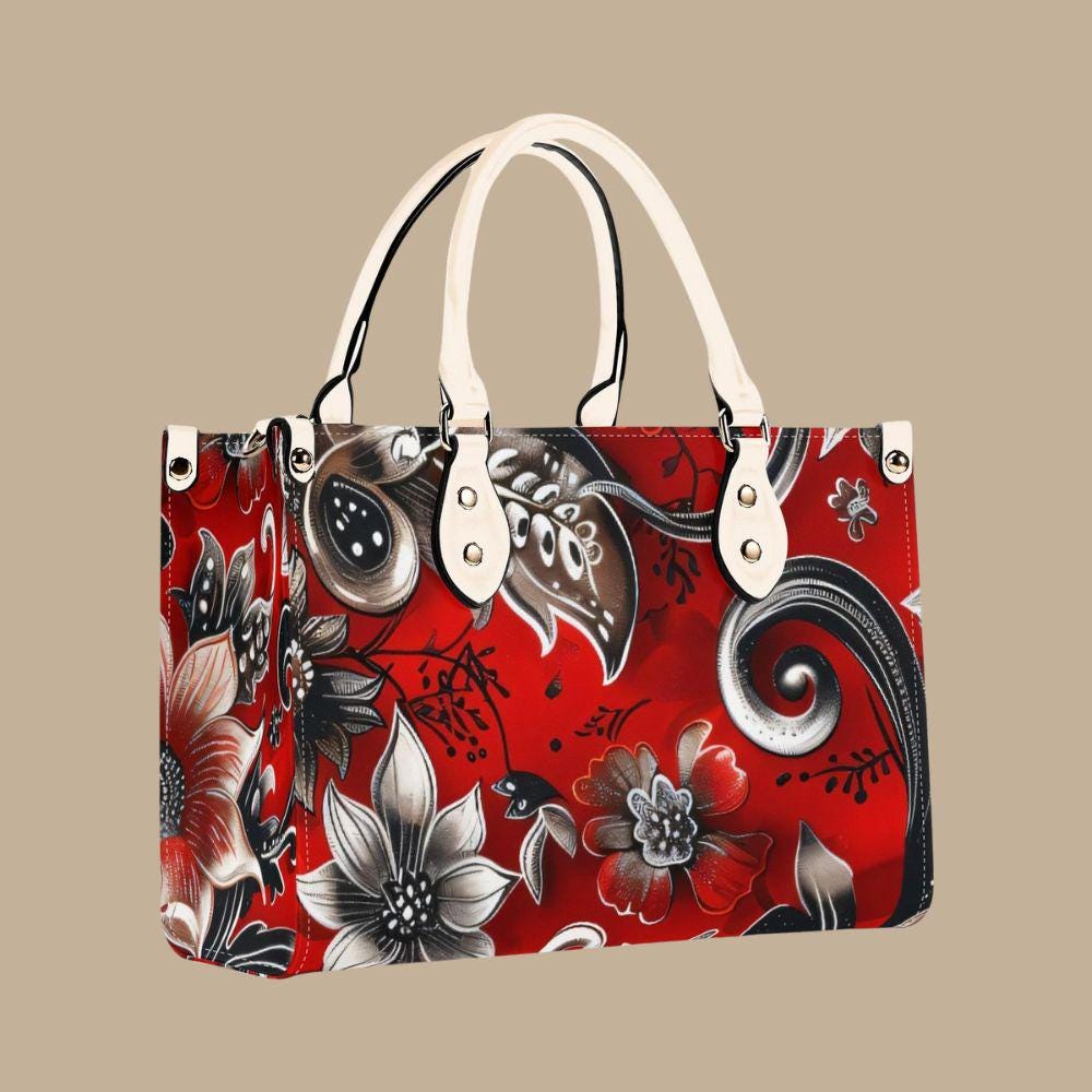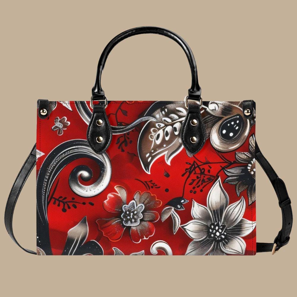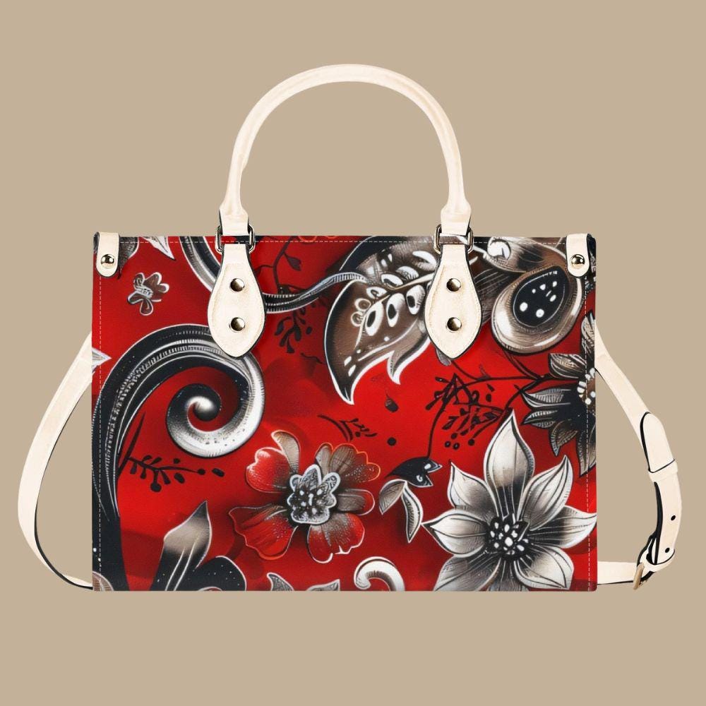 This striking handbag is crafted from genuine top-grain leather, designed for women who love bold color, confident style, and timeless craftsmanship. Featuring a rich red background with flowing black, ivory, and taupe floral scrollwork, this structured tote makes an unforgettable statement while remaining elegant and wearable.