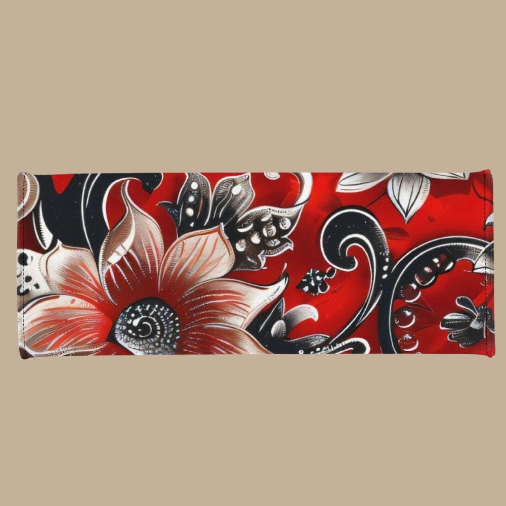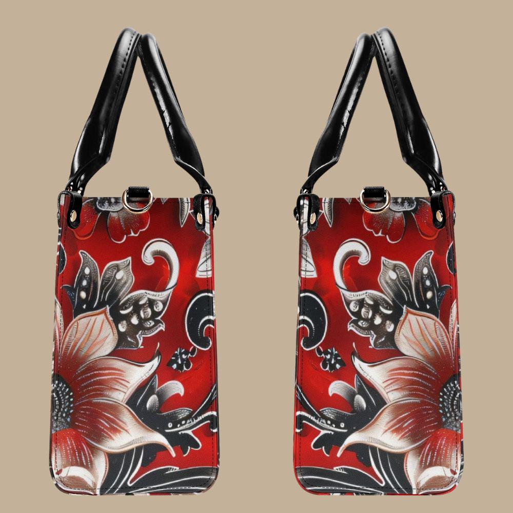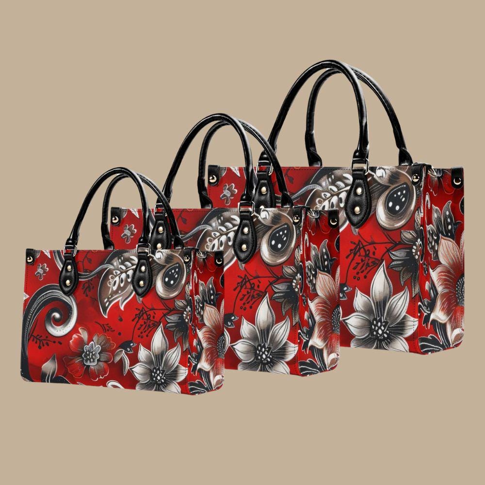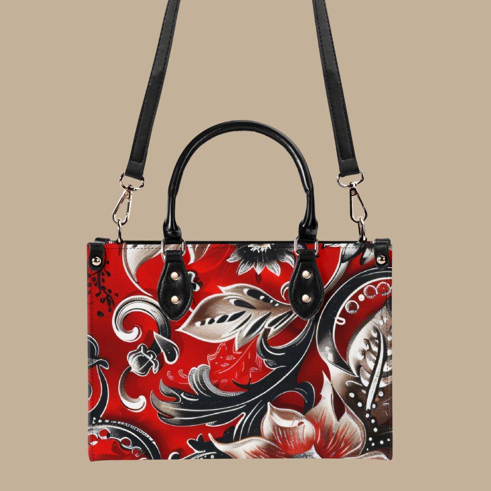 This striking handbag is crafted from genuine top-grain leather, designed for women who love bold color, confident style, and timeless craftsmanship. Featuring a rich red background with flowing black, ivory, and taupe floral scrollwork, this structured tote makes an unforgettable statement while remaining elegant and wearable.