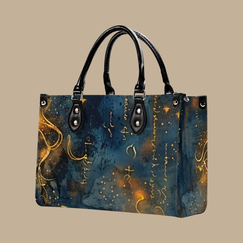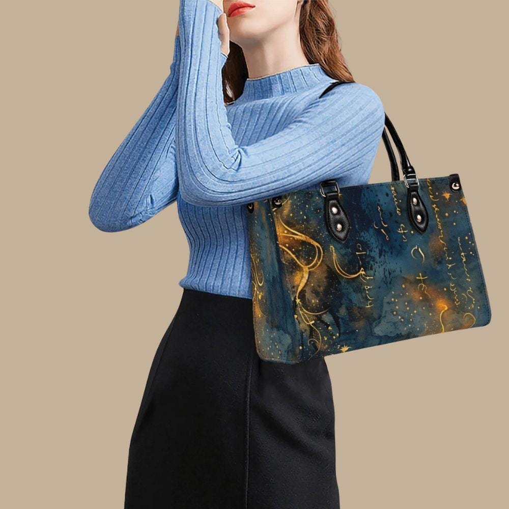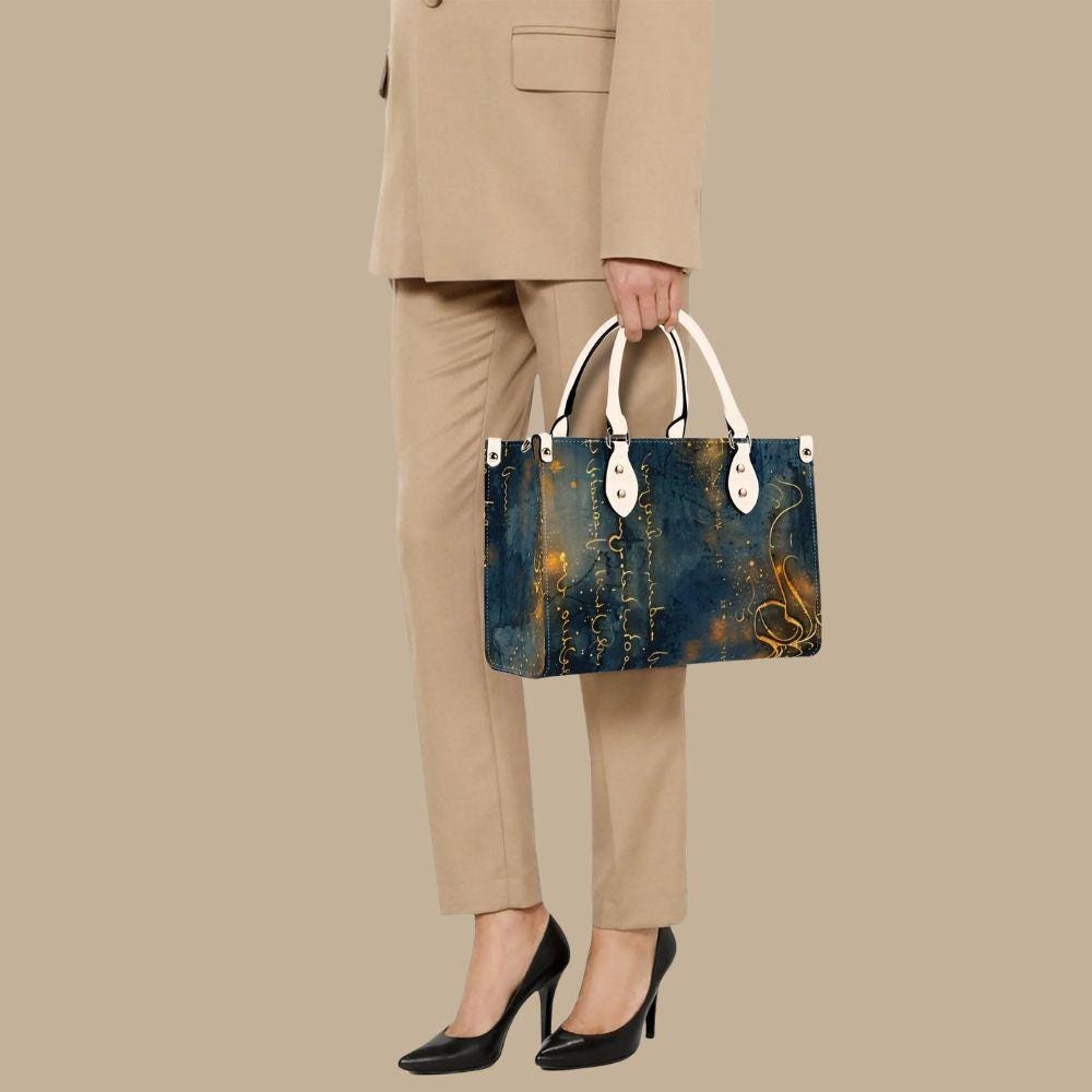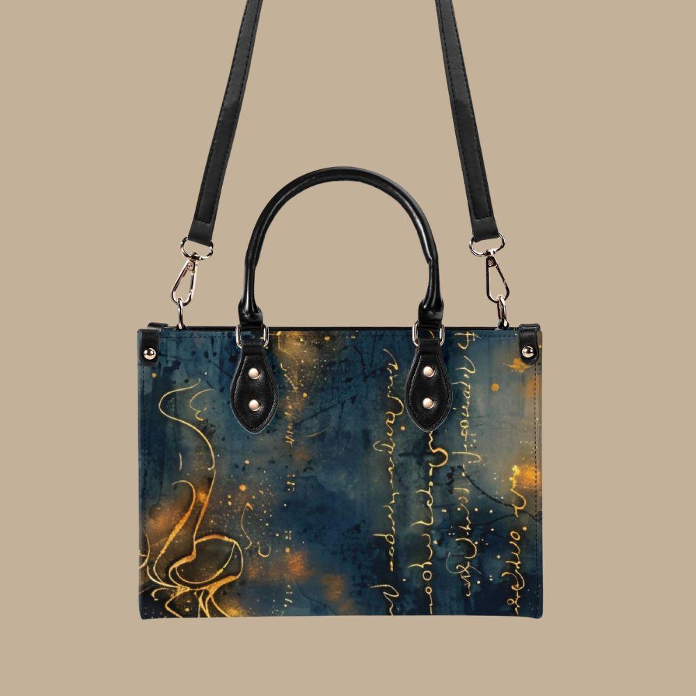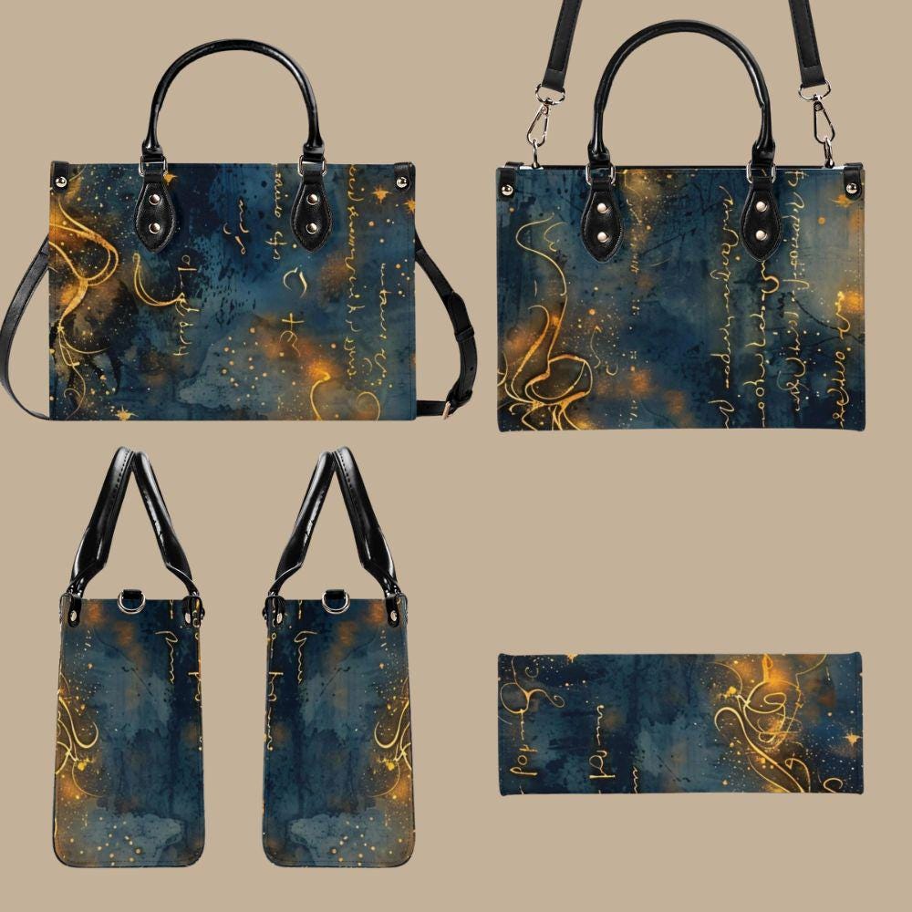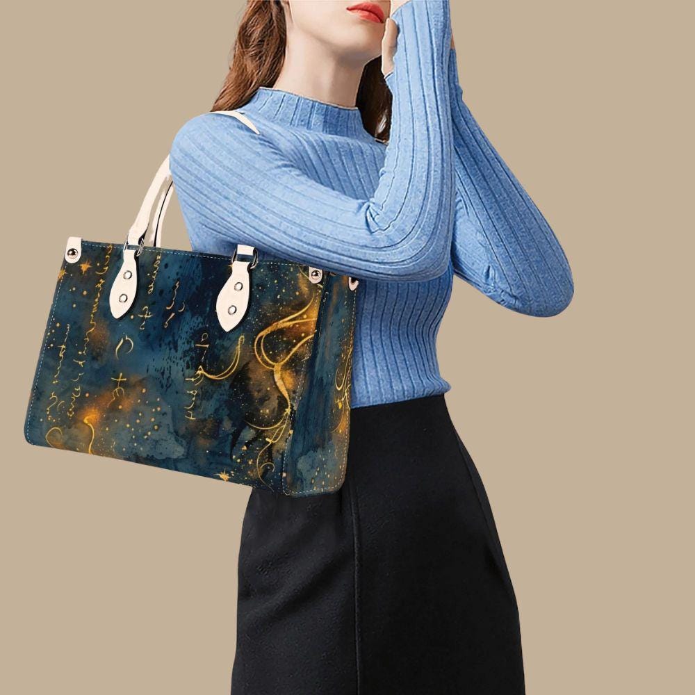 This luxury handbag is crafted from genuine top-grain leather, designed for women who appreciate artful details and refined craftsmanship. Featuring a deep blue background with flowing gold script, abstract markings, and luminous accents, this structured tote feels celestial, expressive, and timeless.