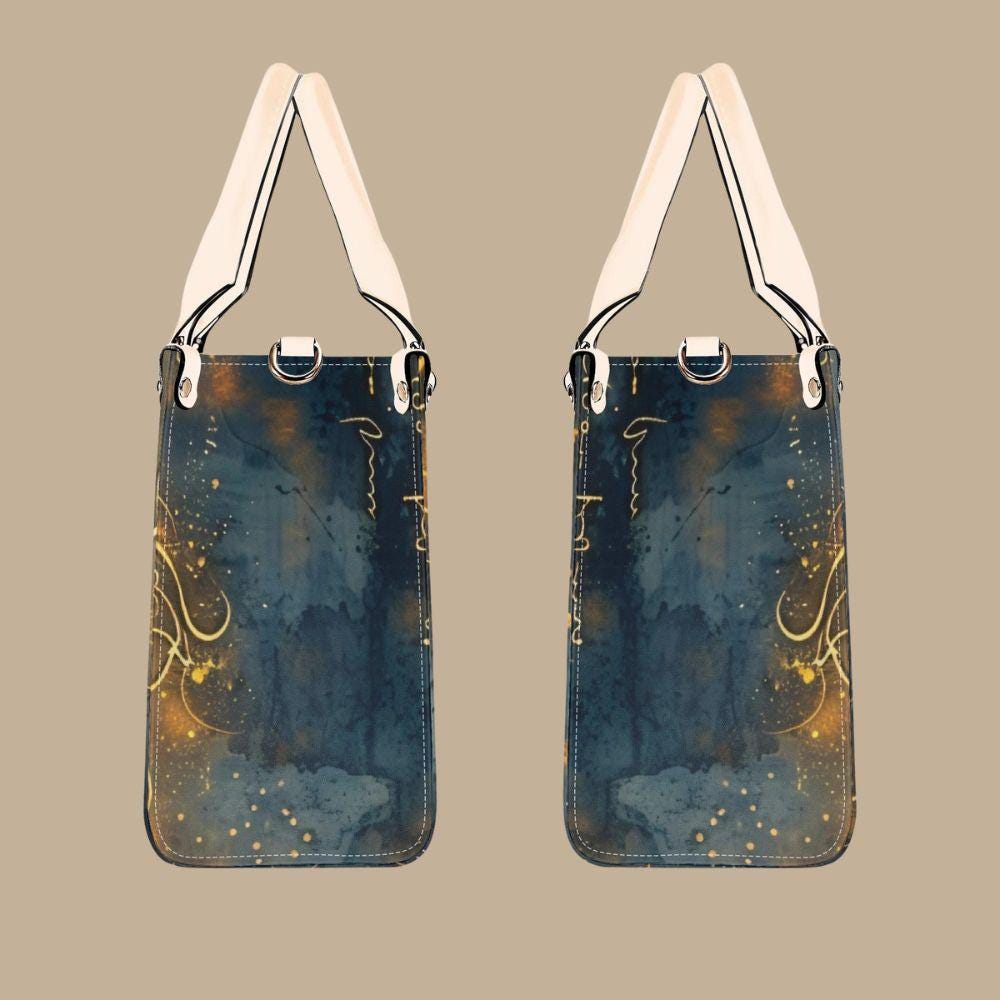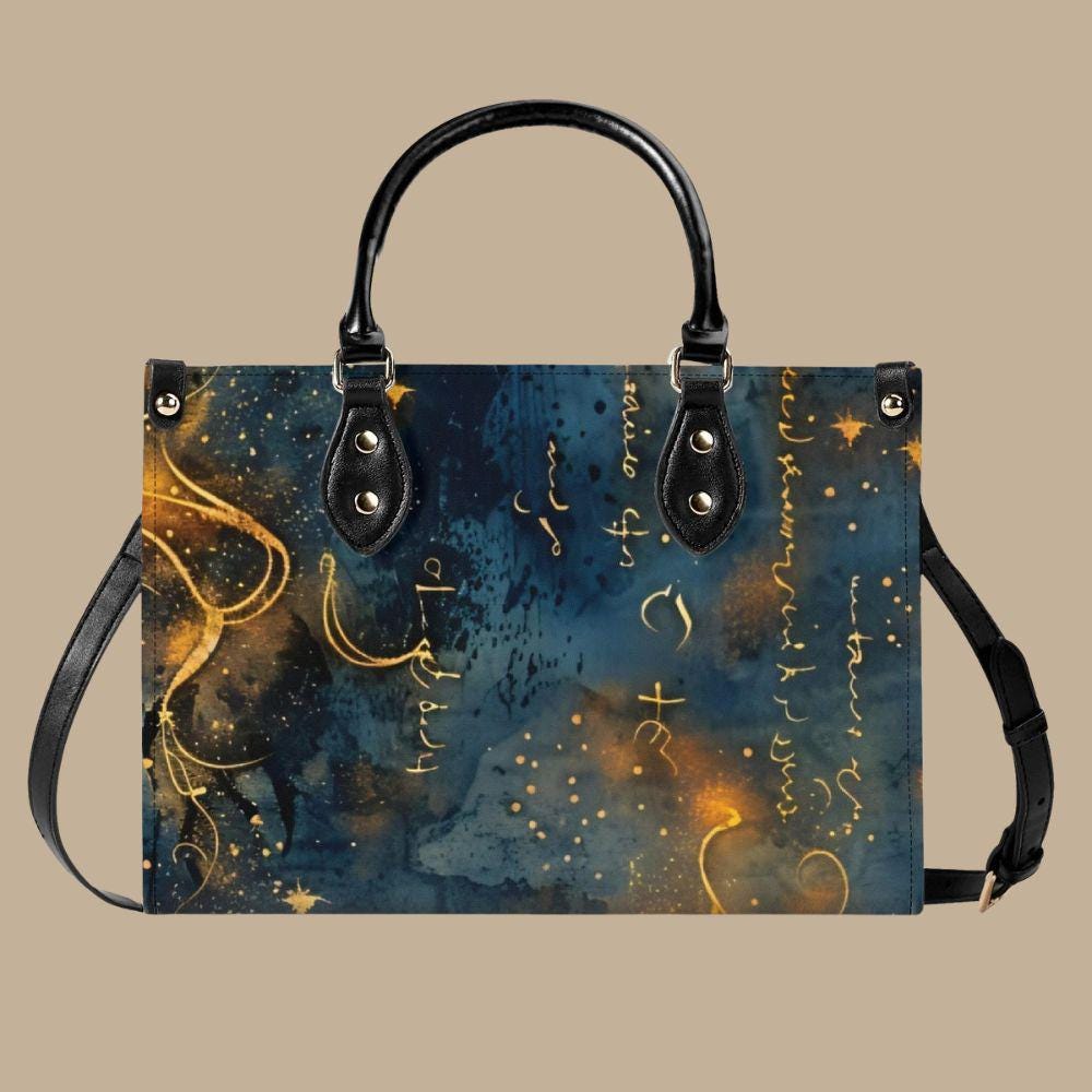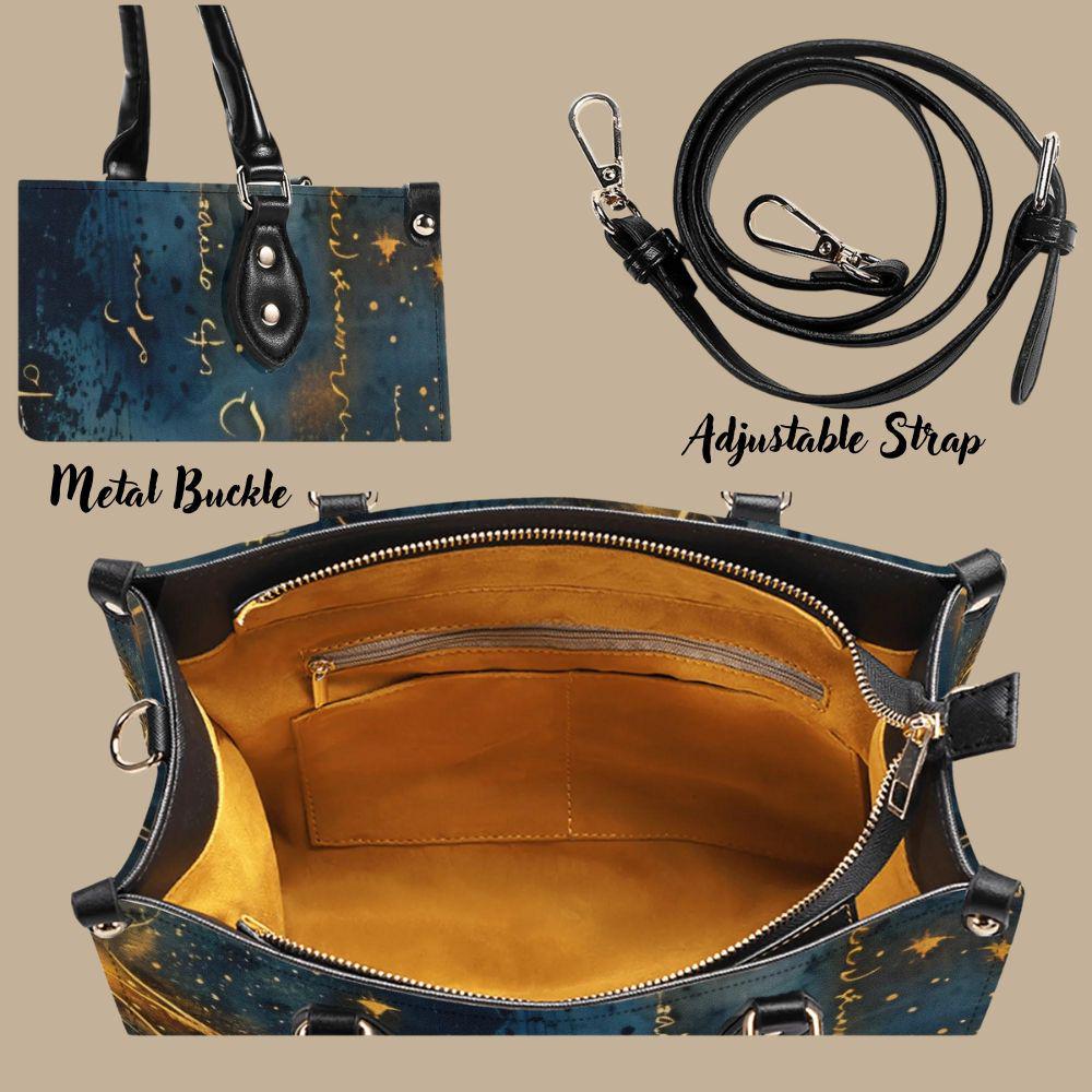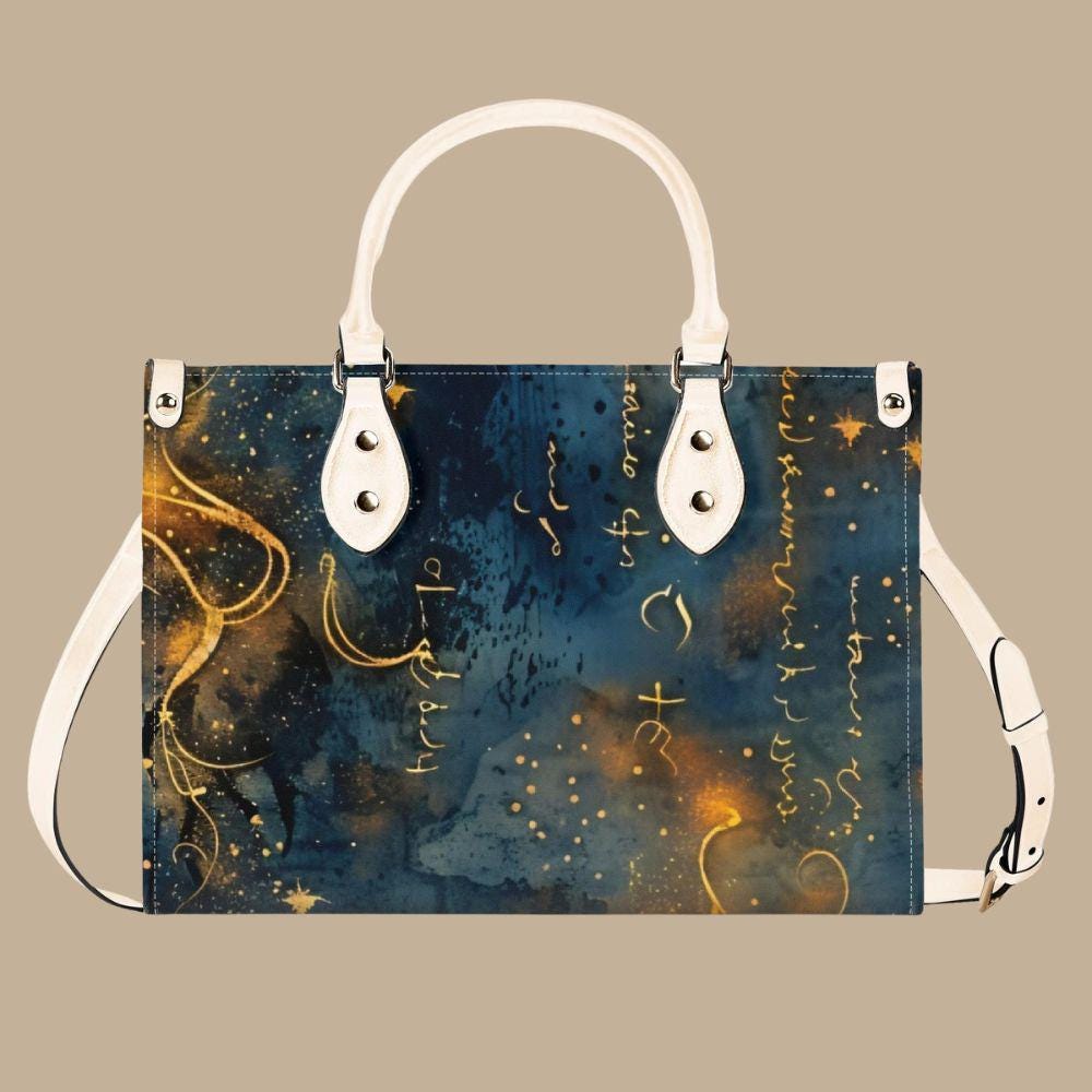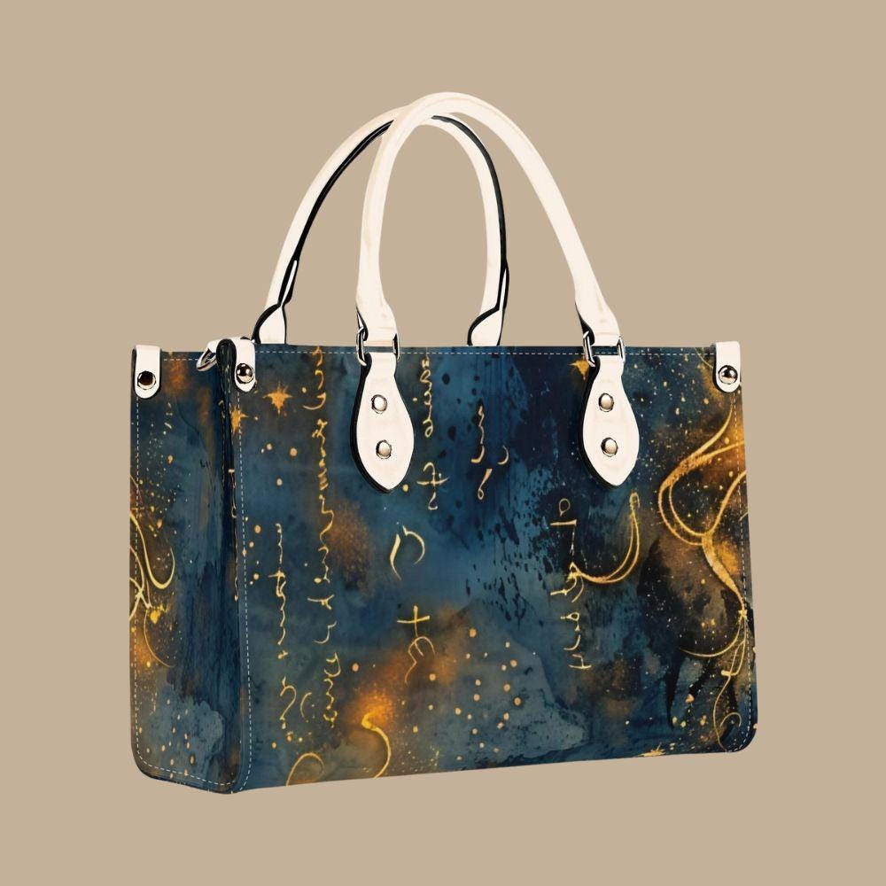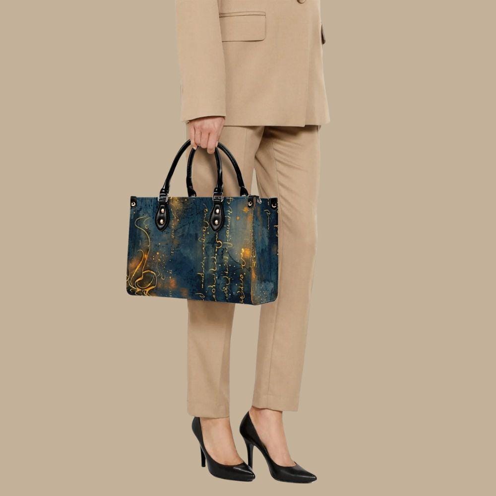 This luxury handbag is crafted from genuine top-grain leather, designed for women who appreciate artful details and refined craftsmanship. Featuring a deep blue background with flowing gold script, abstract markings, and luminous accents, this structured tote feels celestial, expressive, and timeless.