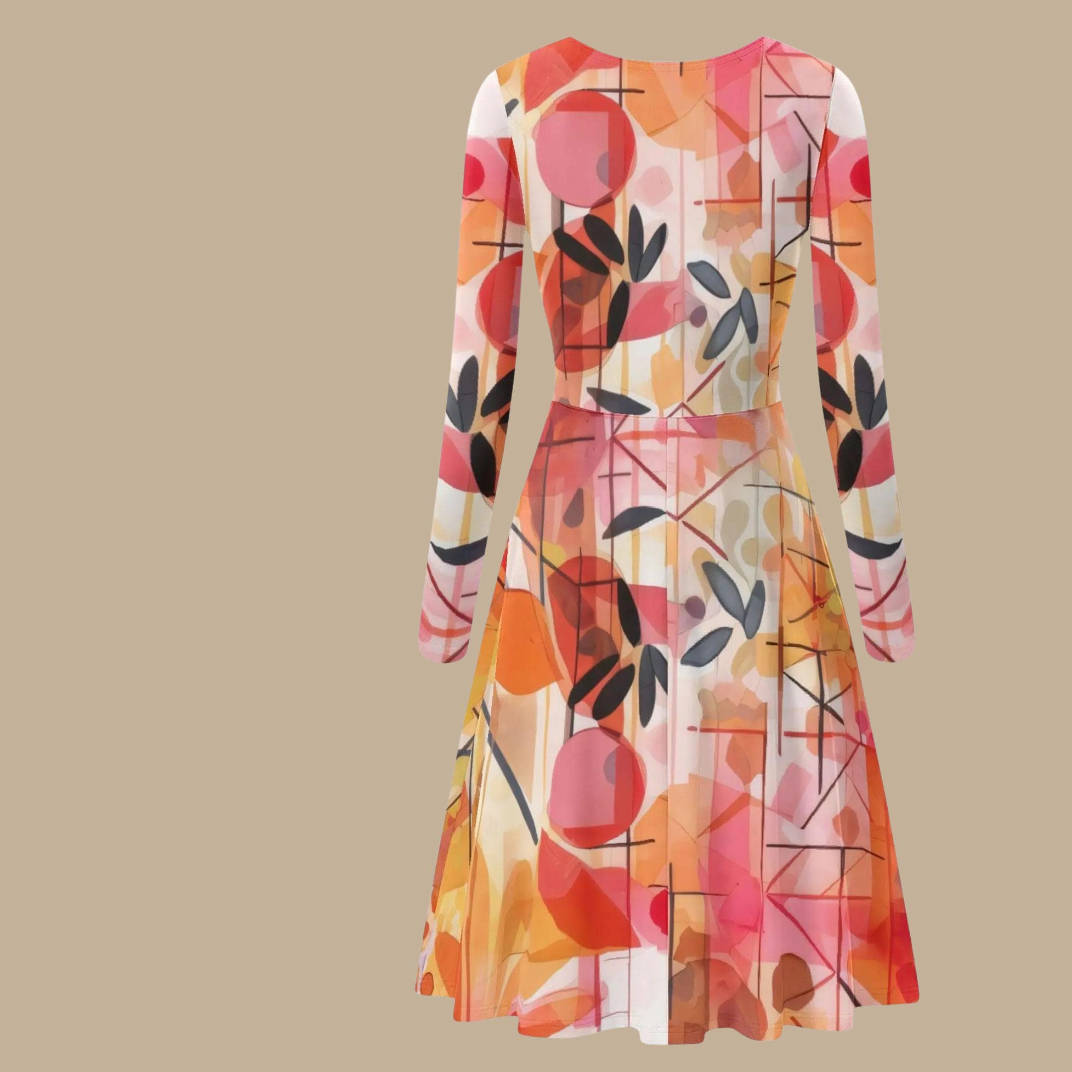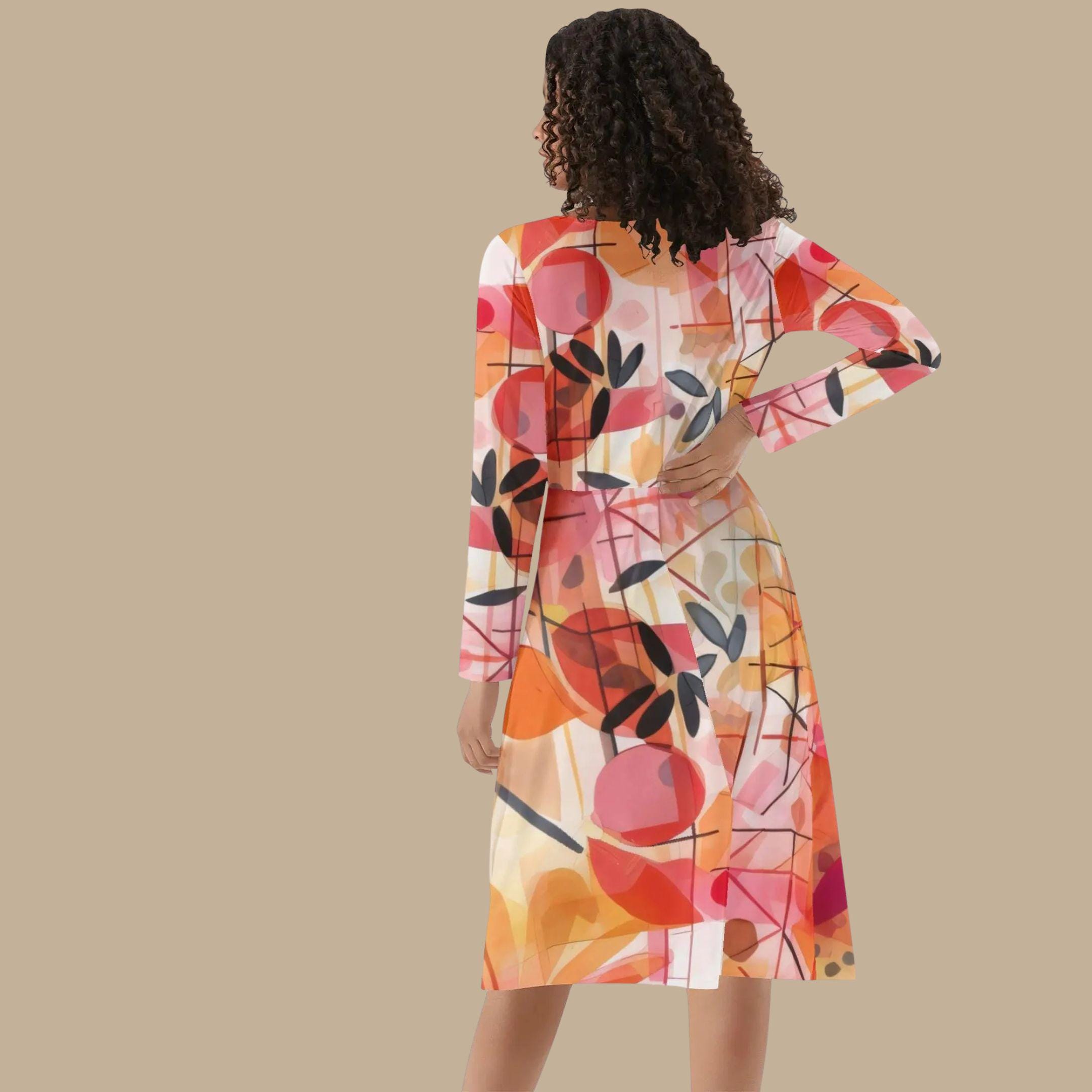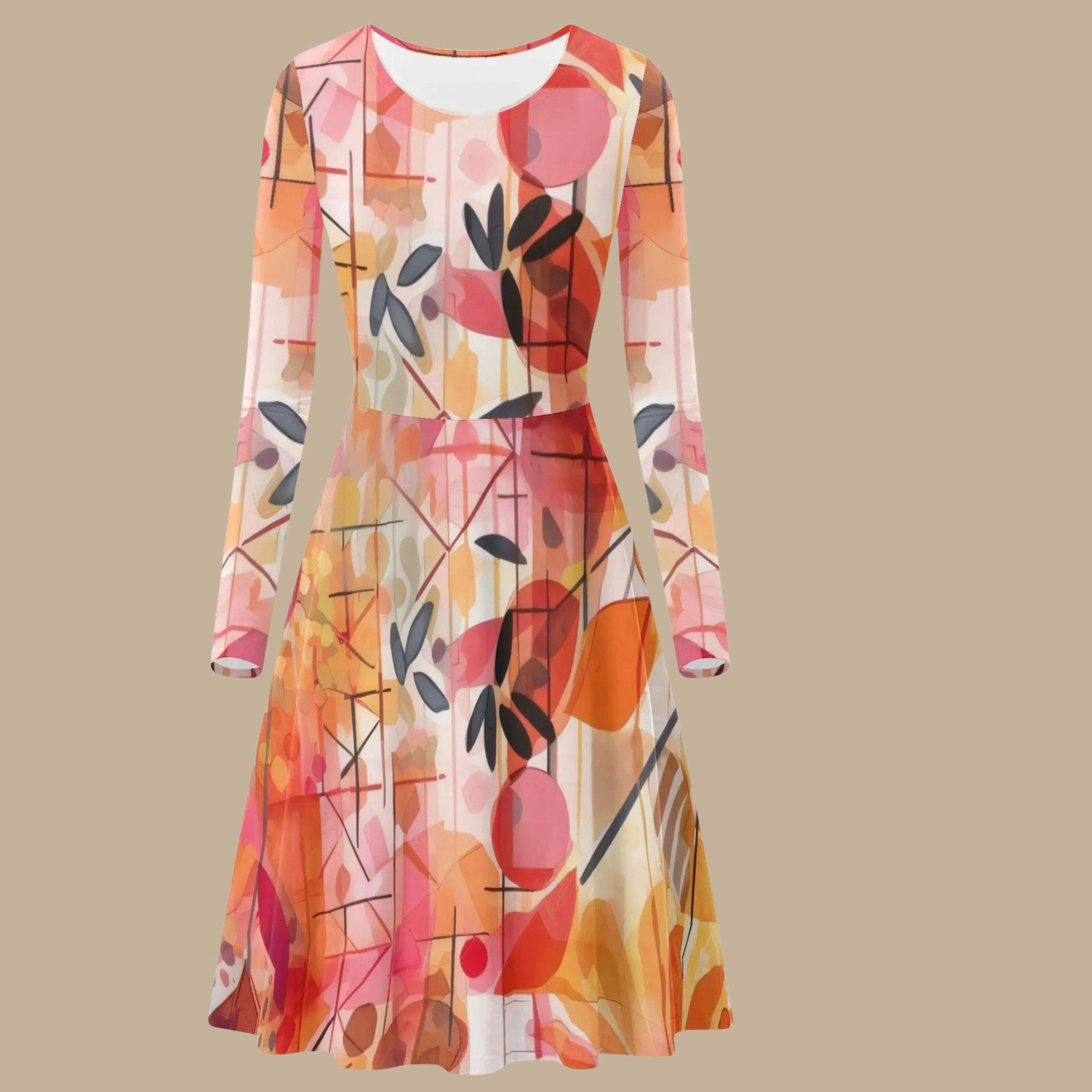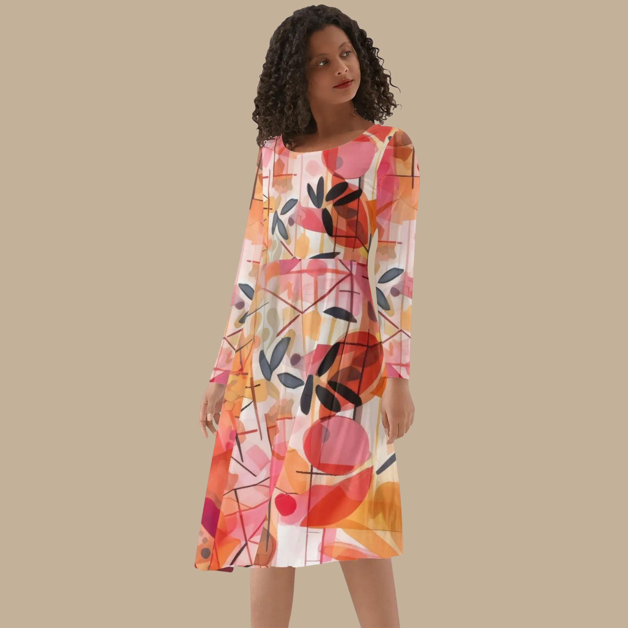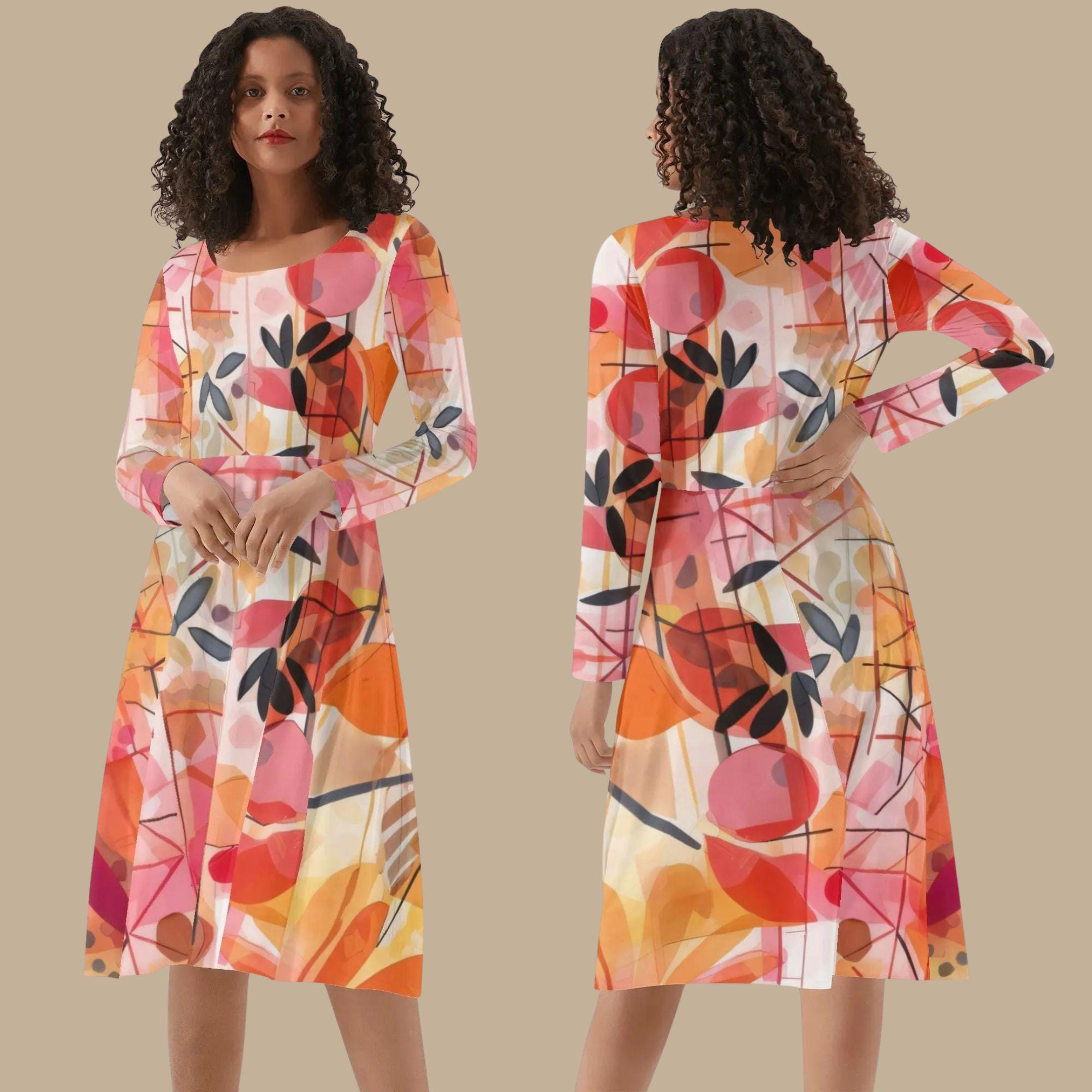 This scoop neck long sleeve midi dress combines artistic abstraction with wearable elegance. Featuring the same signature painterly floral print in warm coral, sunset orange, blush, and charcoal accents, this silhouette adds graceful long sleeves for a polished, transitional look.
