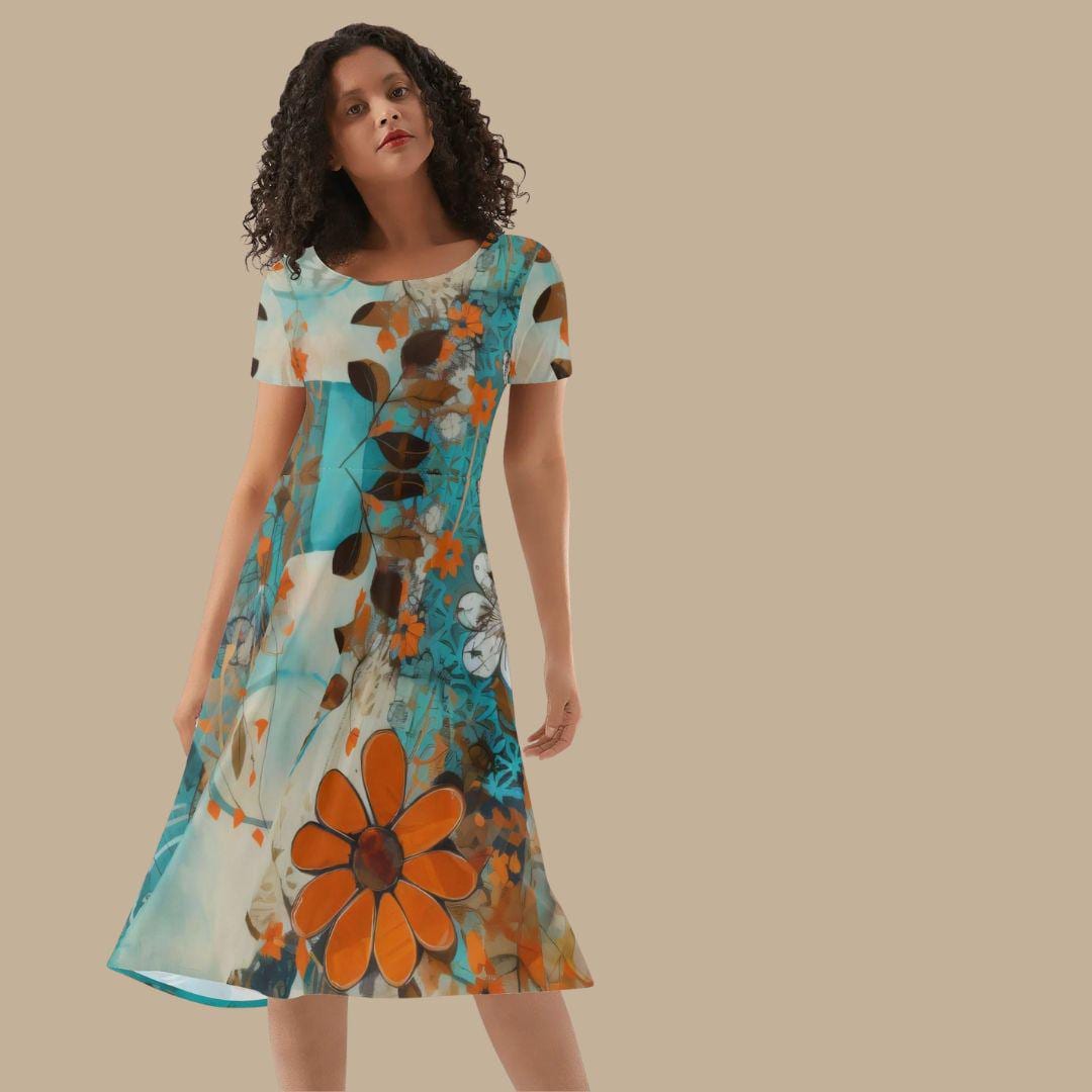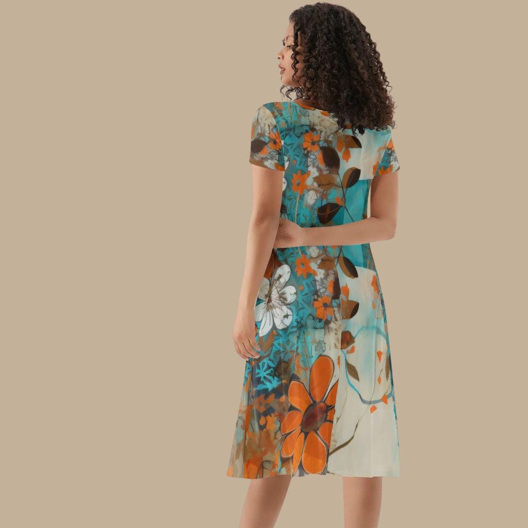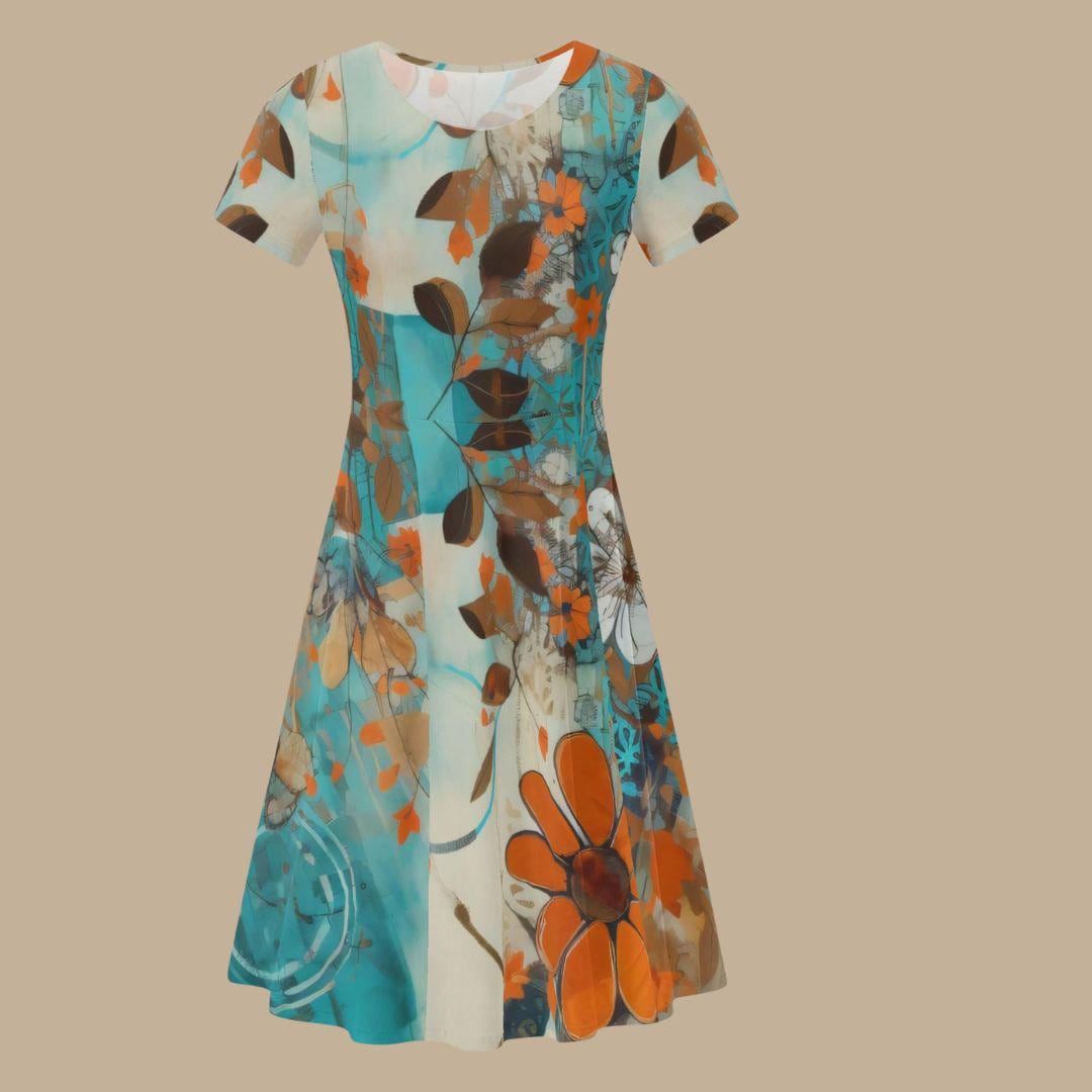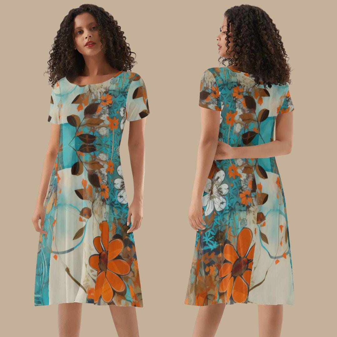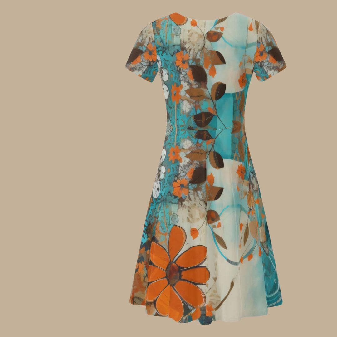Featuring a rich painterly floral print in vibrant burnt orange, deep teal, warm brown, and soft ivory, this knee-length dress blends retro charm with contemporary elegance. The round neckline and short sleeves create an easy, polished silhouette, while the subtle waist definition flatters your natural shape without clinging.