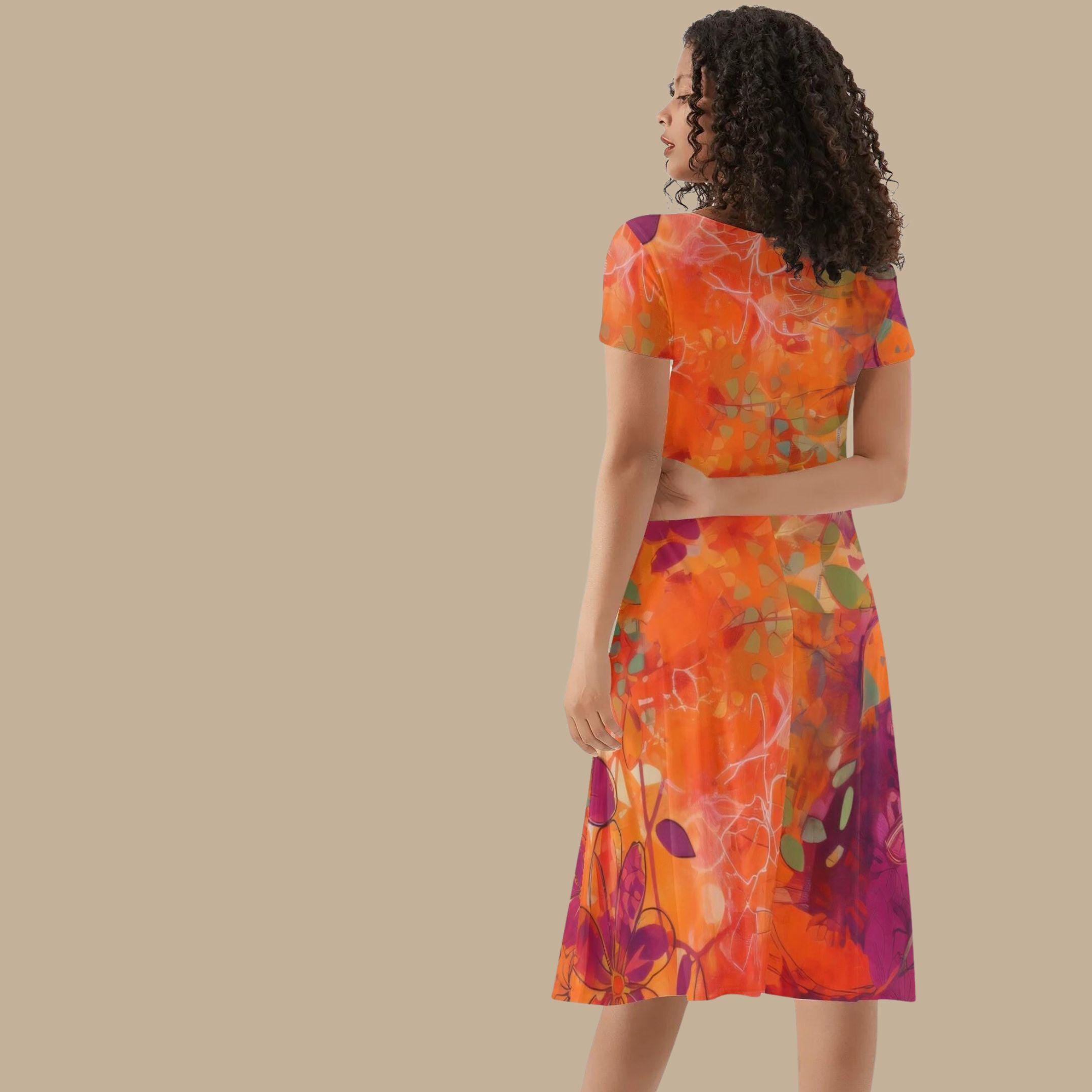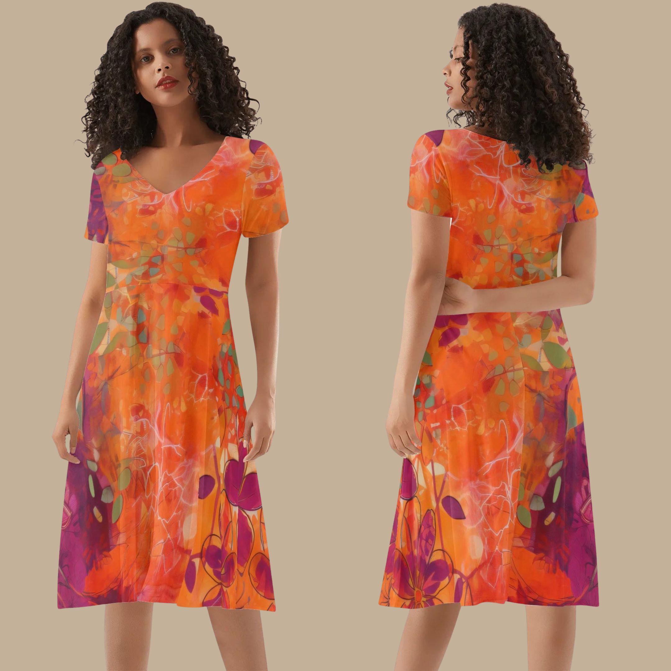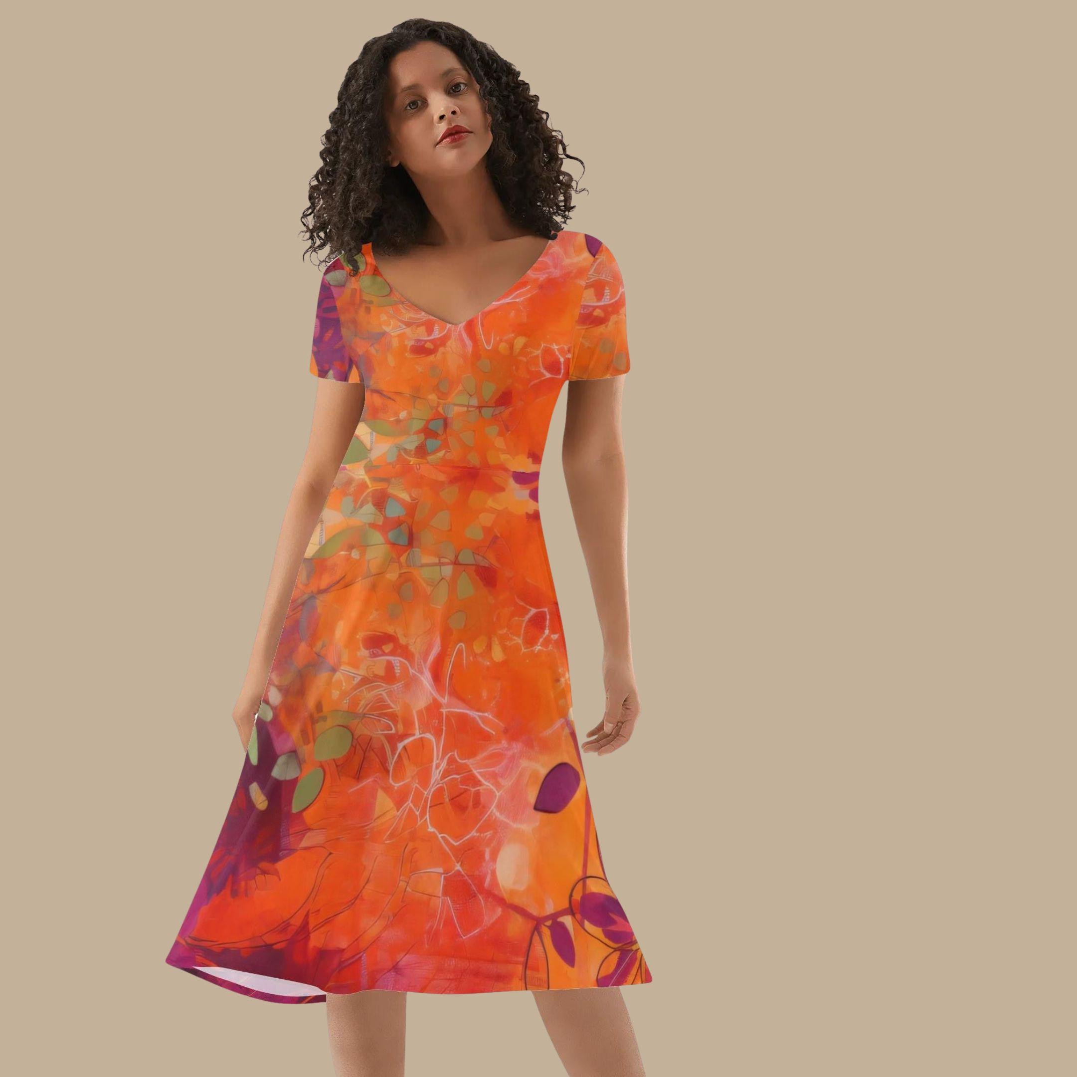 This orange abstract floral midi dress captures the warmth of sunset in wearable form. Layered with painterly florals, soft botanical overlays, and rich plum accents, the design feels expressive and alive — like art in motion.