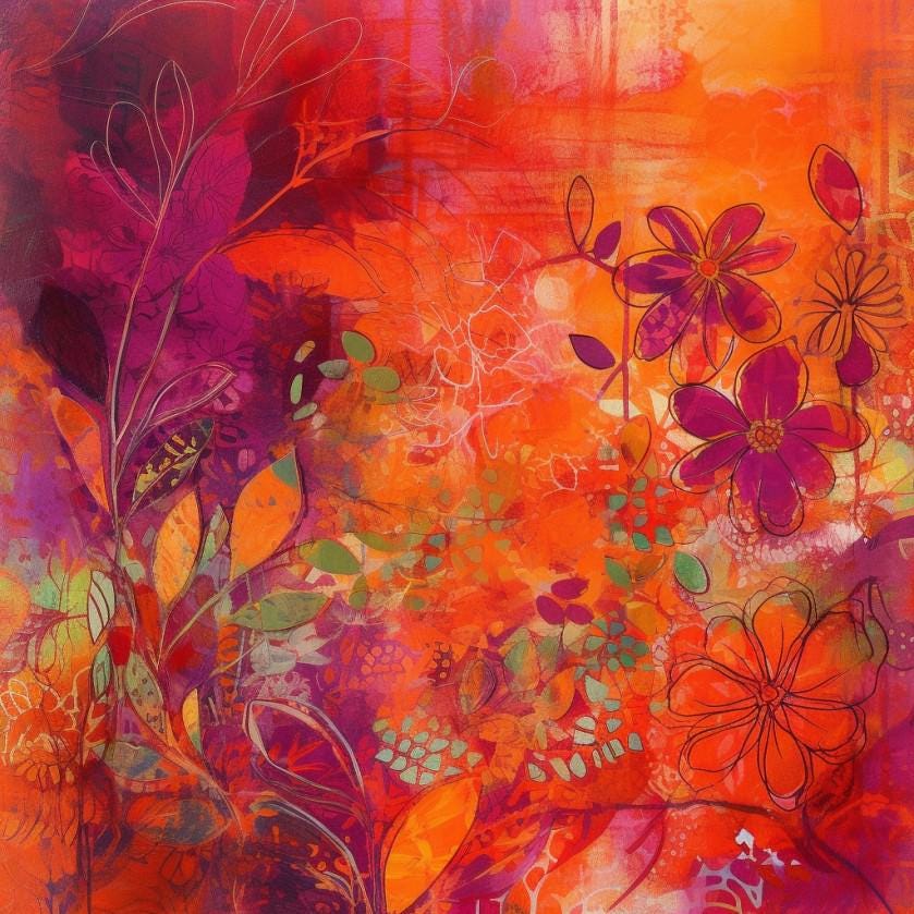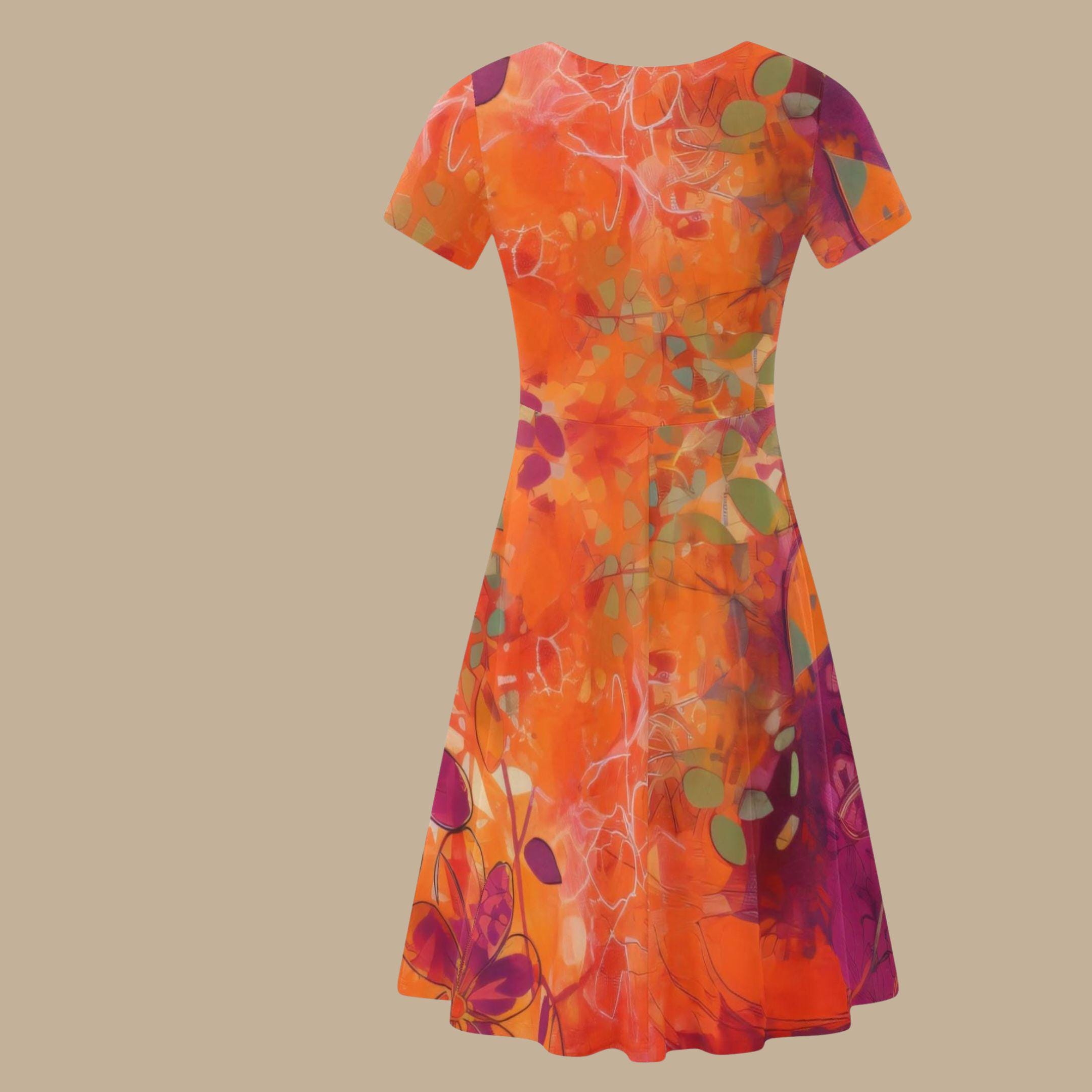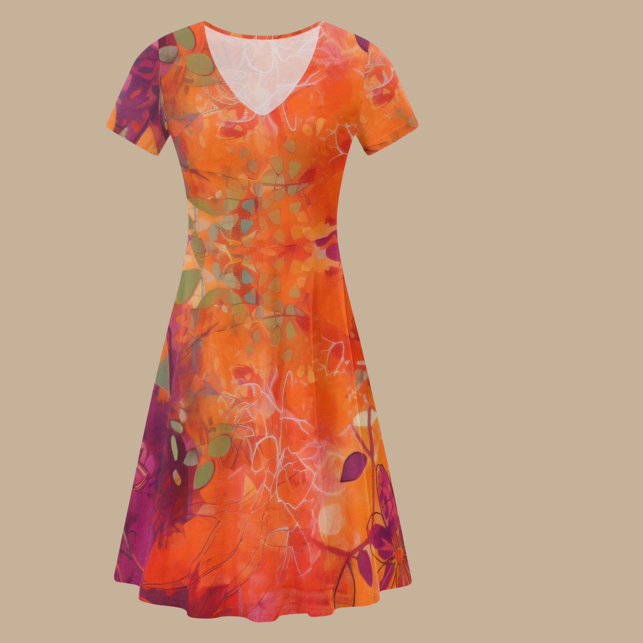 This orange abstract floral midi dress captures the warmth of sunset in wearable form. Layered with painterly florals, soft botanical overlays, and rich plum accents, the design feels expressive and alive — like art in motion.