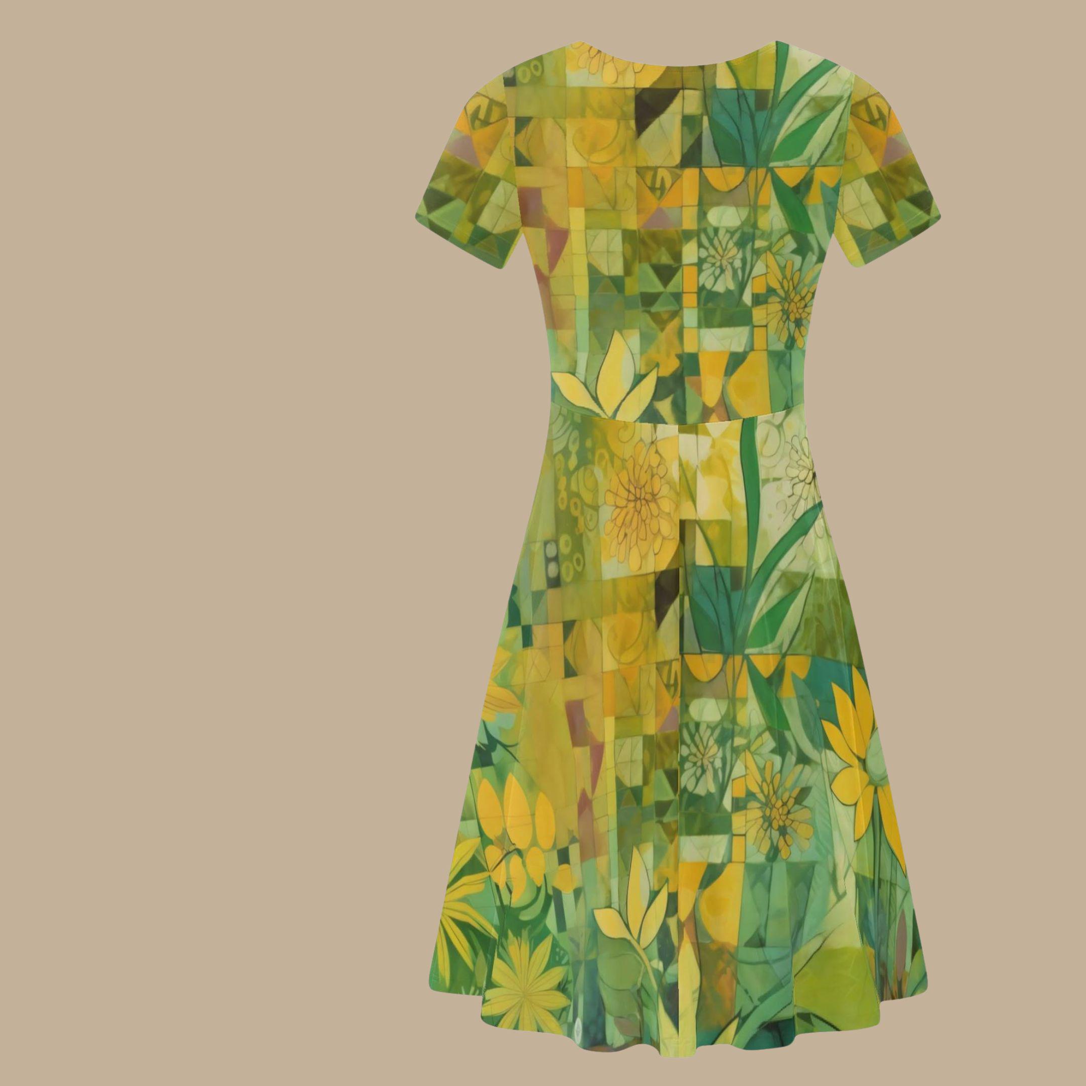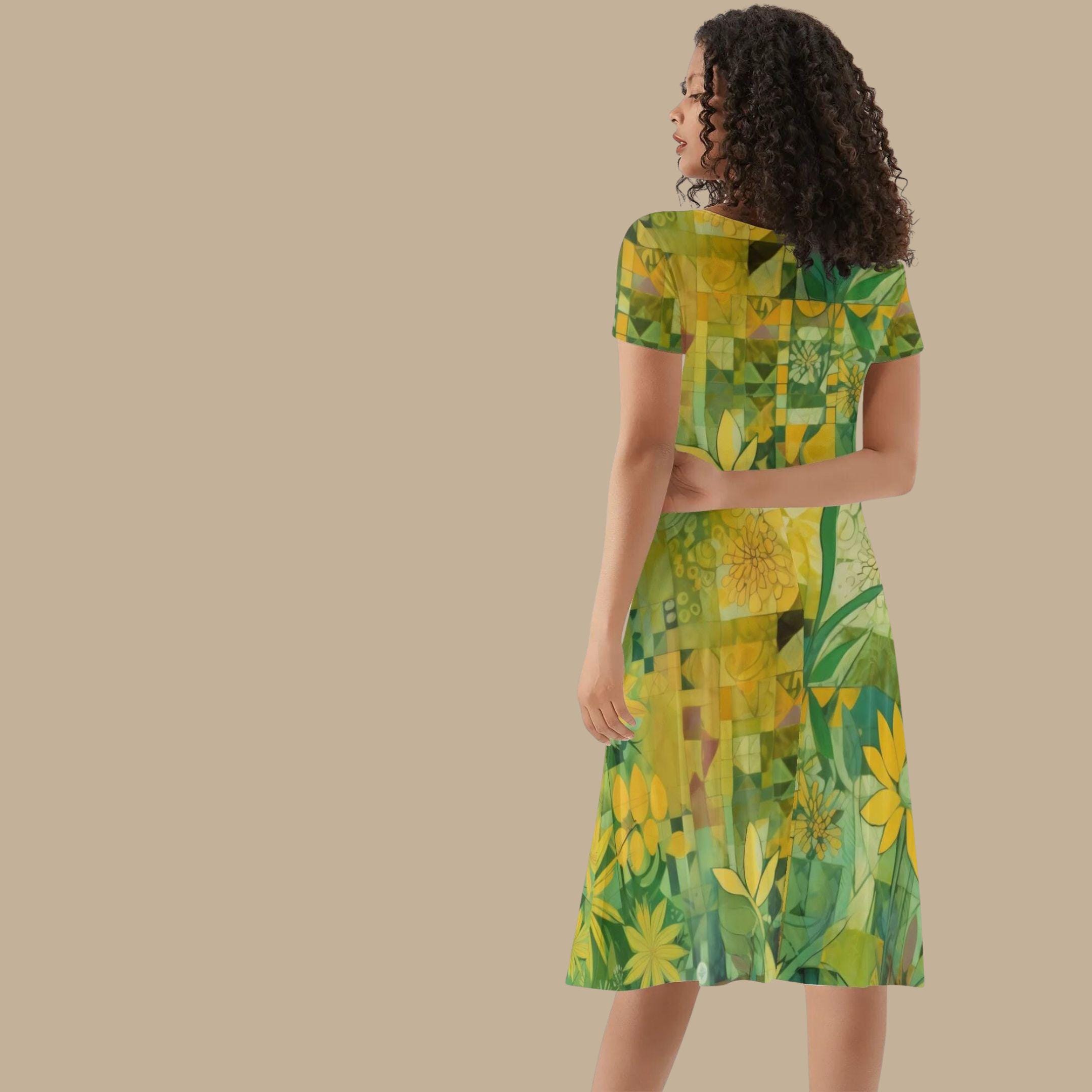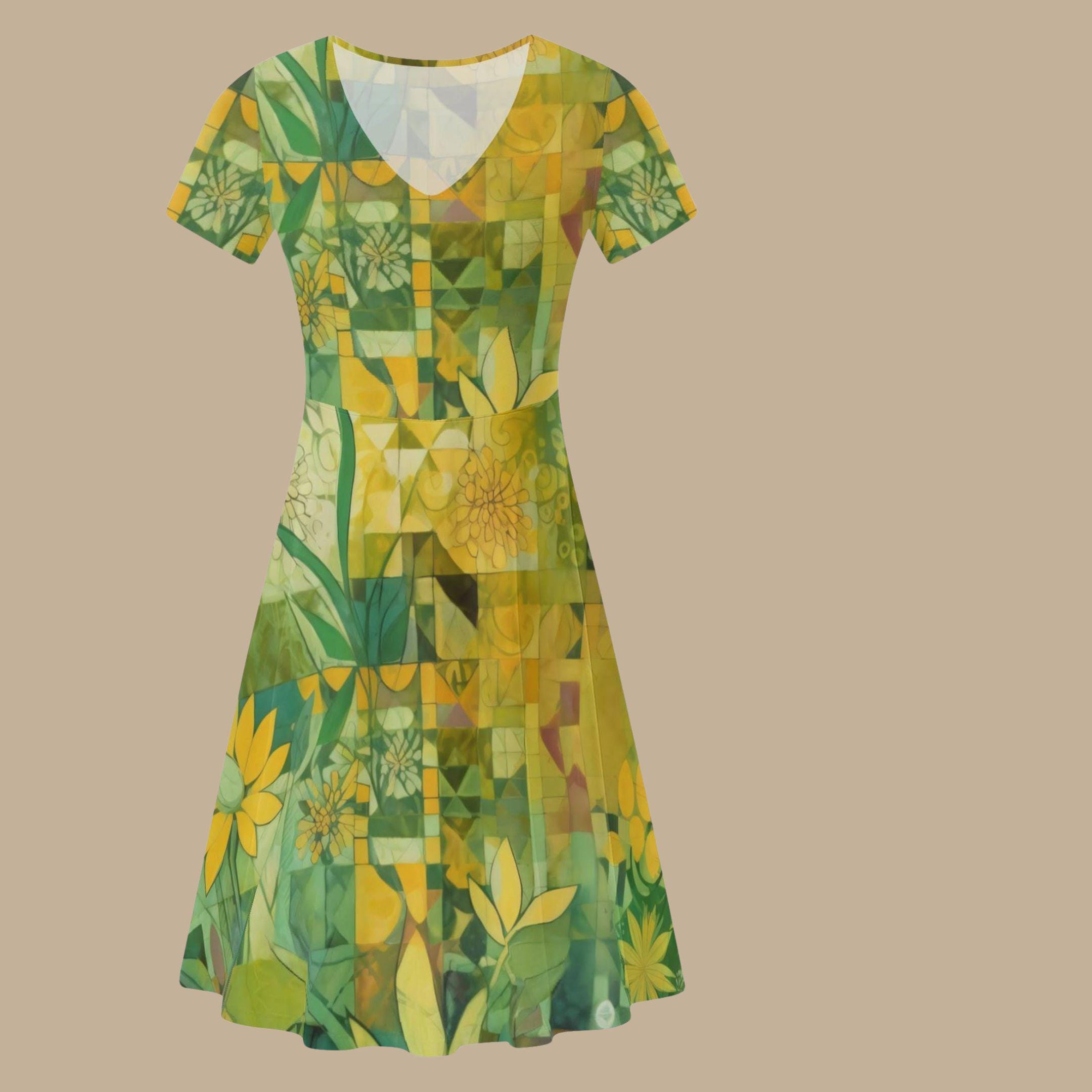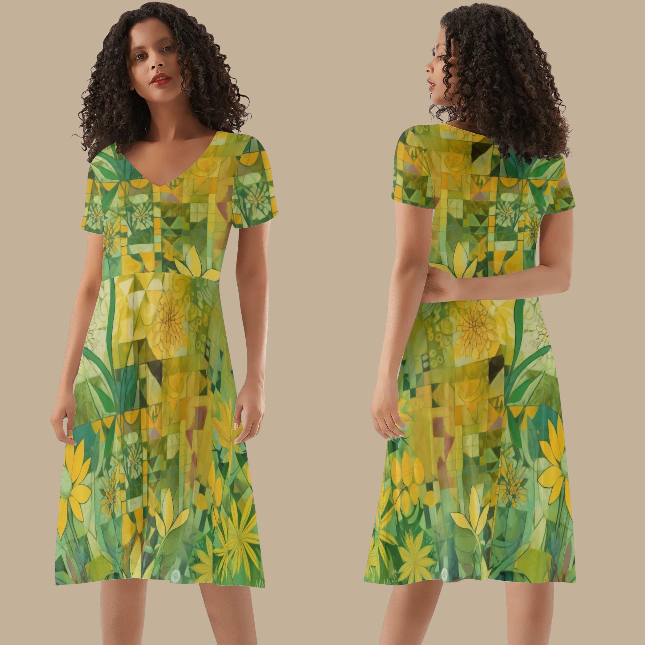 Step into spring wrapped in light, color, and effortless elegance. This short sleeve V-neck midi dress features an artistic botanical mosaic in shades of leafy green, golden yellow, and soft chartreuse — designed to feel fresh, modern, and beautifully wearable.
