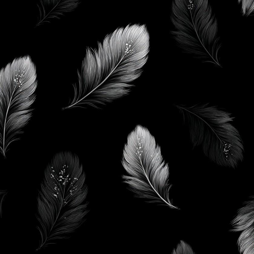 Set against a deep black background, the flowing silver feather artwork creates a dramatic visual movement across the silhouette. The design feels both minimal and expressive — like a brushstroke of light across midnight fabric.