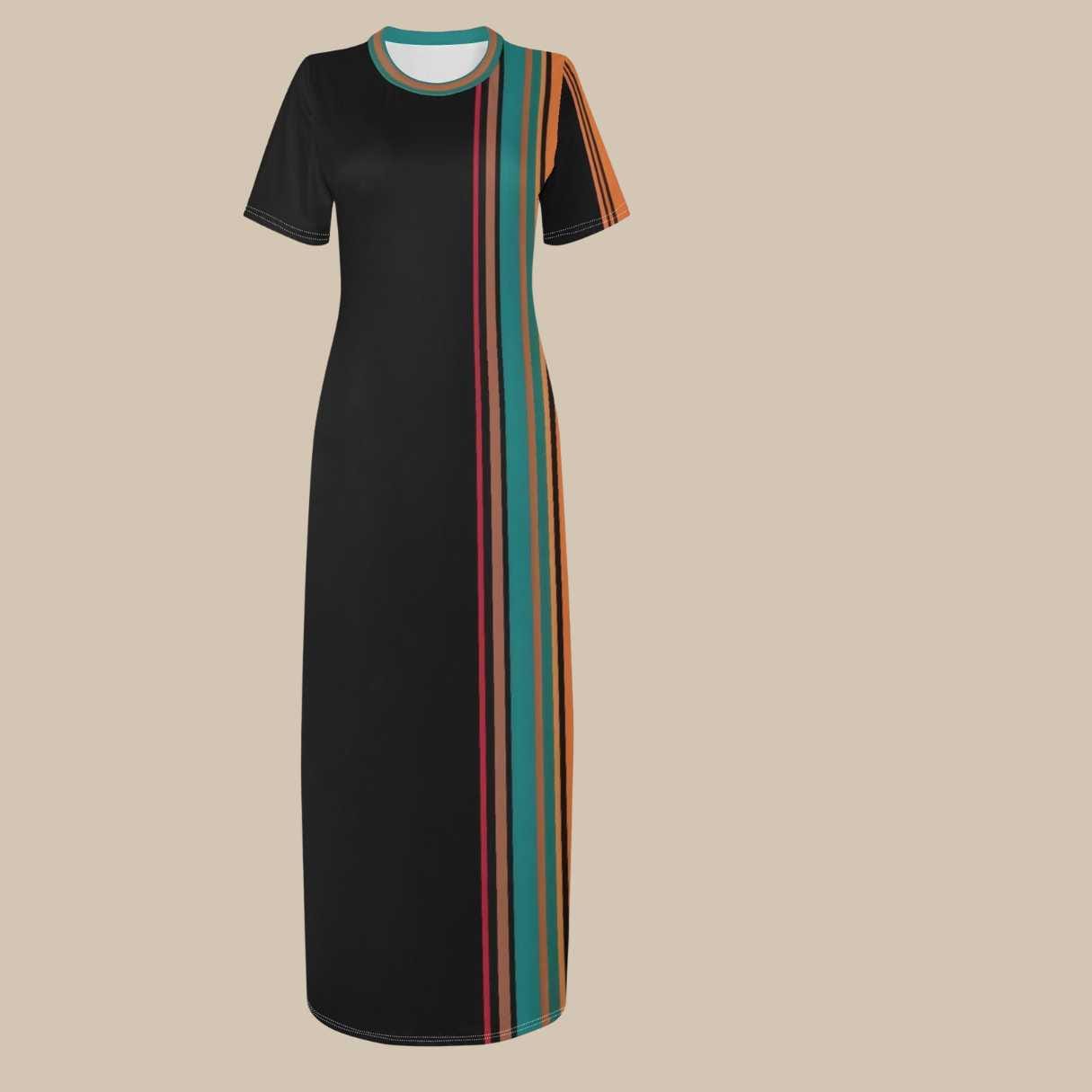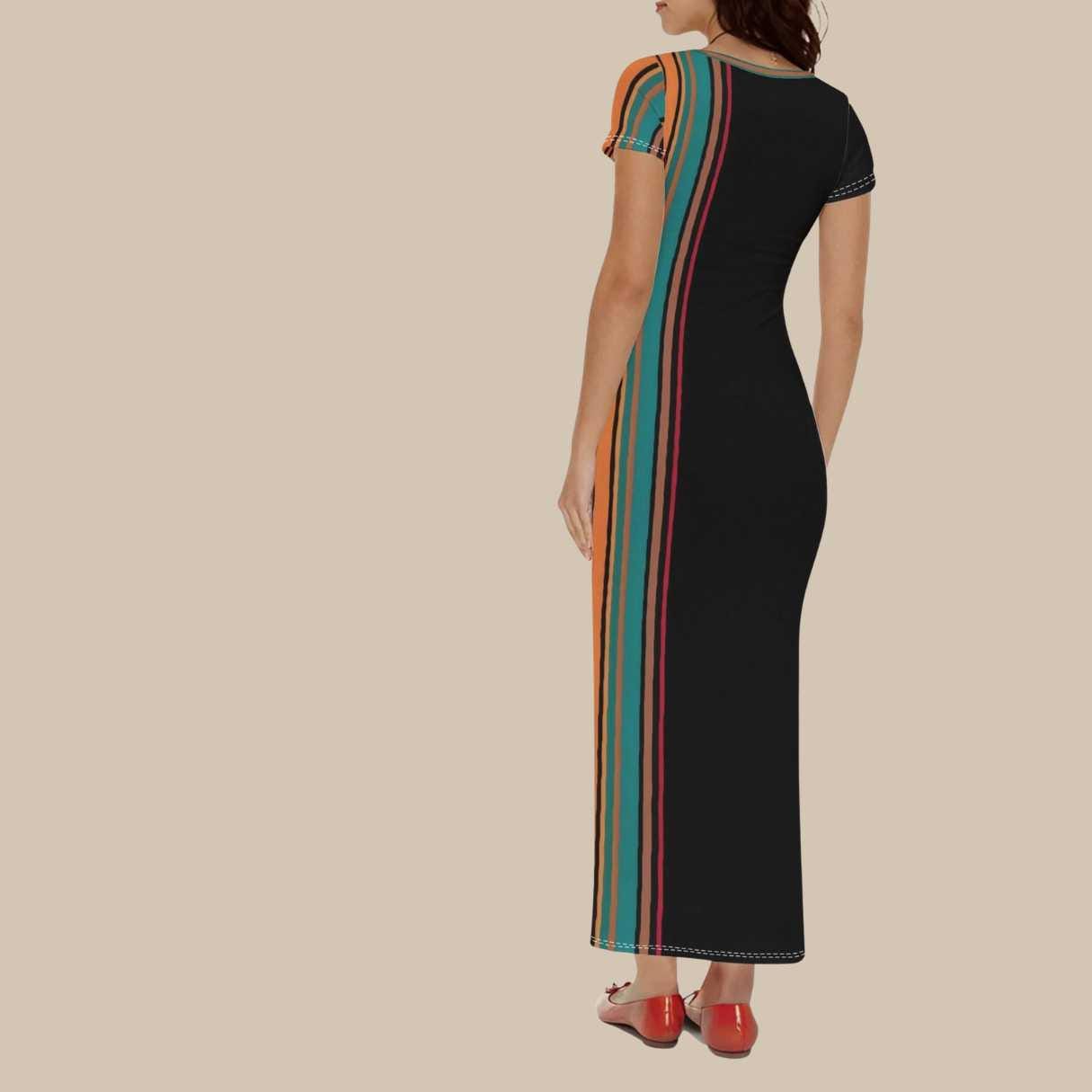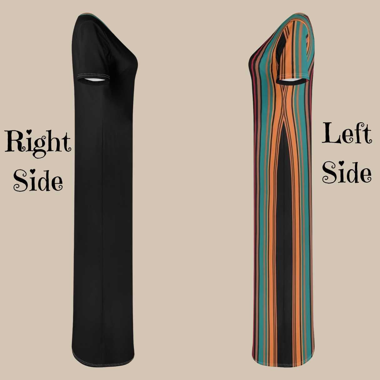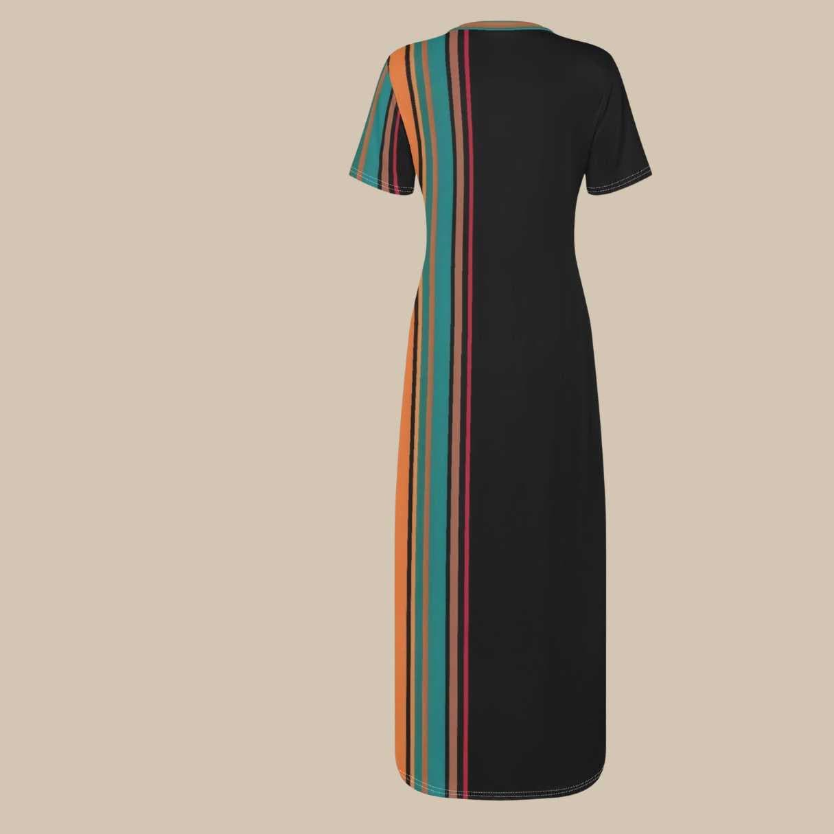This striking dress features a dramatic asymmetrical stripe panel in rich tones of teal, coral, golden orange, and black. The placement of the vertical stripes elongates the silhouette while the contrasting solid black side creates a sleek, flattering look.