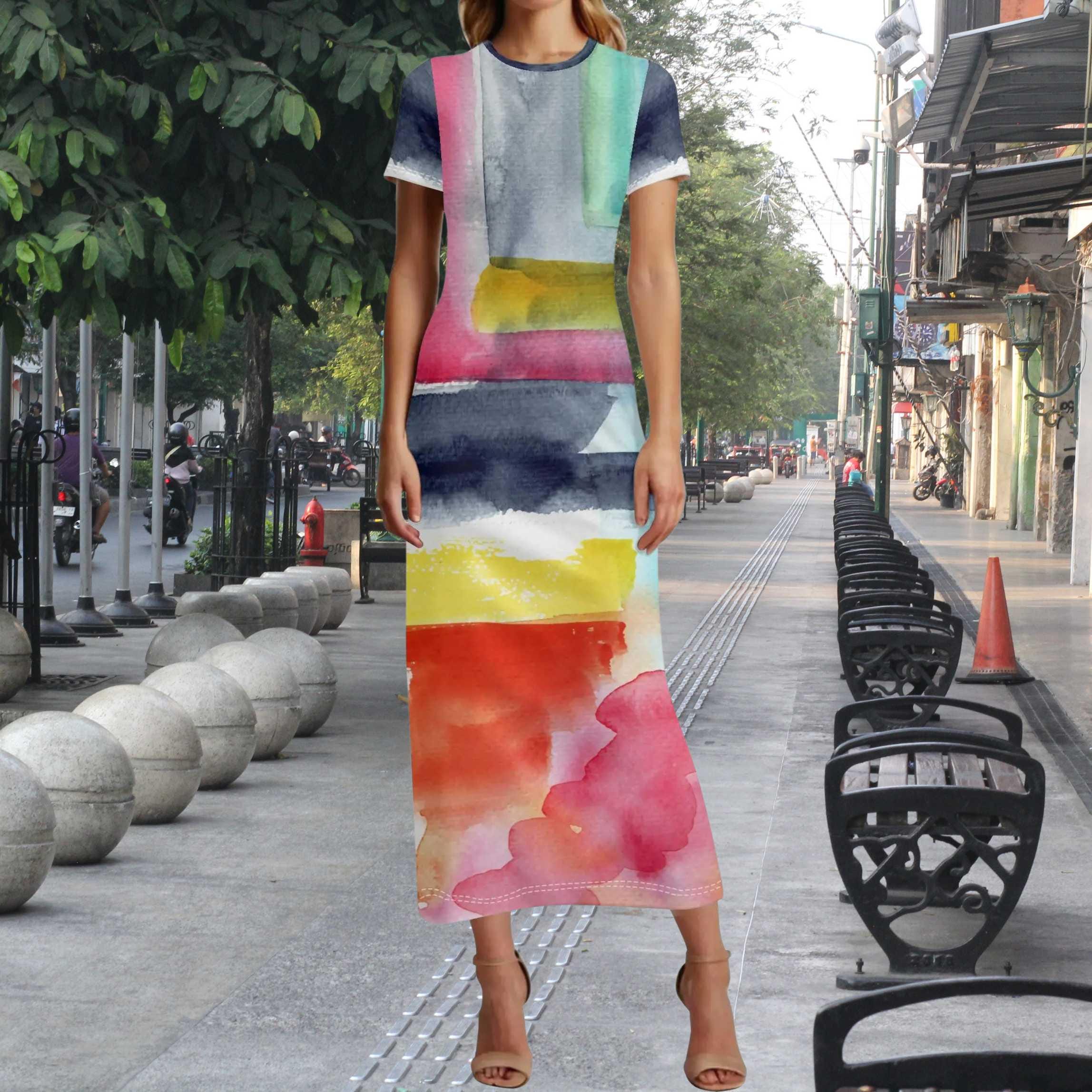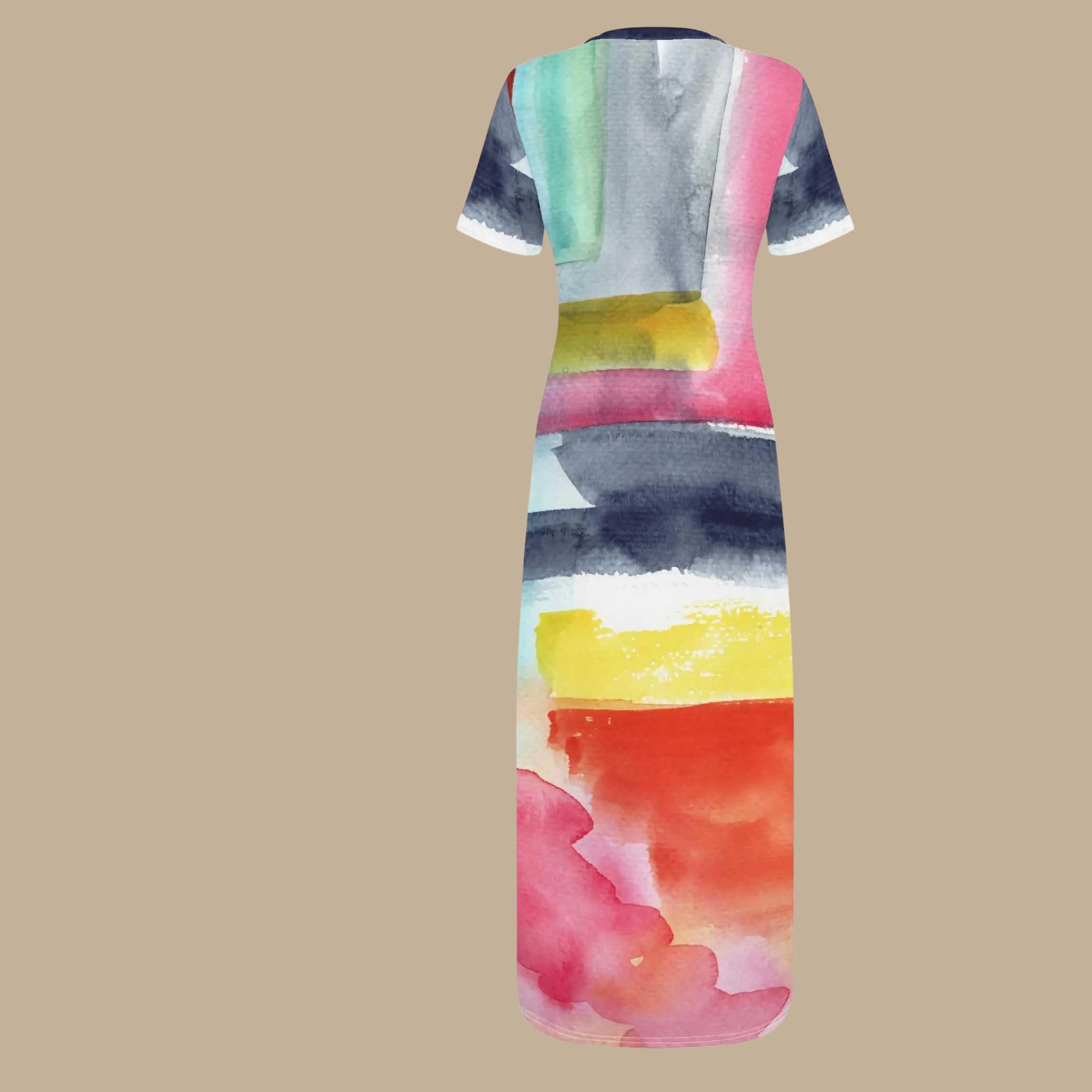 Each brush stroke flows naturally across the dress, transforming the silhouette into a walking canvas of modern art. The soft watercolor textures give the piece an airy, gallery-inspired aesthetic that feels both relaxed and striking.