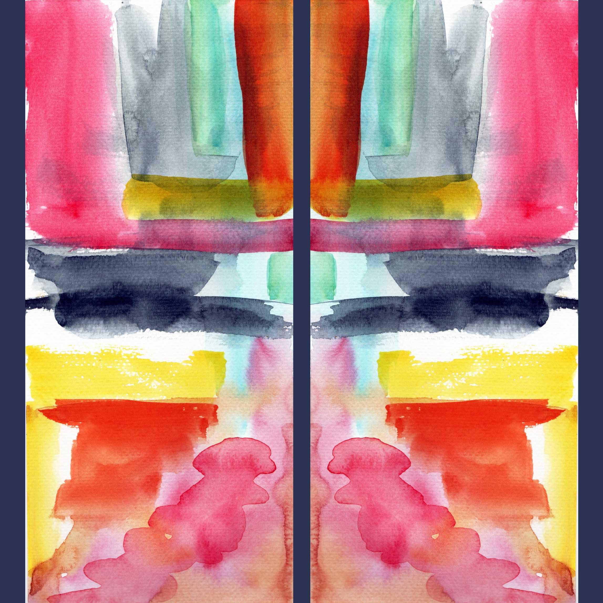 This beautiful design features sweeping watercolor brush strokes in vibrant tones of coral, sunshine yellow, soft pink, ocean blue, and fresh mint green. The painterly composition creates the feeling of a colorful horizon landscape — expressive, artistic, and full of life.