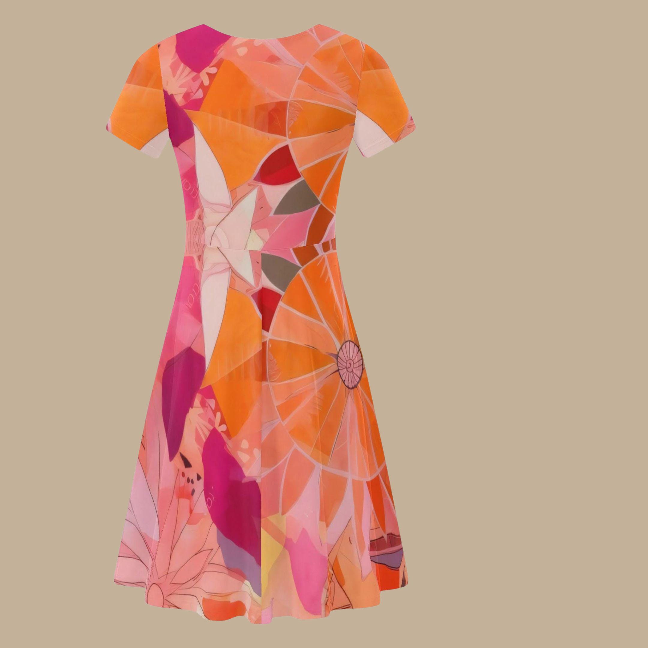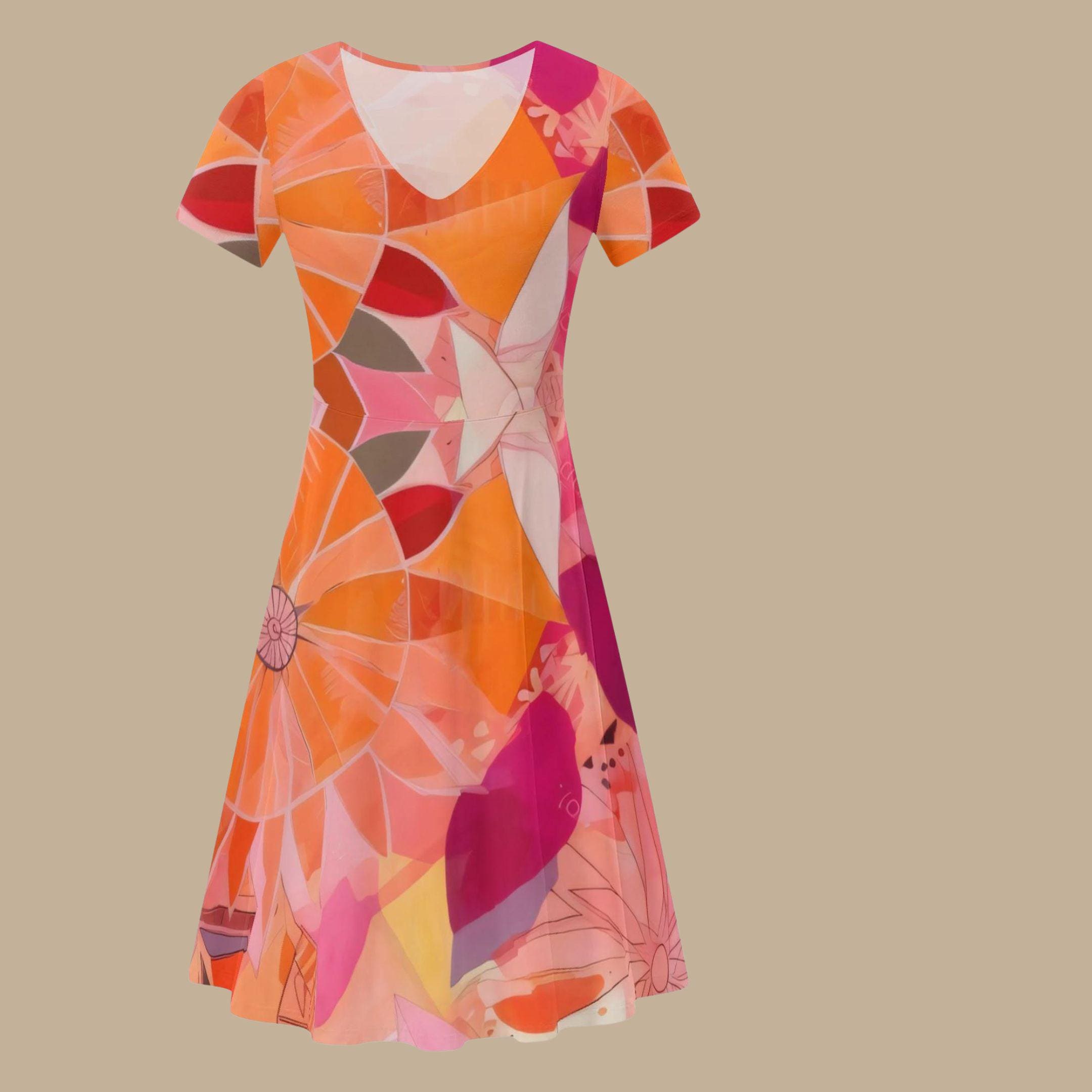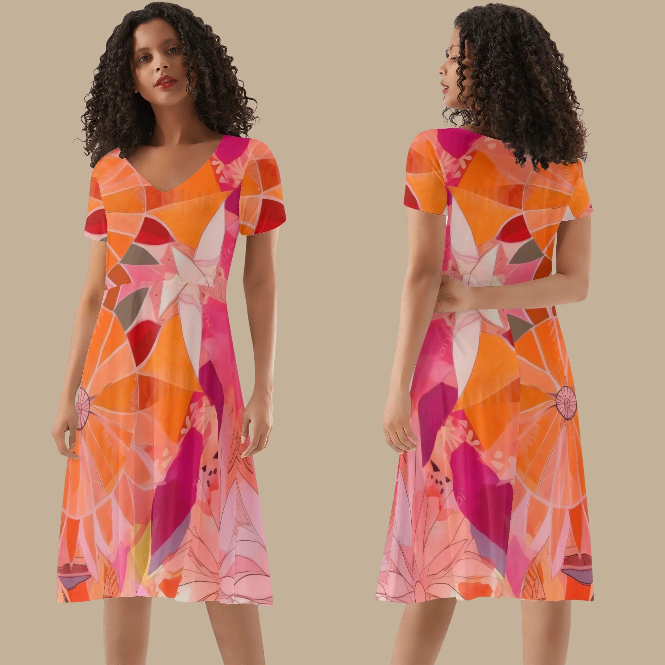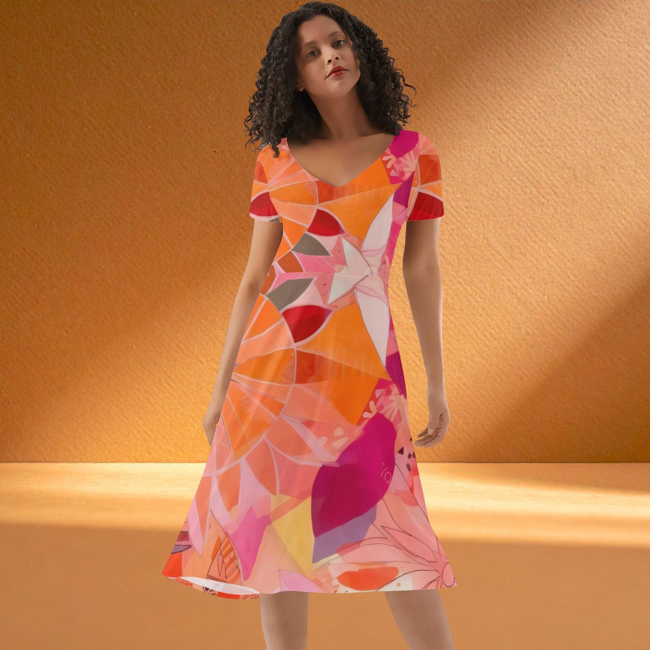 This beautiful dress features a lively blend of coral, orange, pink, and soft blush tones arranged in a flowing abstract floral pattern. The layered shapes and petal-like forms create a design that feels both modern and garden-inspired — like sunlight passing through colorful petals.