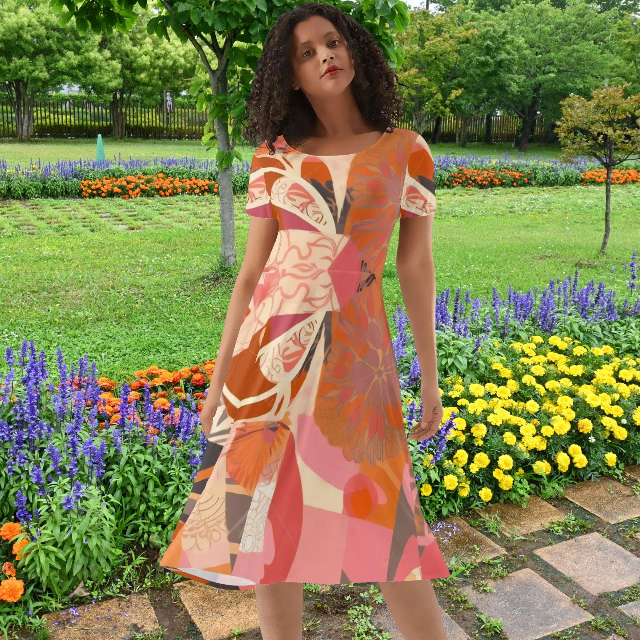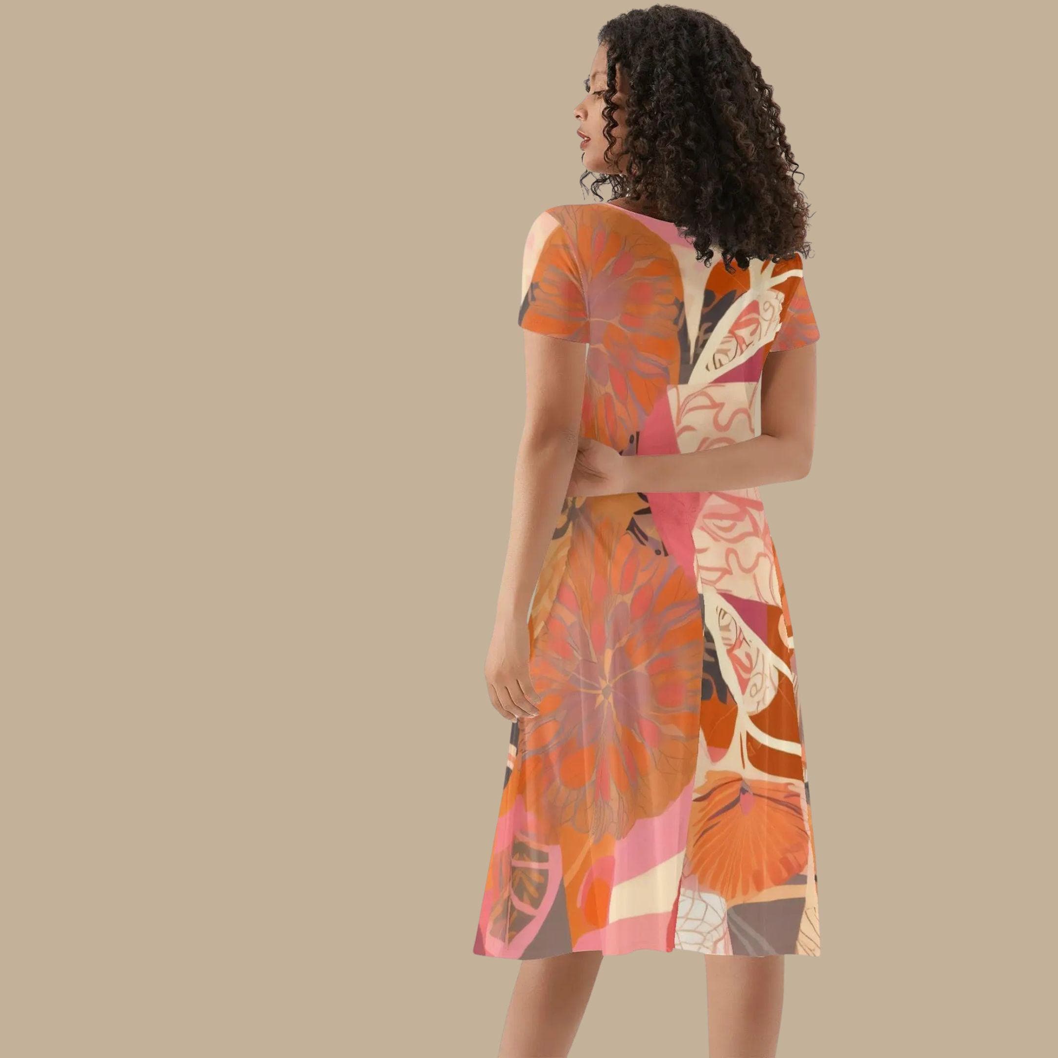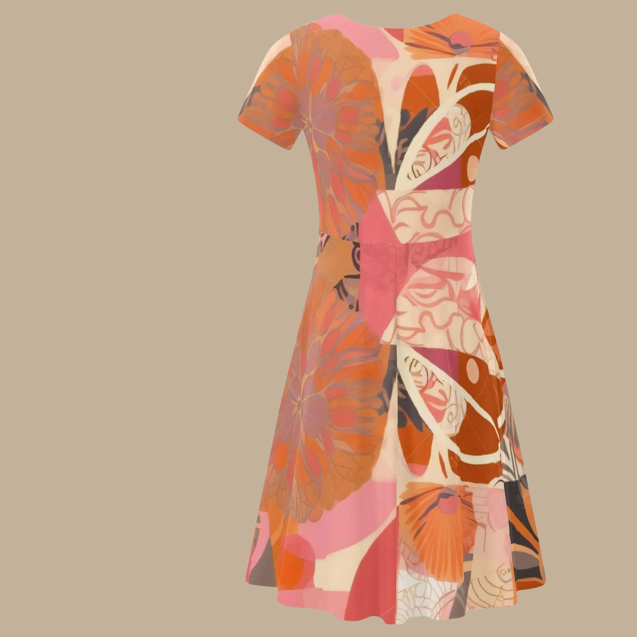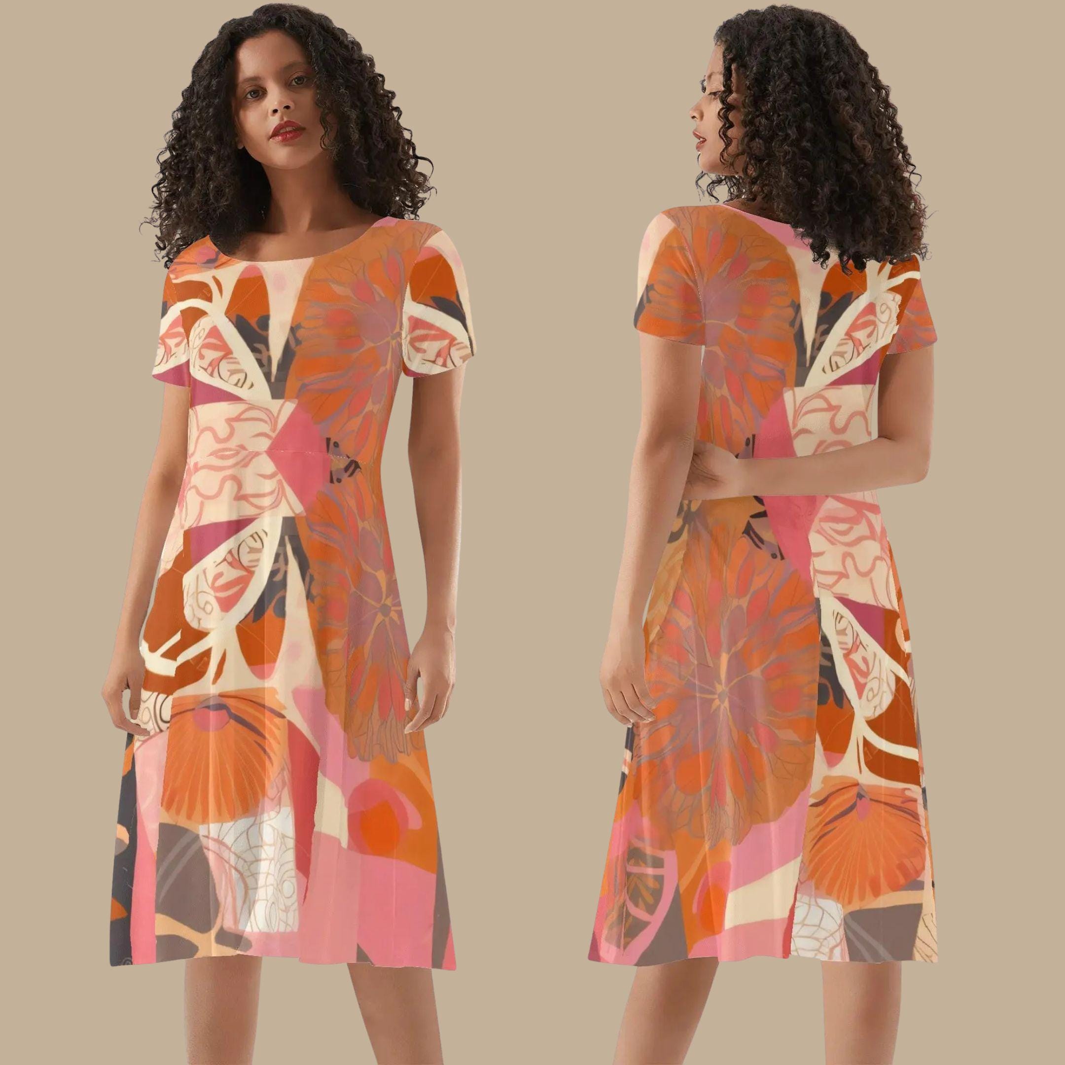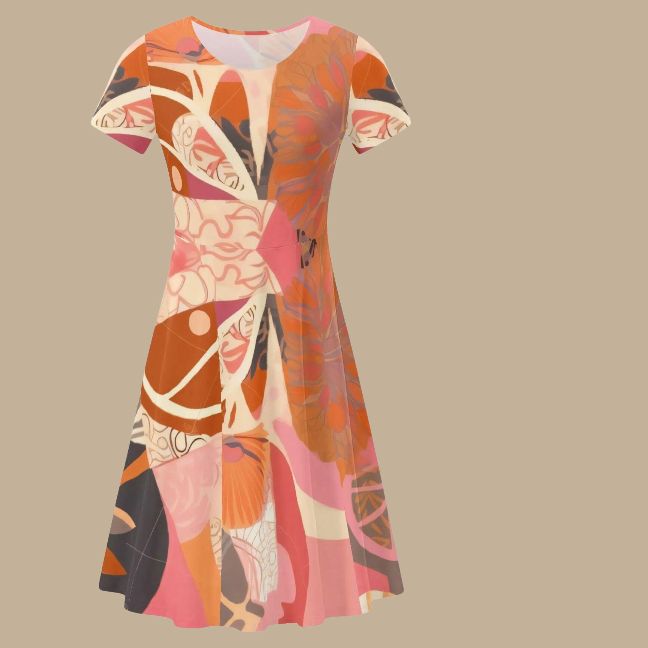 This beautiful dress features a layered floral composition of coral, terracotta, blush pink, and warm orange tones. The artwork flows across the dress in soft abstract shapes that resemble blooming petals and garden leaves, creating a modern wearable art piece.