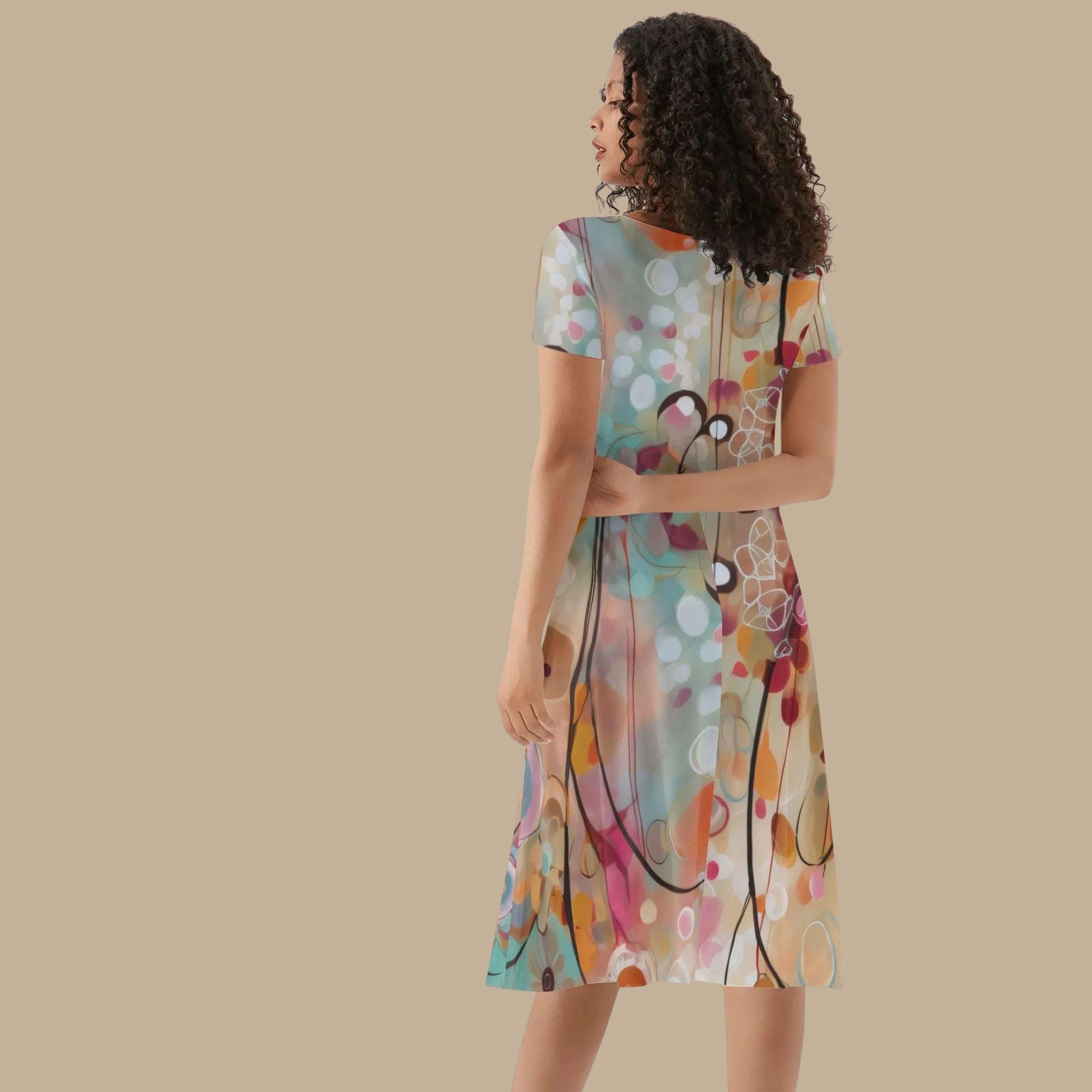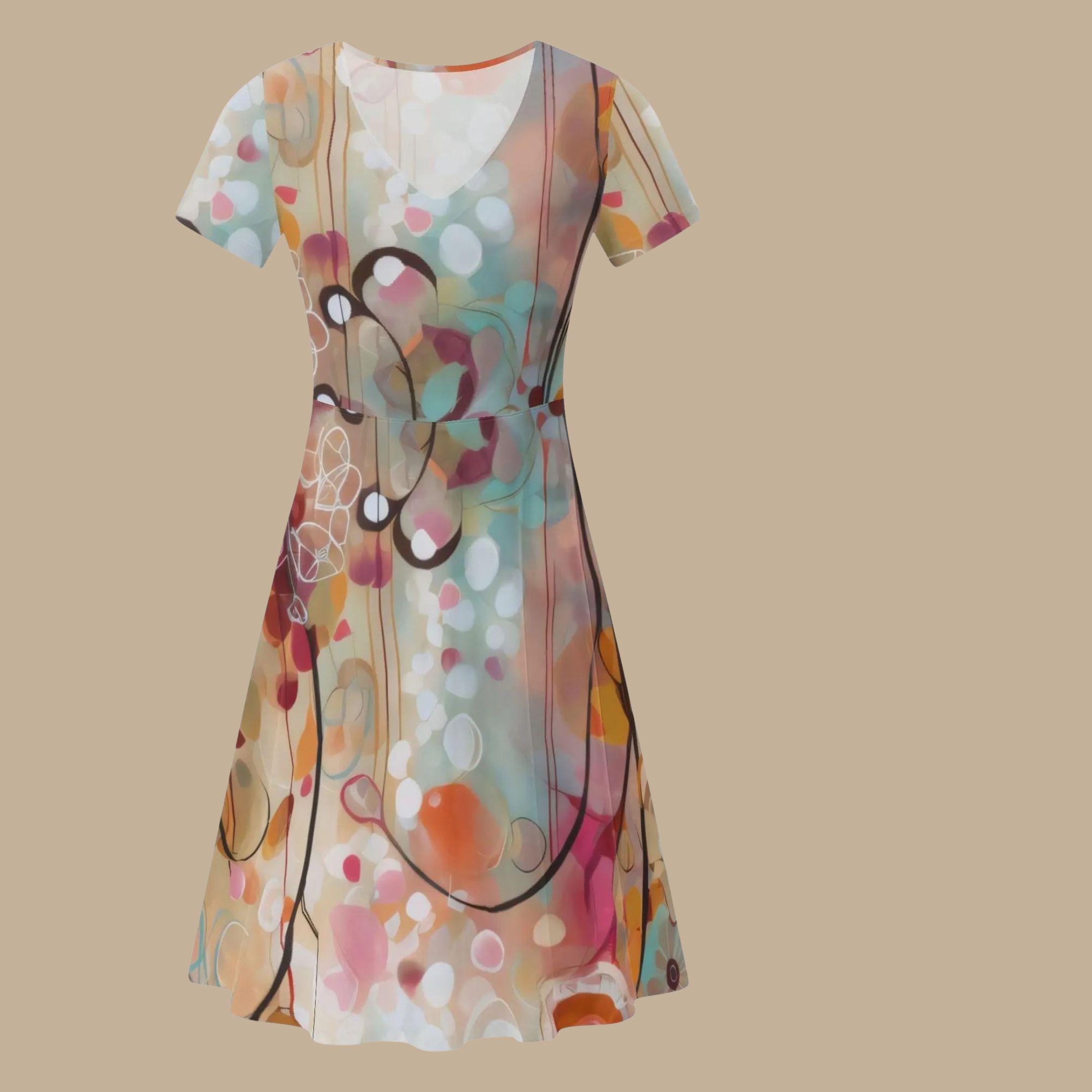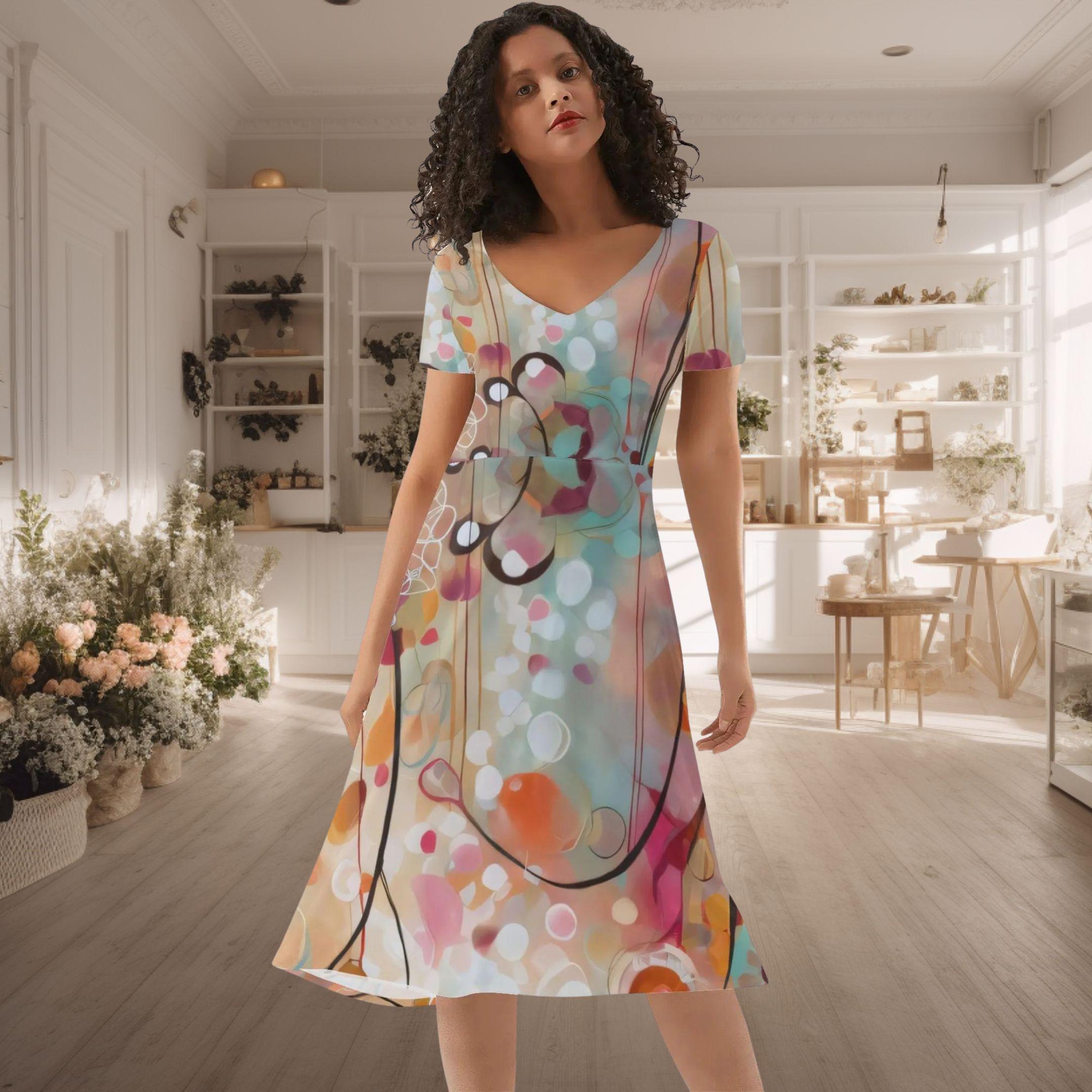 The Dreamscape Abstract V-Neck Dress from The Harbor Edit transforms contemporary abstract art into a beautifully wearable piece.