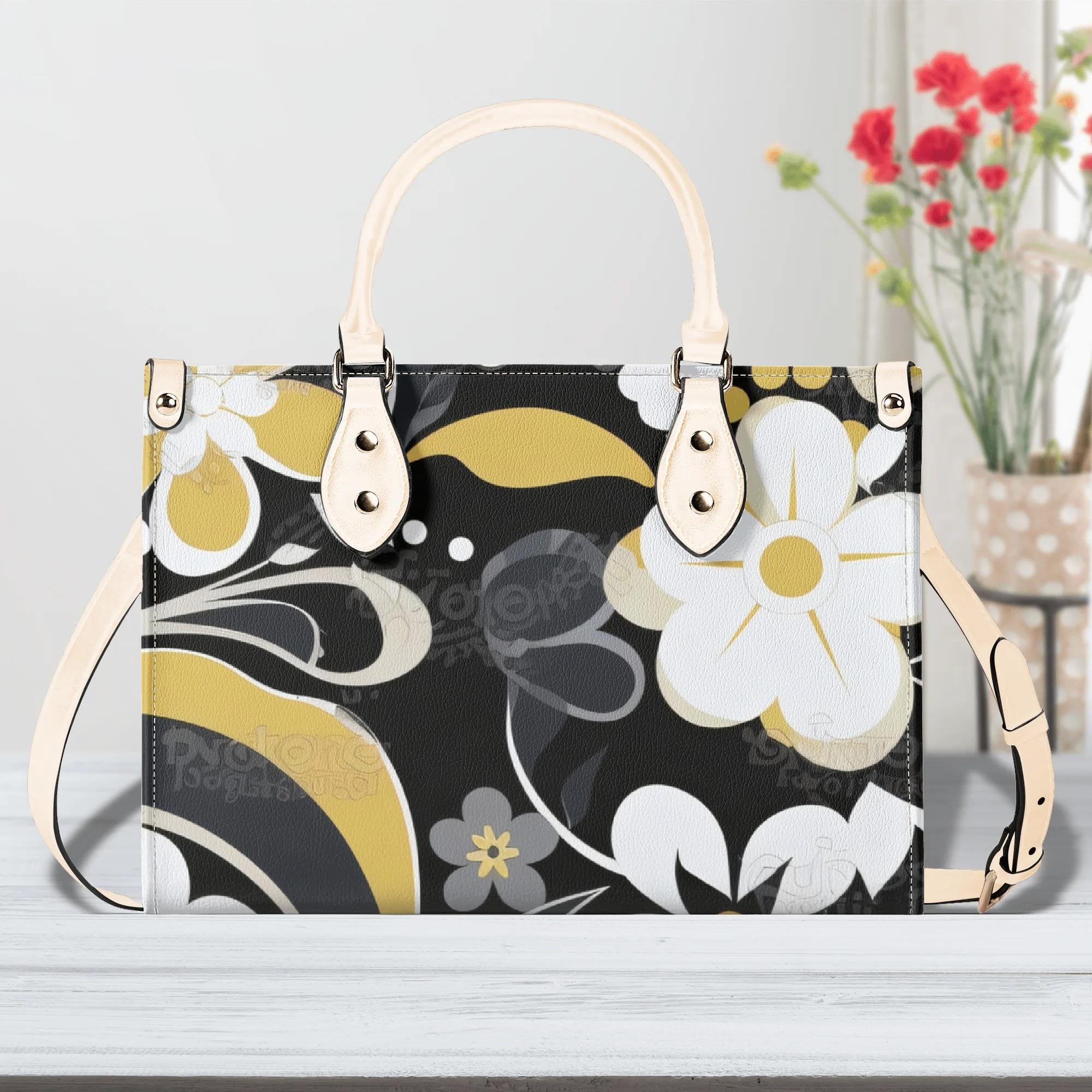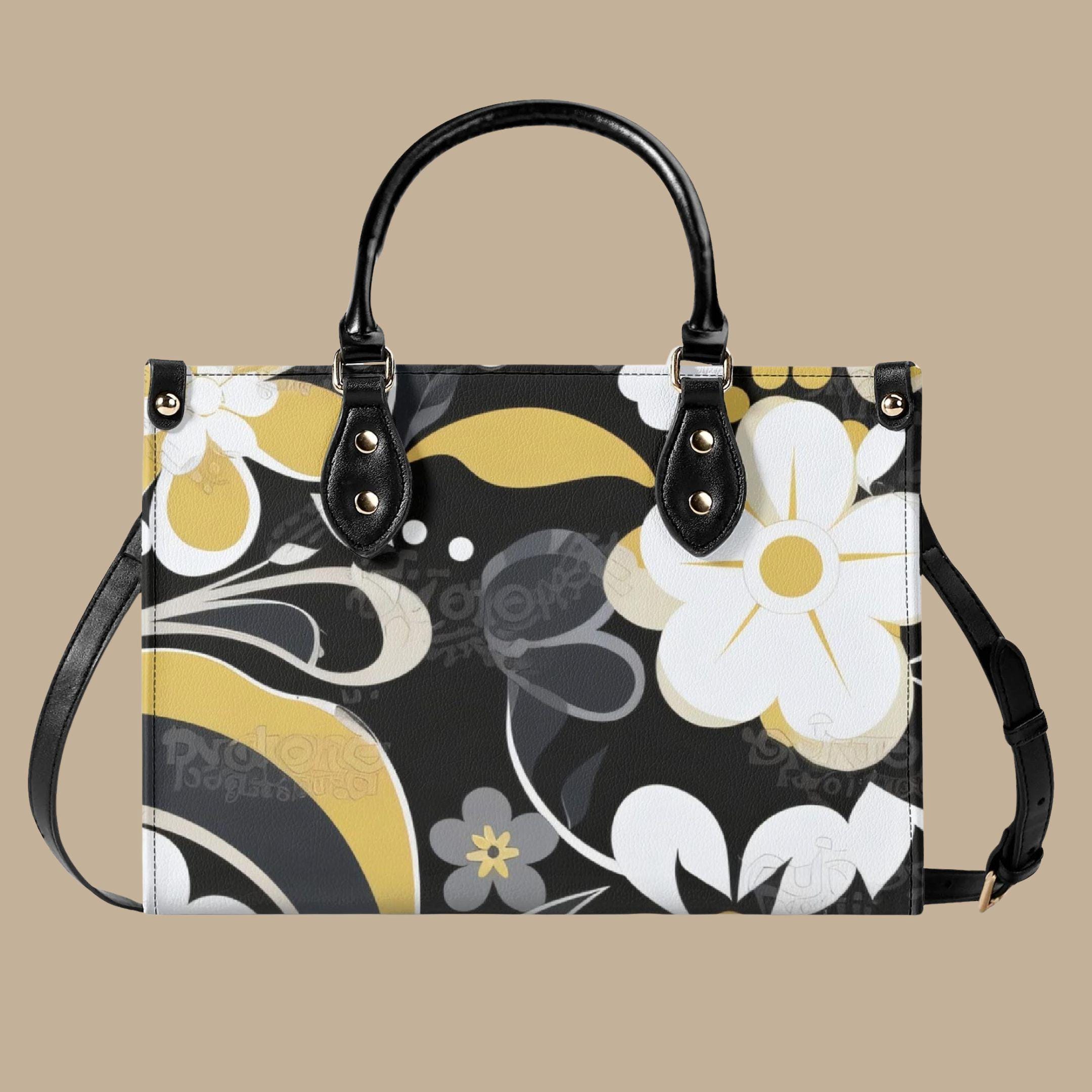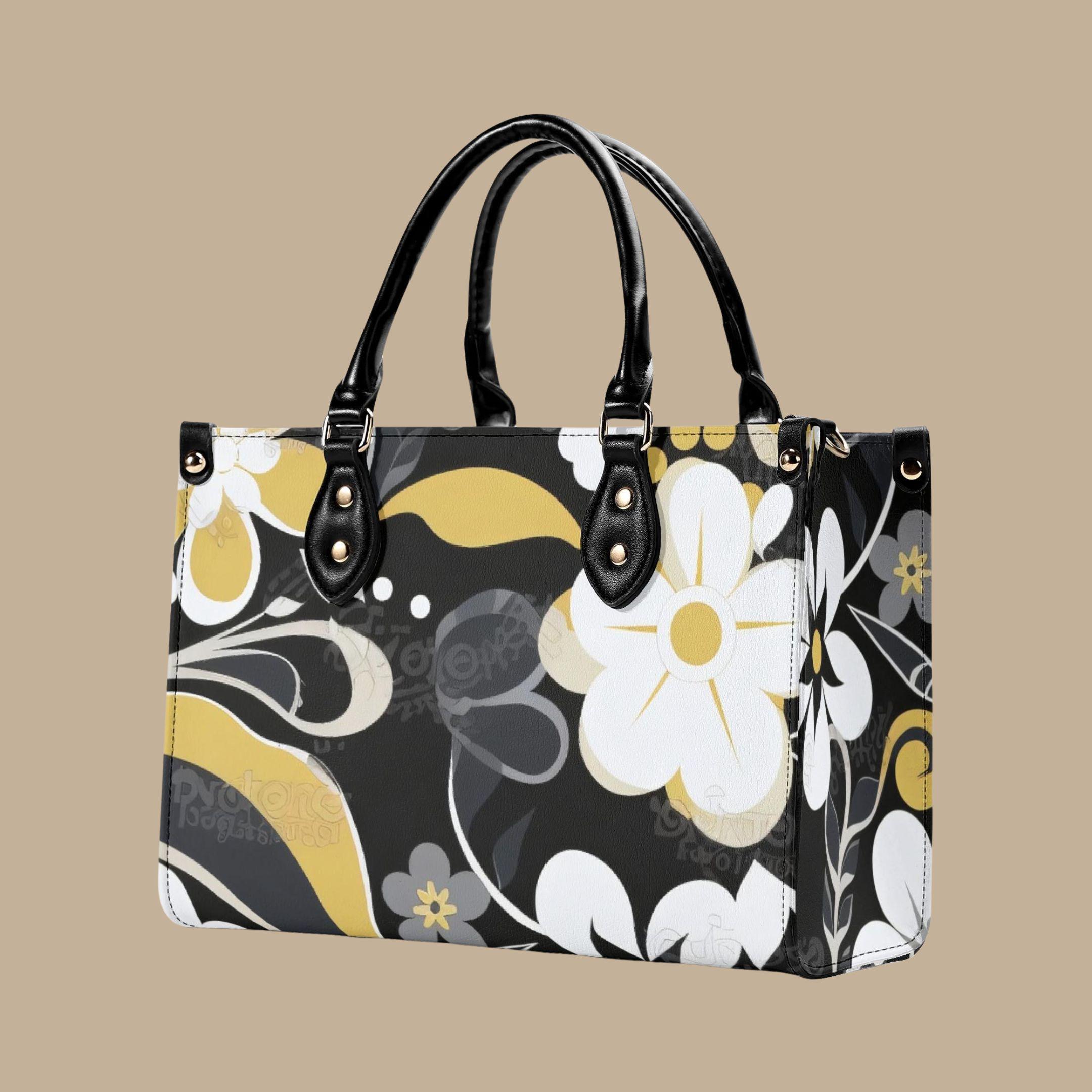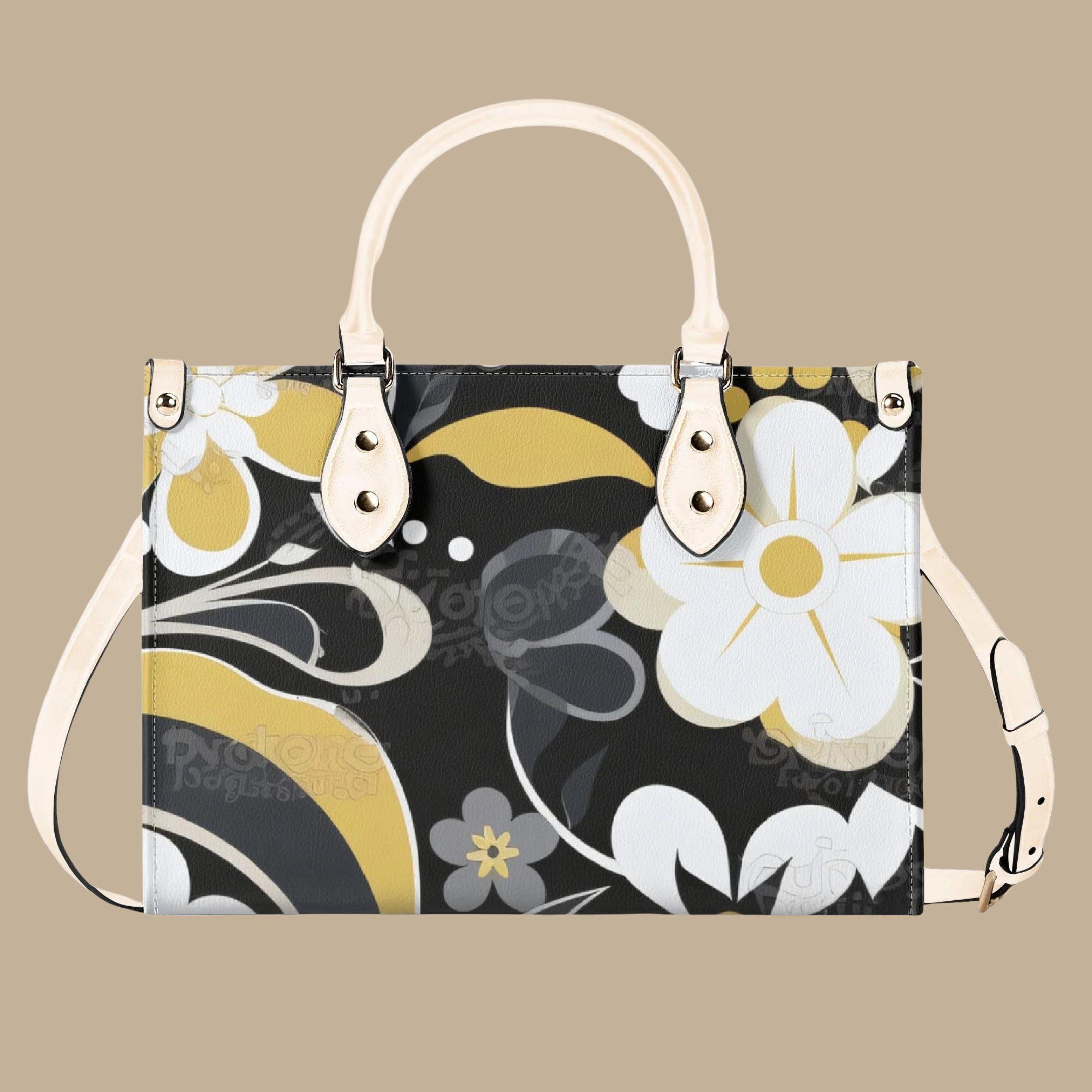 Crafted from premium PU leather, this elegant handbag features a striking floral pattern in black, cream, and golden tones that adds a modern designer-inspired look to any outfit. The structured shape keeps your belongings organized while maintaining a polished appearance.