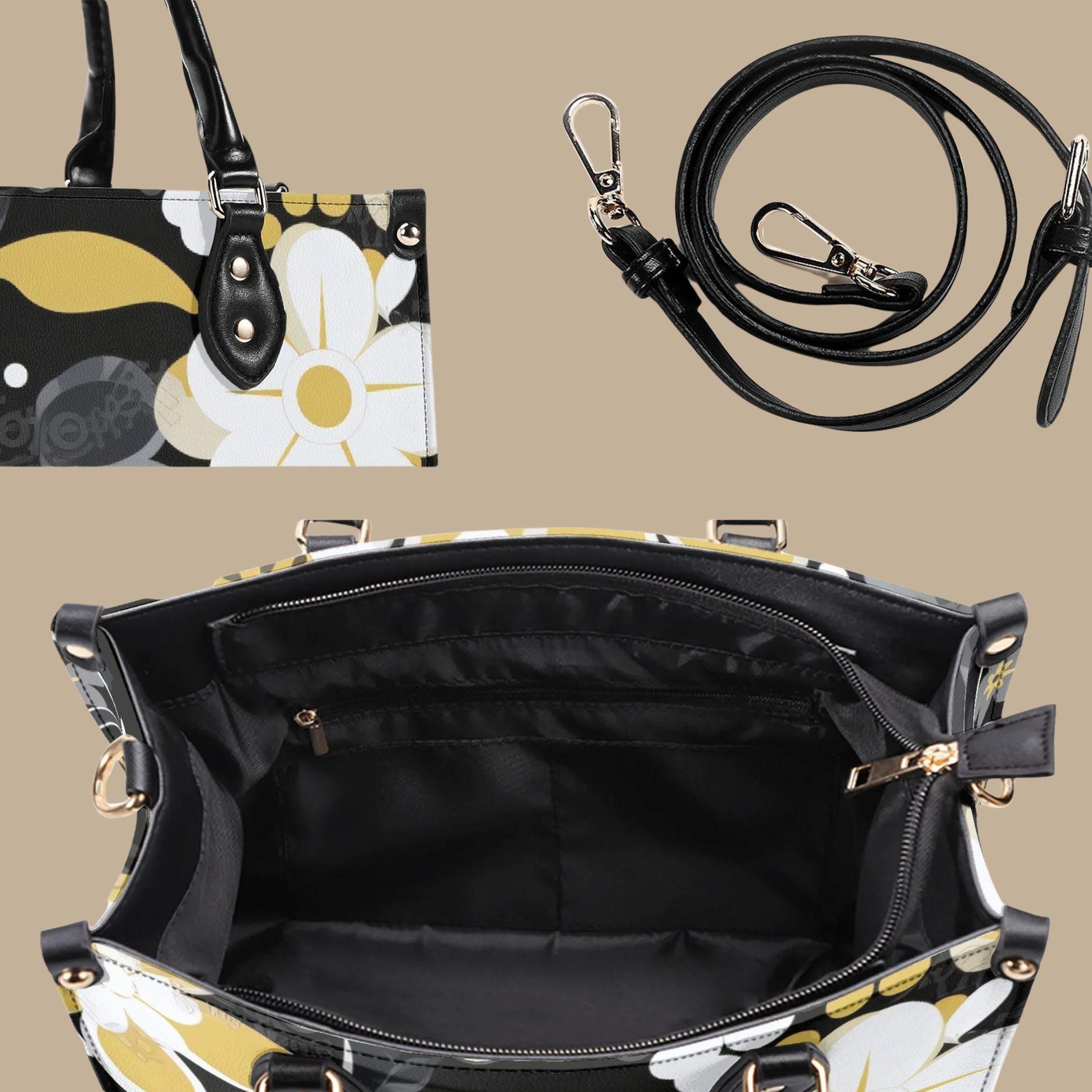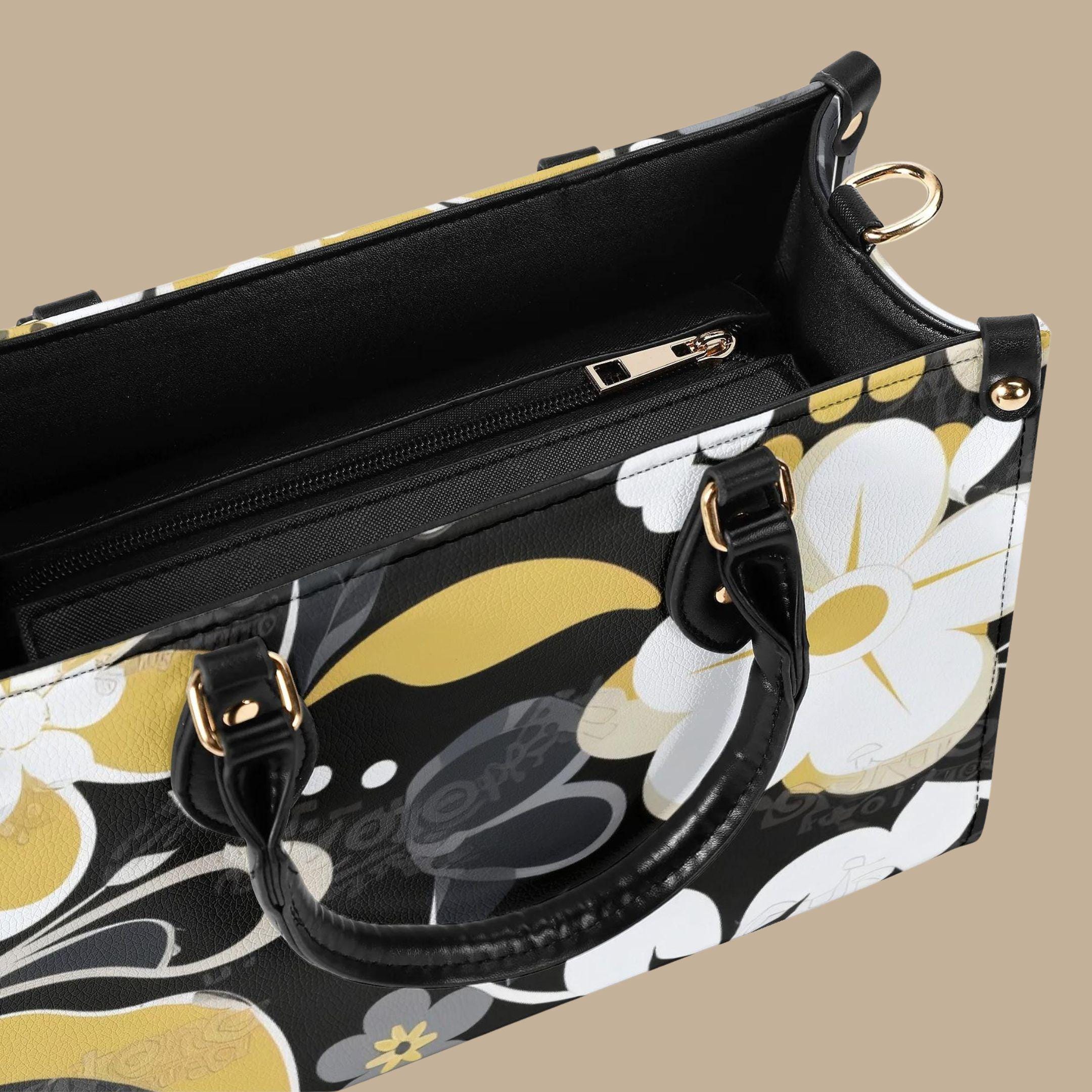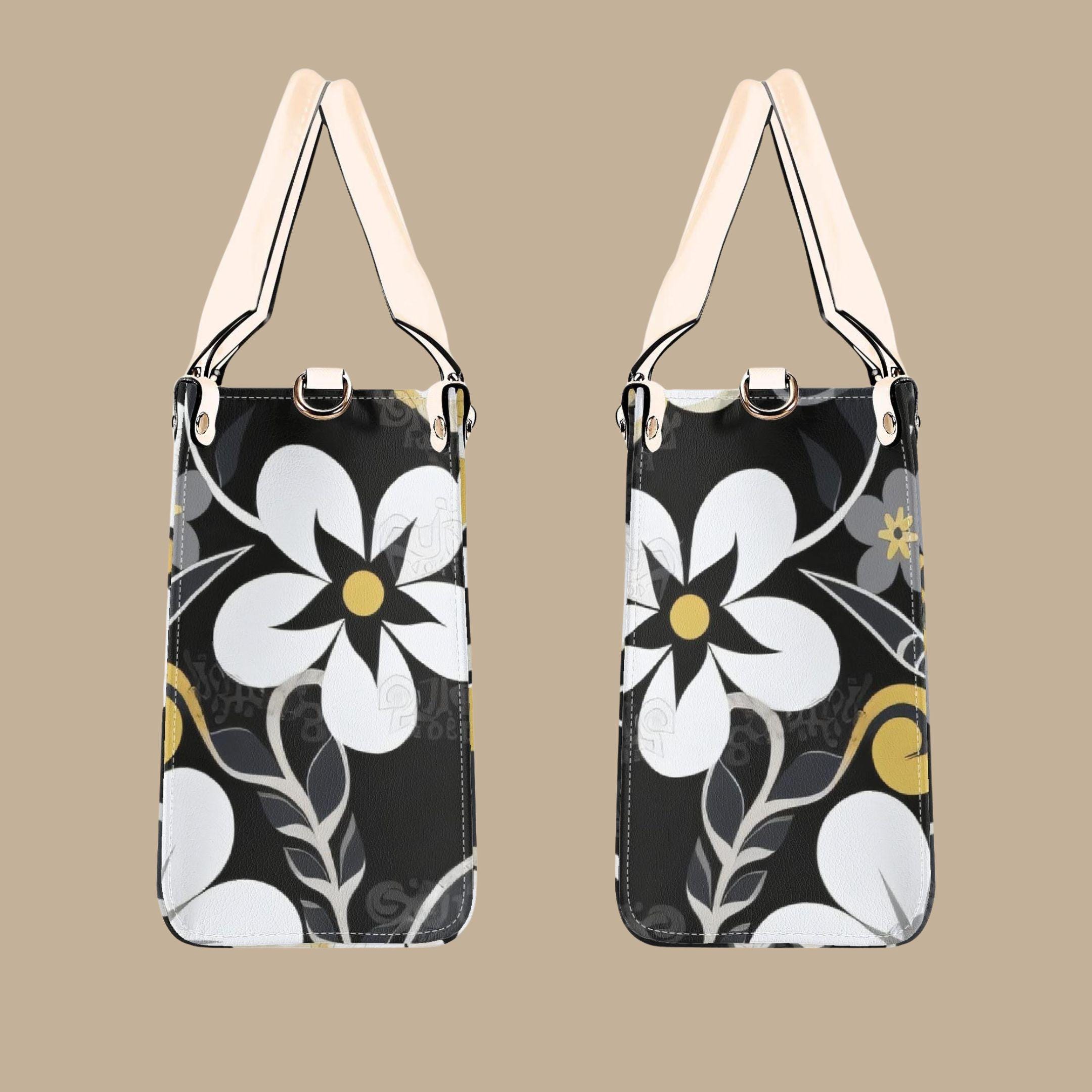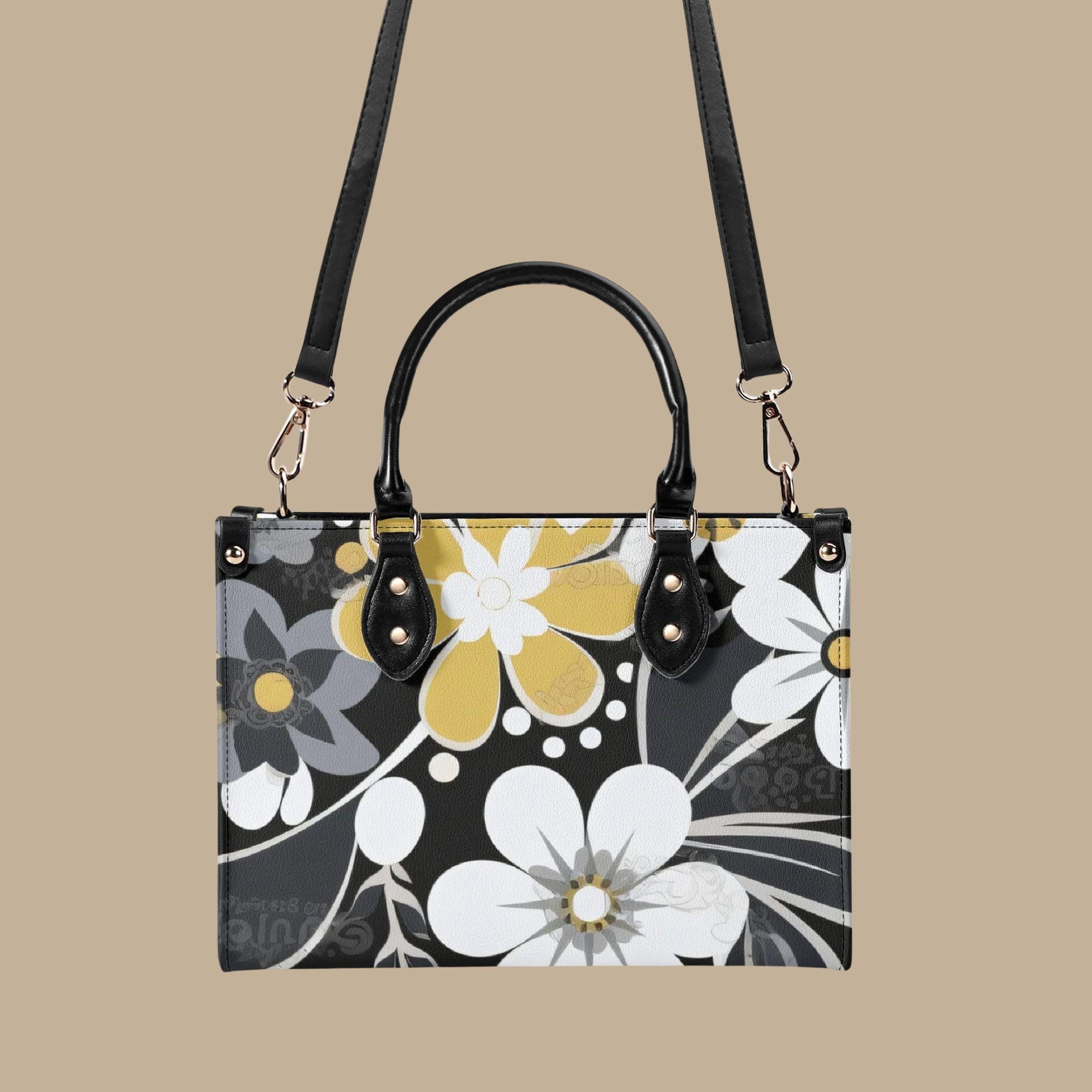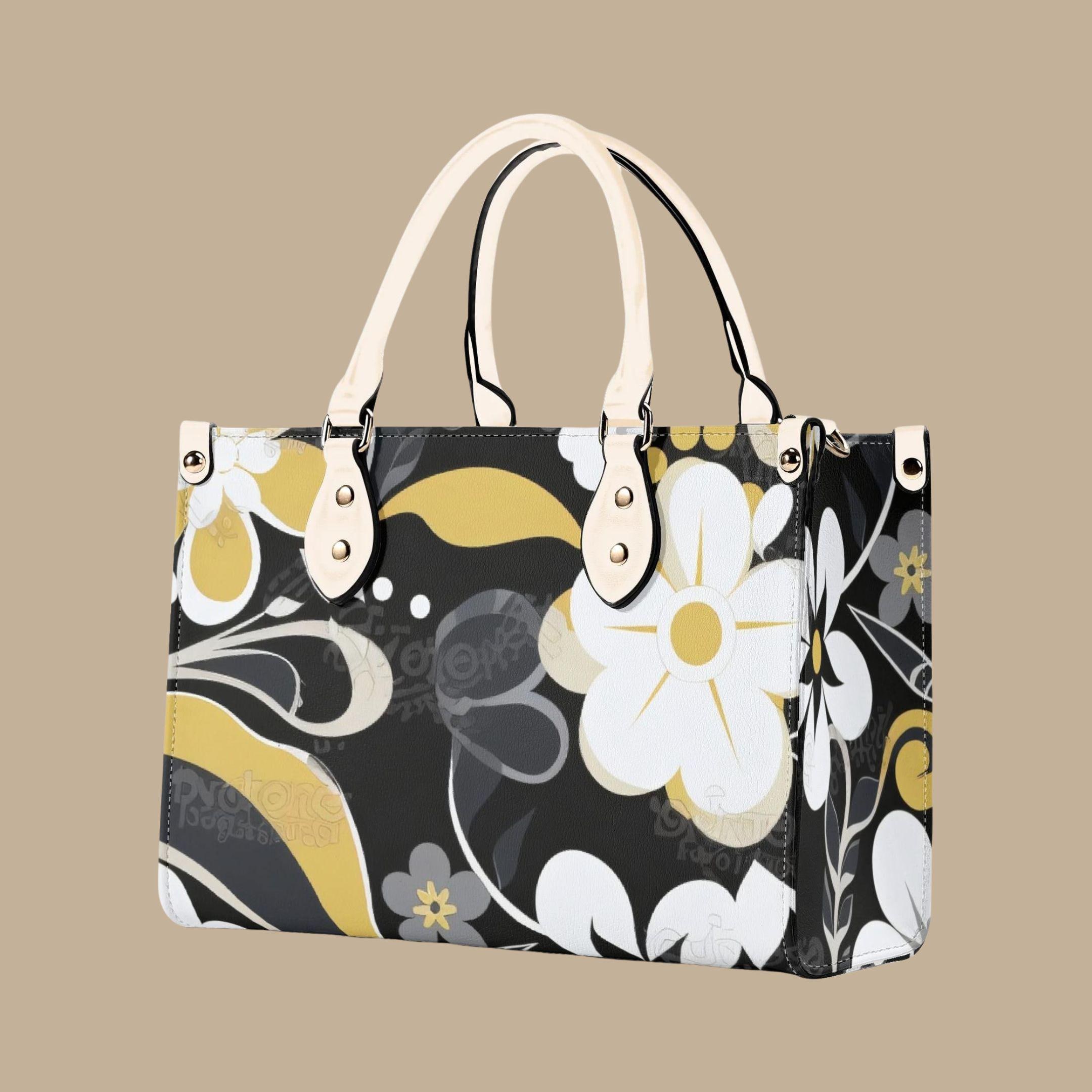 Crafted from premium PU leather, this elegant handbag features a striking floral pattern in black, cream, and golden tones that adds a modern designer-inspired look to any outfit. The structured shape keeps your belongings organized while maintaining a polished appearance.