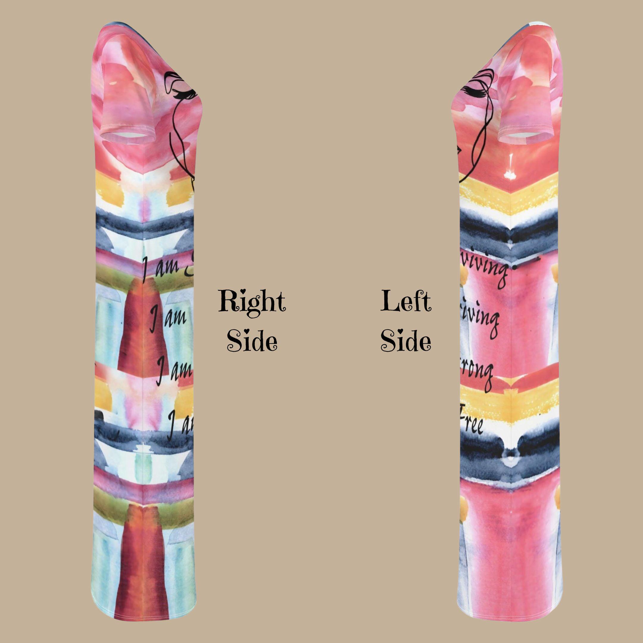 This striking design blends soft watercolor sunset tones with elegant line art and powerful affirmations woven throughout the artwork. Words of strength and transformation flow across the fabric, creating a meaningful piece that inspires confidence and positivity.