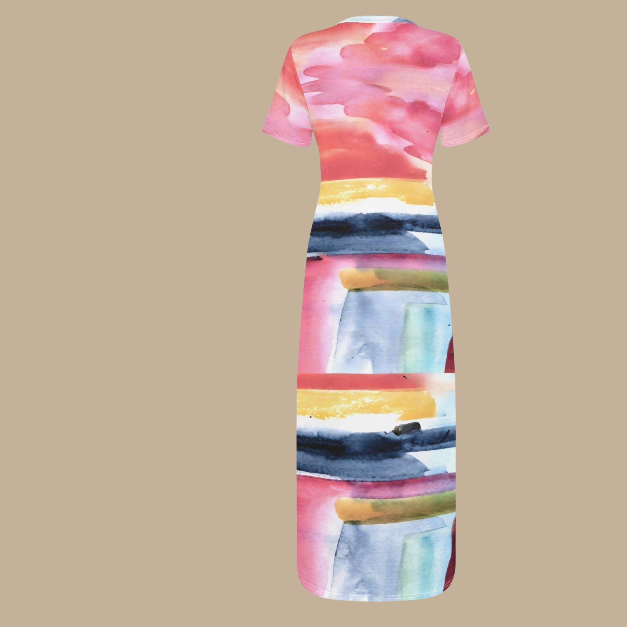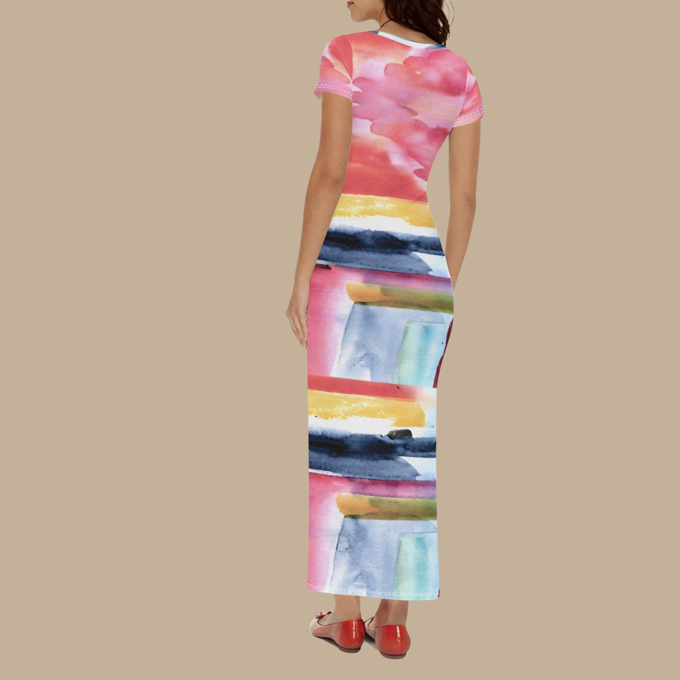 The flowing silhouette allows the watercolor artwork to unfold naturally across the dress, while the minimalist line-art portrait adds a modern artistic touch. Each detail works together to create a piece that feels uplifting, expressive, and uniquely personal.