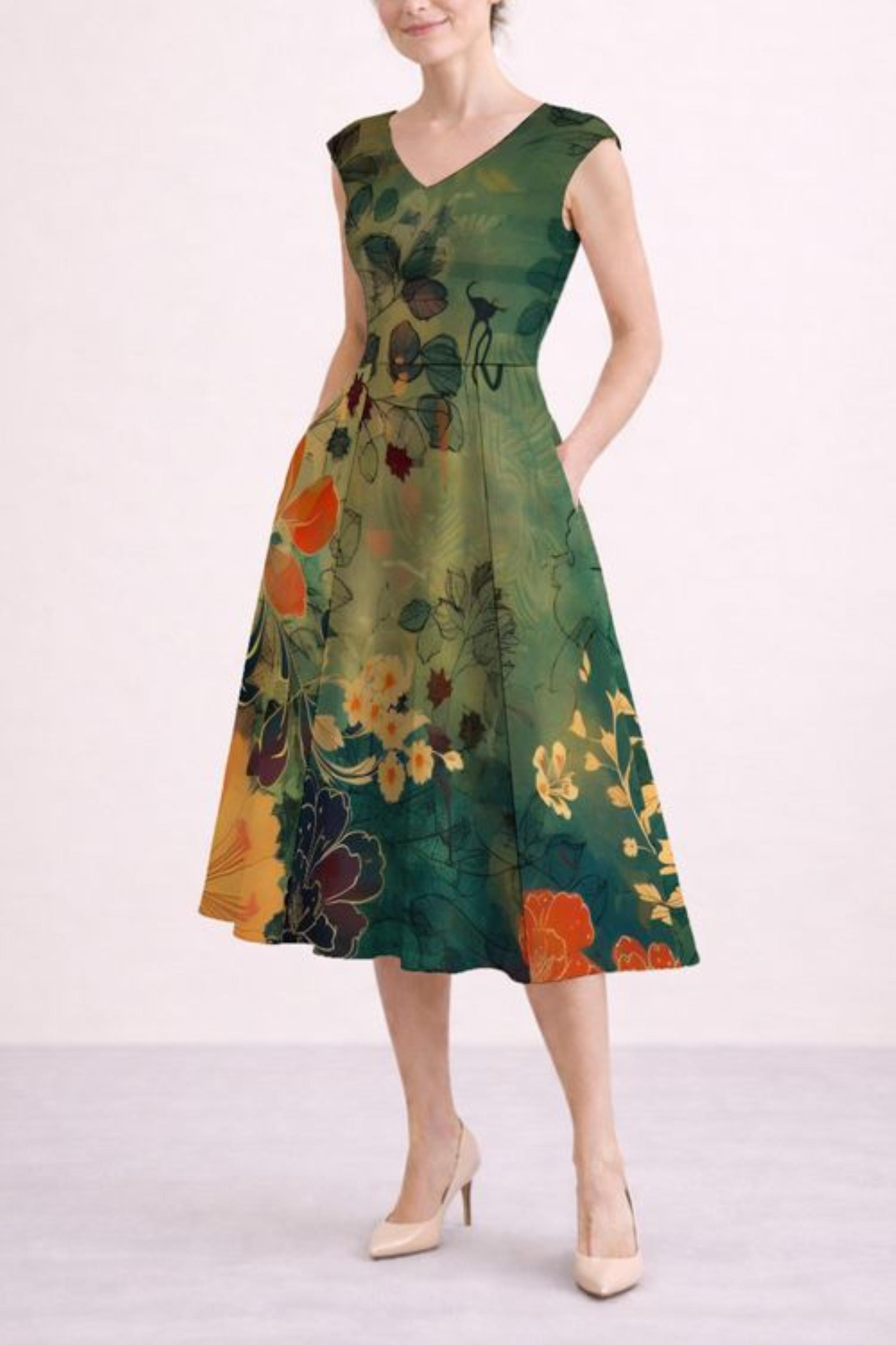 The flattering fit & flare silhouette gently defines the waist while allowing the skirt to move with graceful ease. A soft V-neckline at both the front and back creates a beautifully balanced frame, while discreet side pockets add a touch of everyday practicality without disrupting the flow.