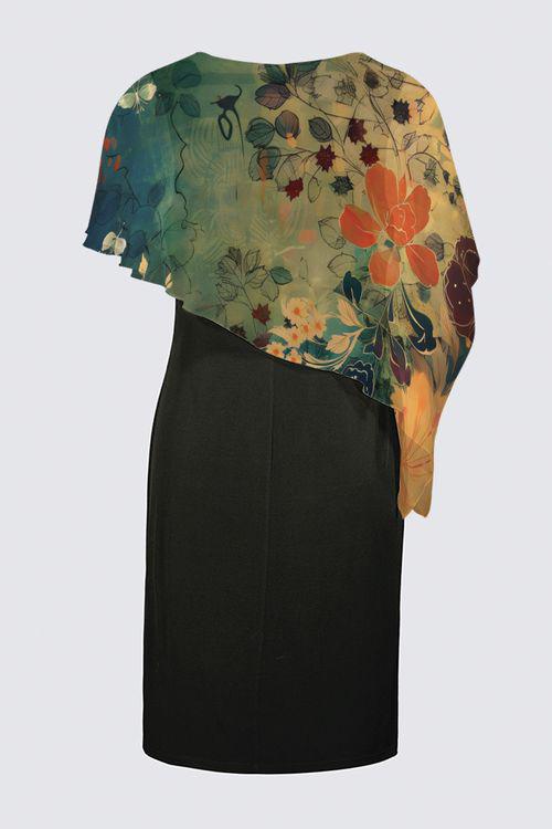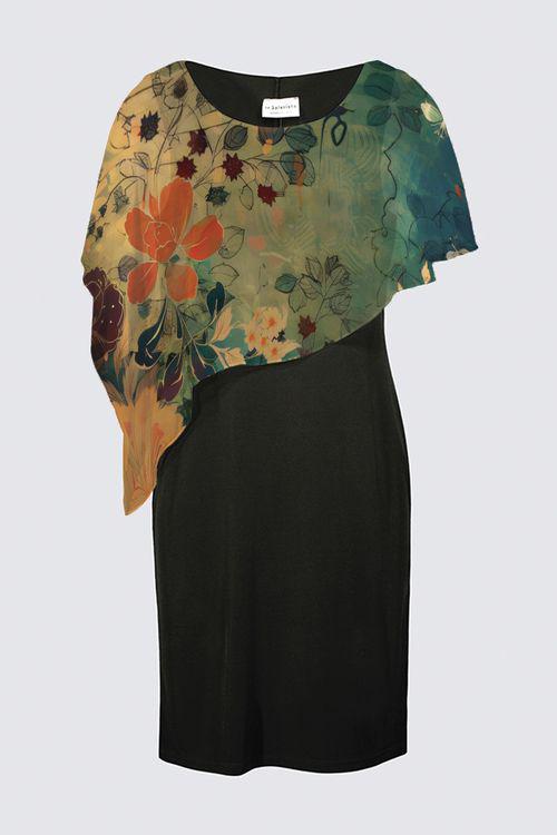The sleek black base dress, crafted from soft stretch ITY knit, gently contours the body with a smooth, flattering fit. Draped over it, a sheer asymmetrical layer of printed mesh flows effortlessly across the shoulders — revealing just enough while adding dimension, softness, and intrigue.