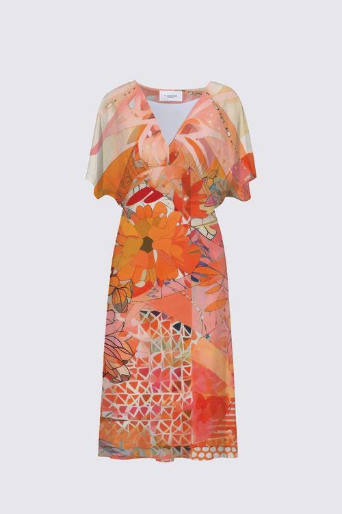The artwork is a vibrant blend of florals and abstract textures in sunlit tones of orange, coral, and peach — creating a look that feels fresh, uplifting, and full of life.