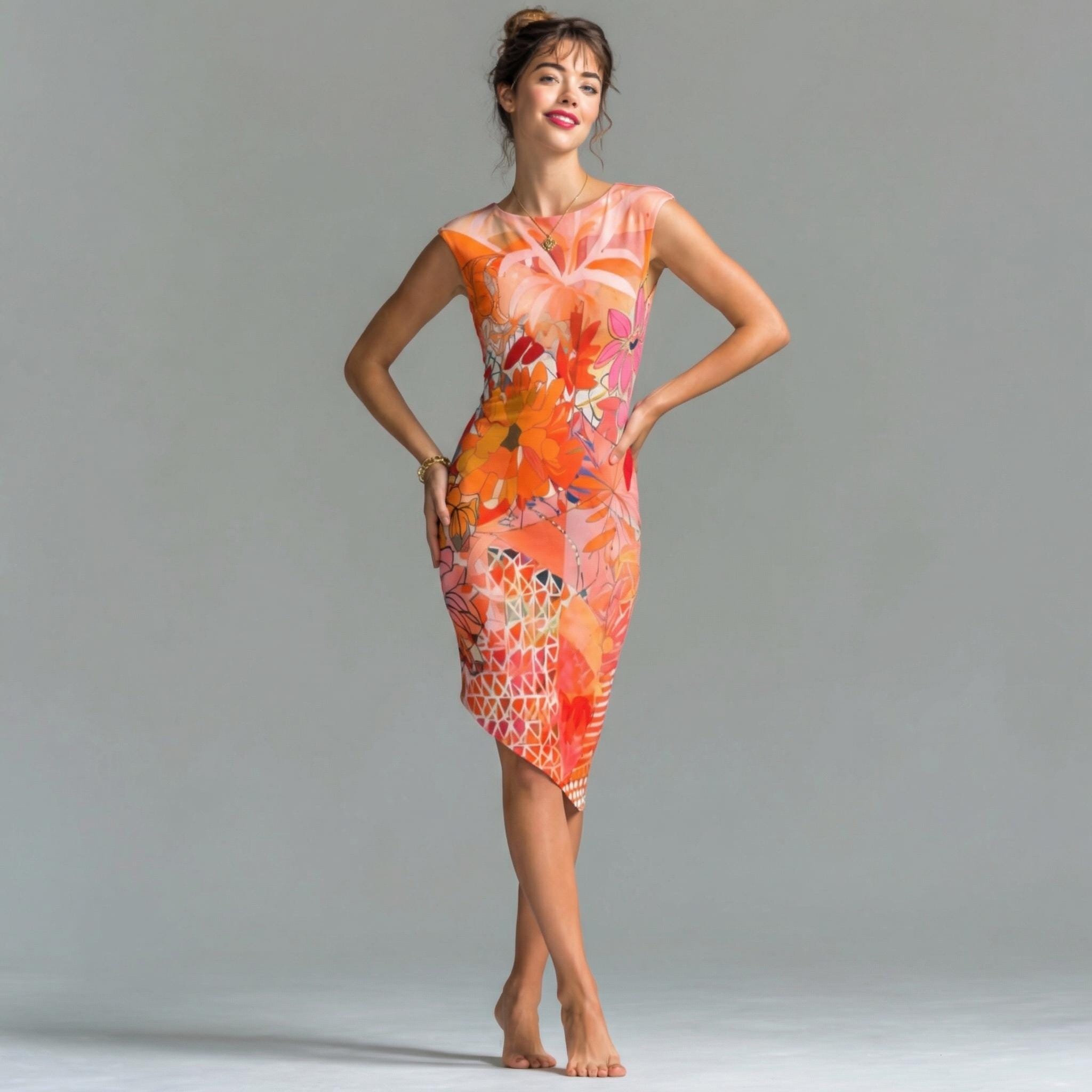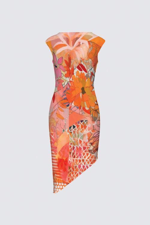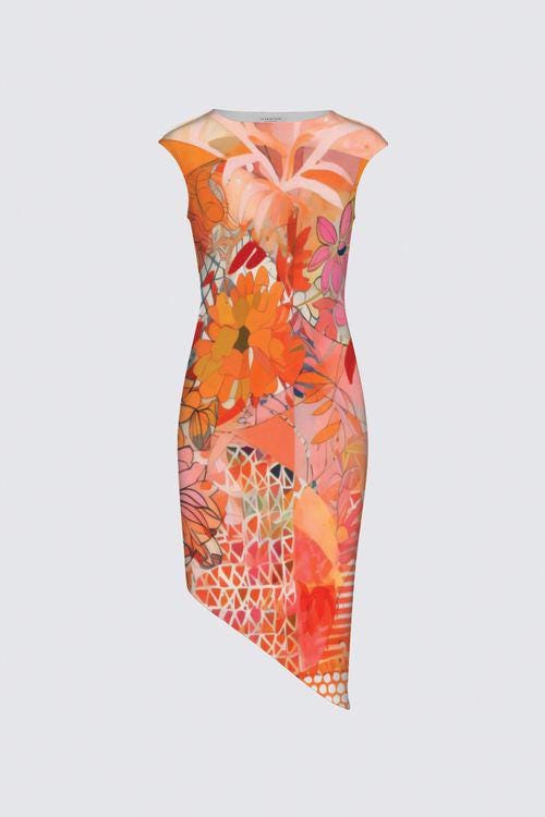 The artwork blends vibrant florals with abstract geometric textures in radiant shades of orange, coral, peach, and warm pink — creating a look that feels both artistic and fashion-forward.