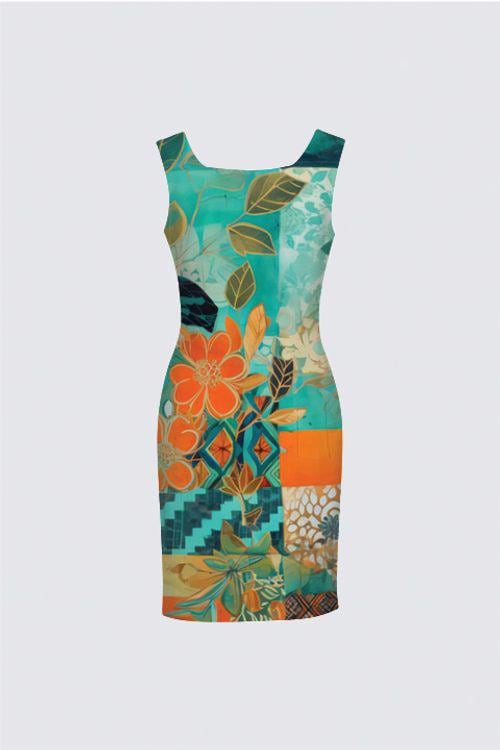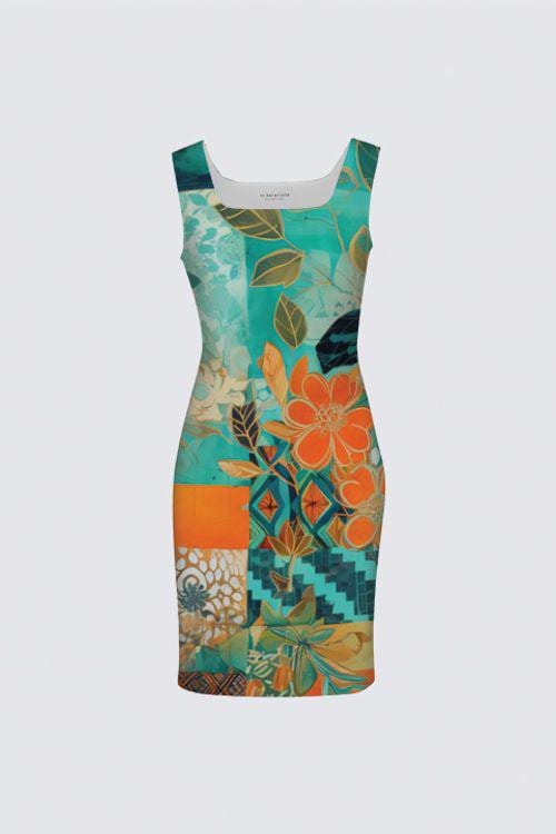 The artwork — Botanical Mosaic in Motion — brings together layered teal, turquoise, and aqua tones with striking orange accents and intricate botanical details. The composition feels curated, like a wearable piece of modern art.
