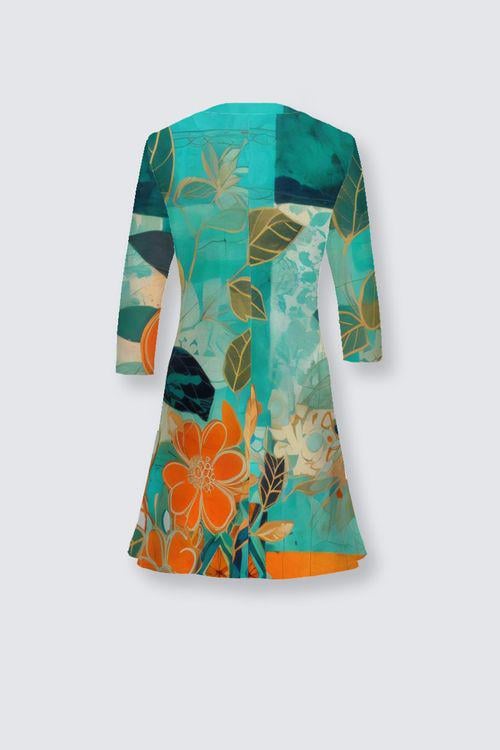 The artwork, Botanical Mosaic in Motion, shines in this silhouette — with teal and turquoise tones creating a calming base, while vibrant orange florals and geometric elements add energy and visual interest.