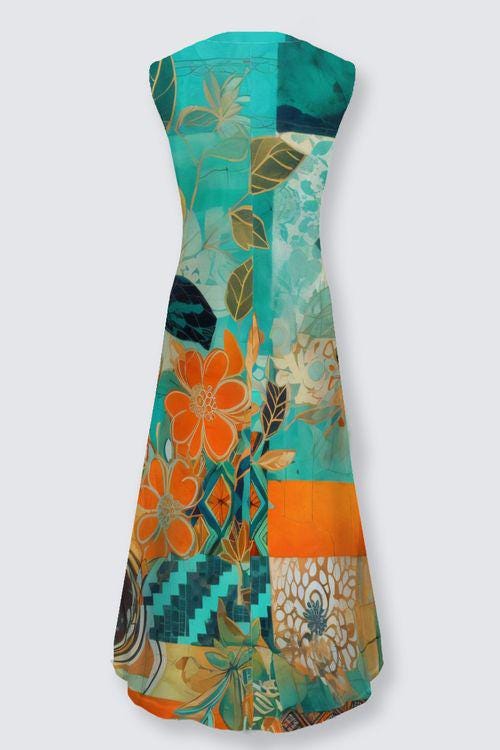 The artwork Botanical Mosaic in Motion brings this silhouette to life — with calming teal tones layered with vibrant orange florals and geometric accents, creating a harmonious balance of energy and elegance.